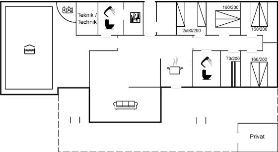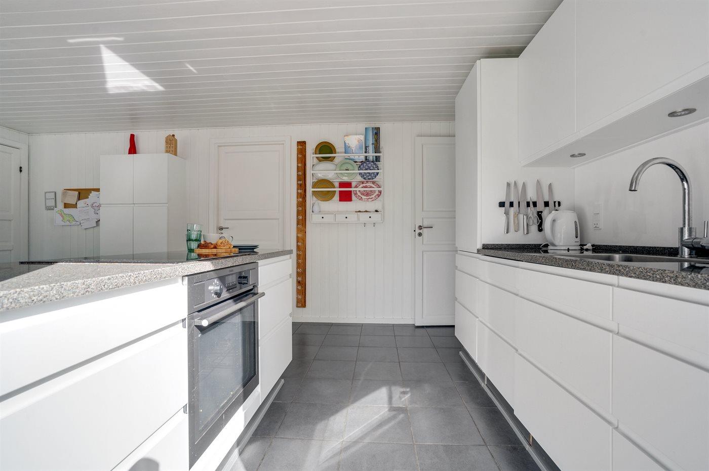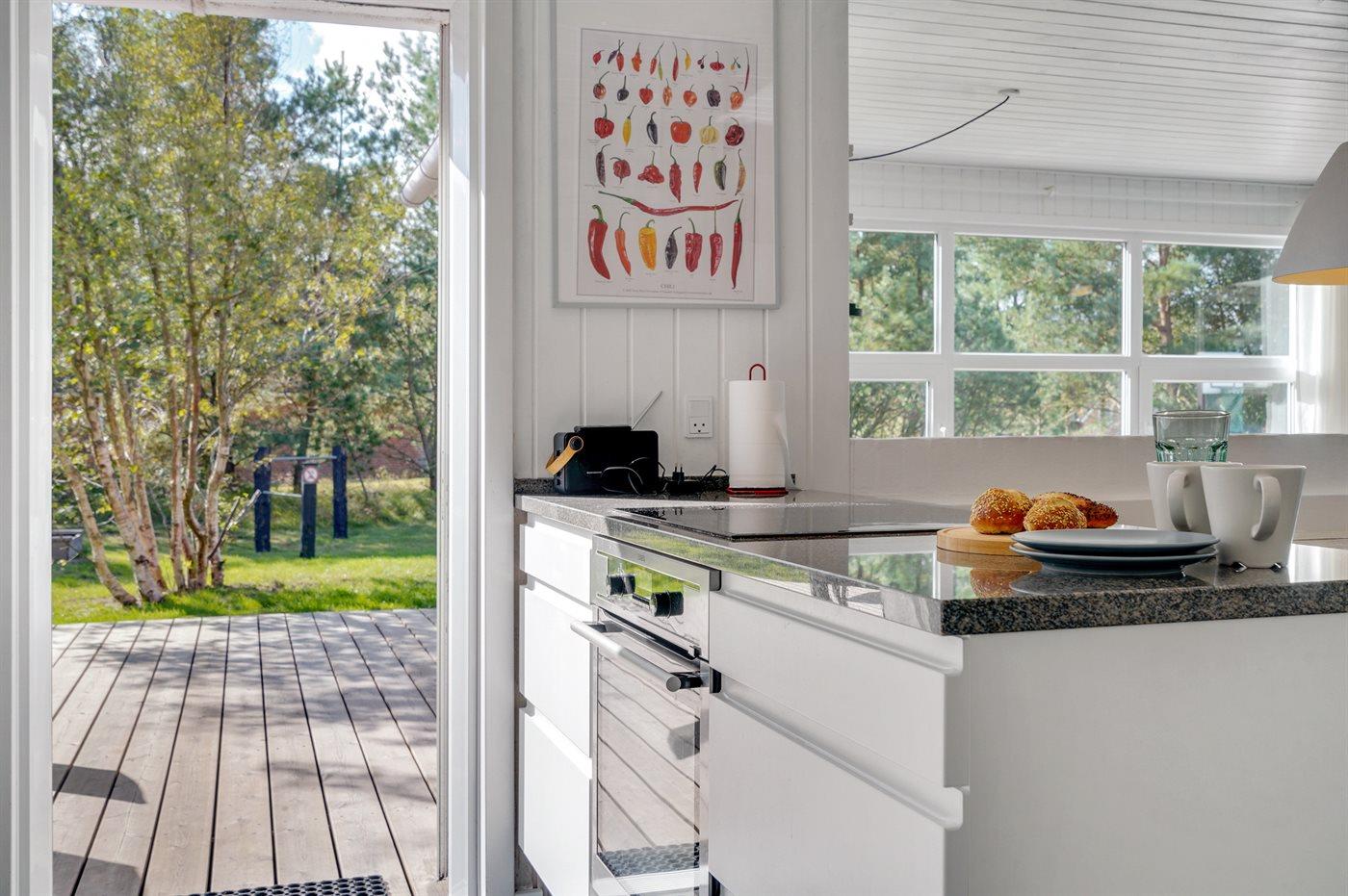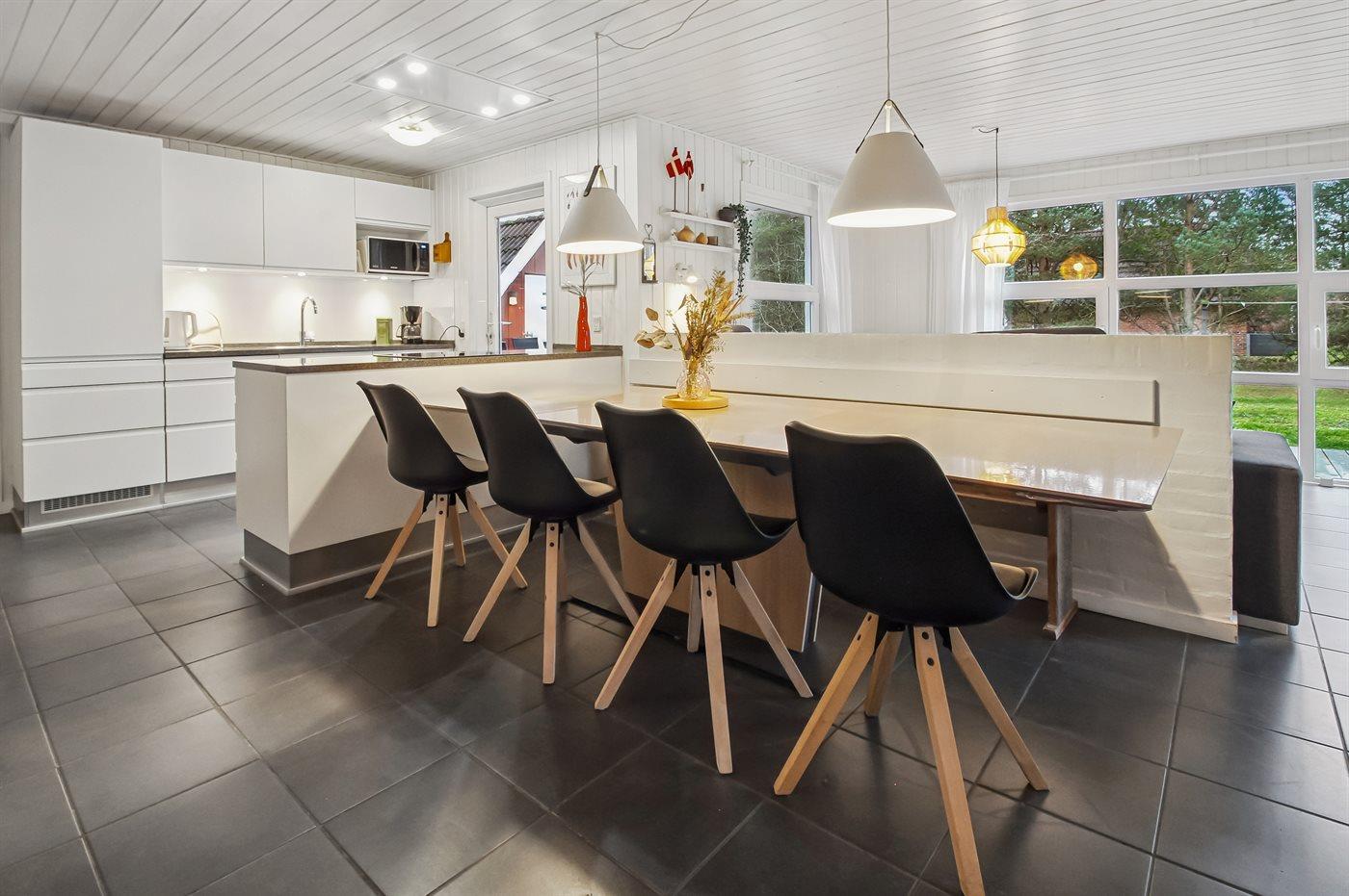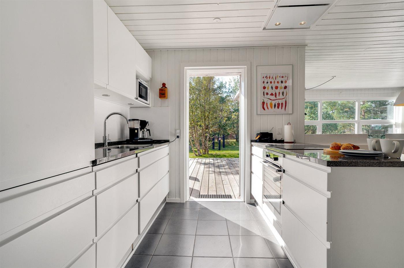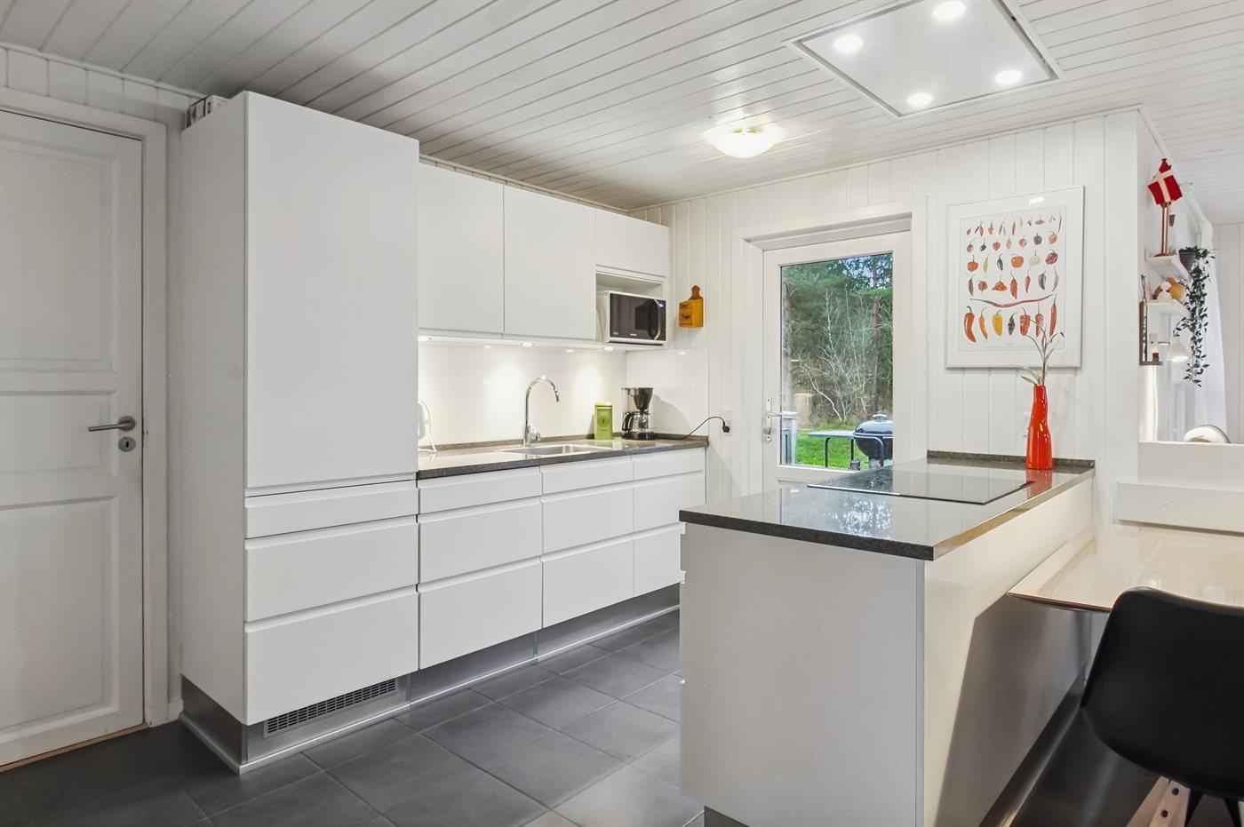 Køkkenet er udstyret med 1 køleskab. Der er 4 elkogeplader, bageovn, mikrobølgeovn samt opvaskemaskine.