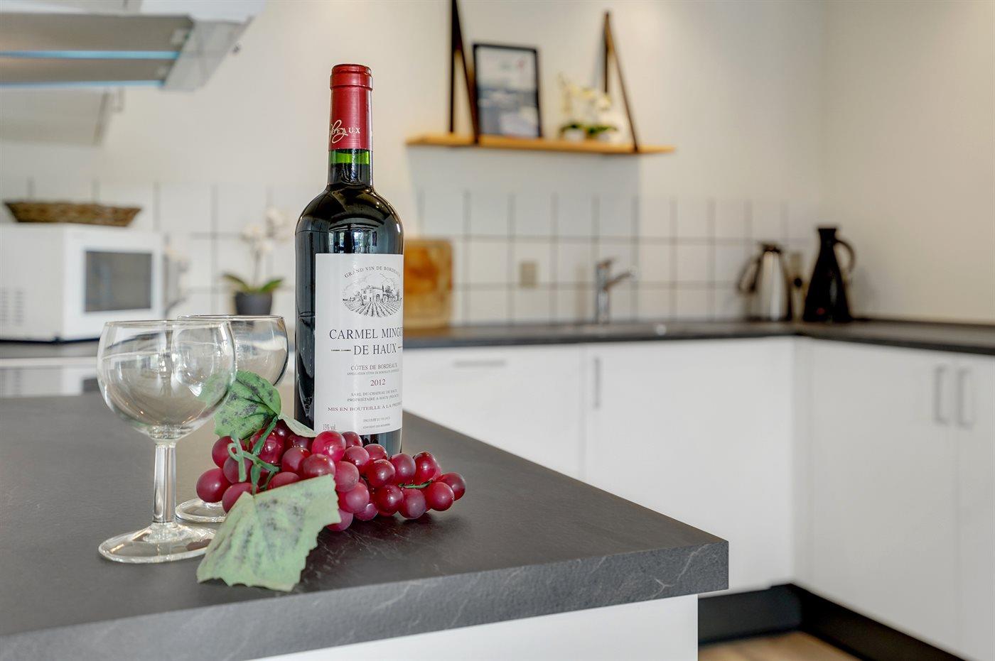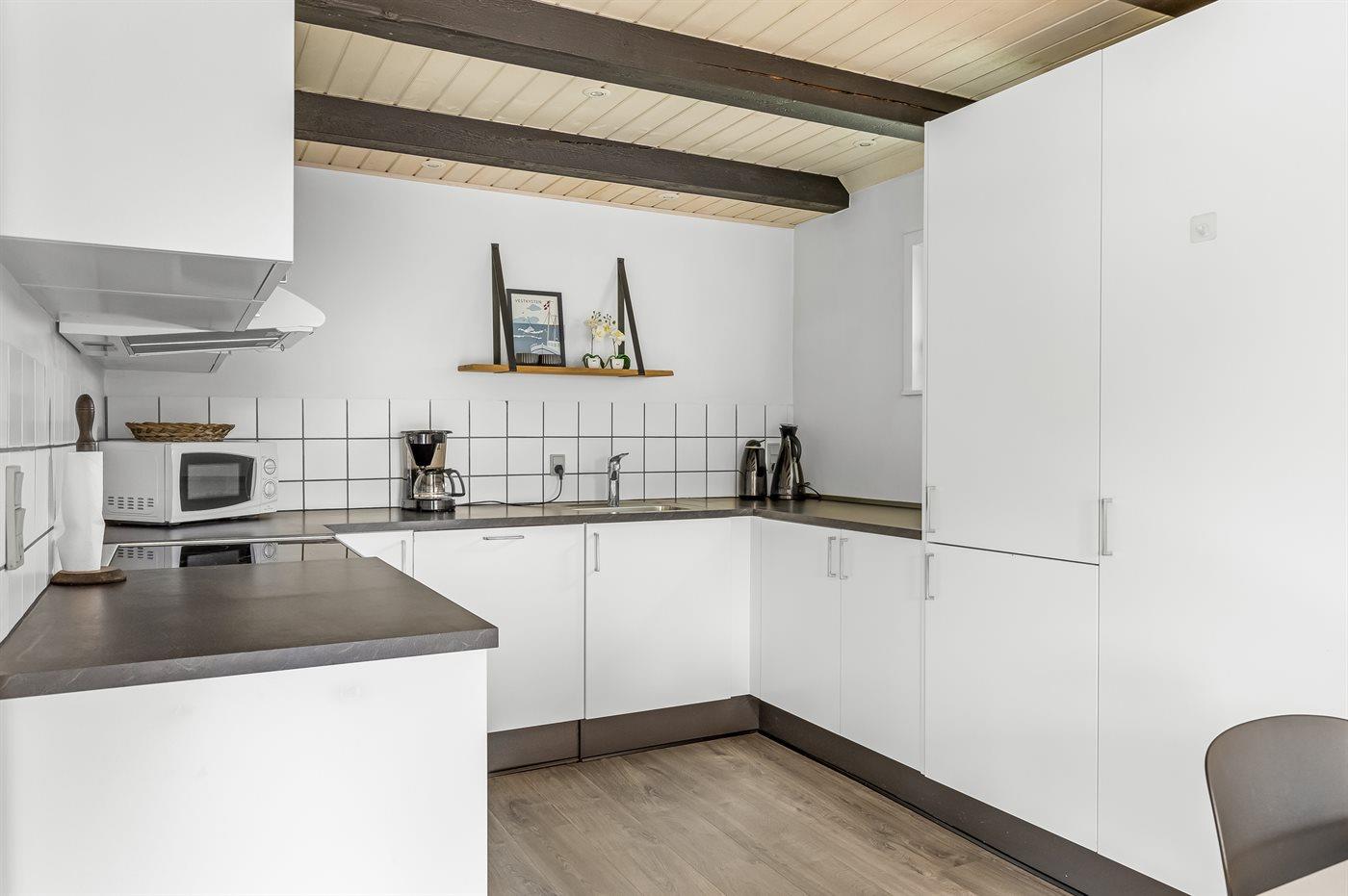 Køkkenet er udstyret med 1 køleskab. Der er 4 keramiske kogeplader, varmluftovn, mikrobølgeovn samt opvaskemaskine.