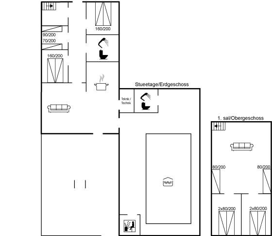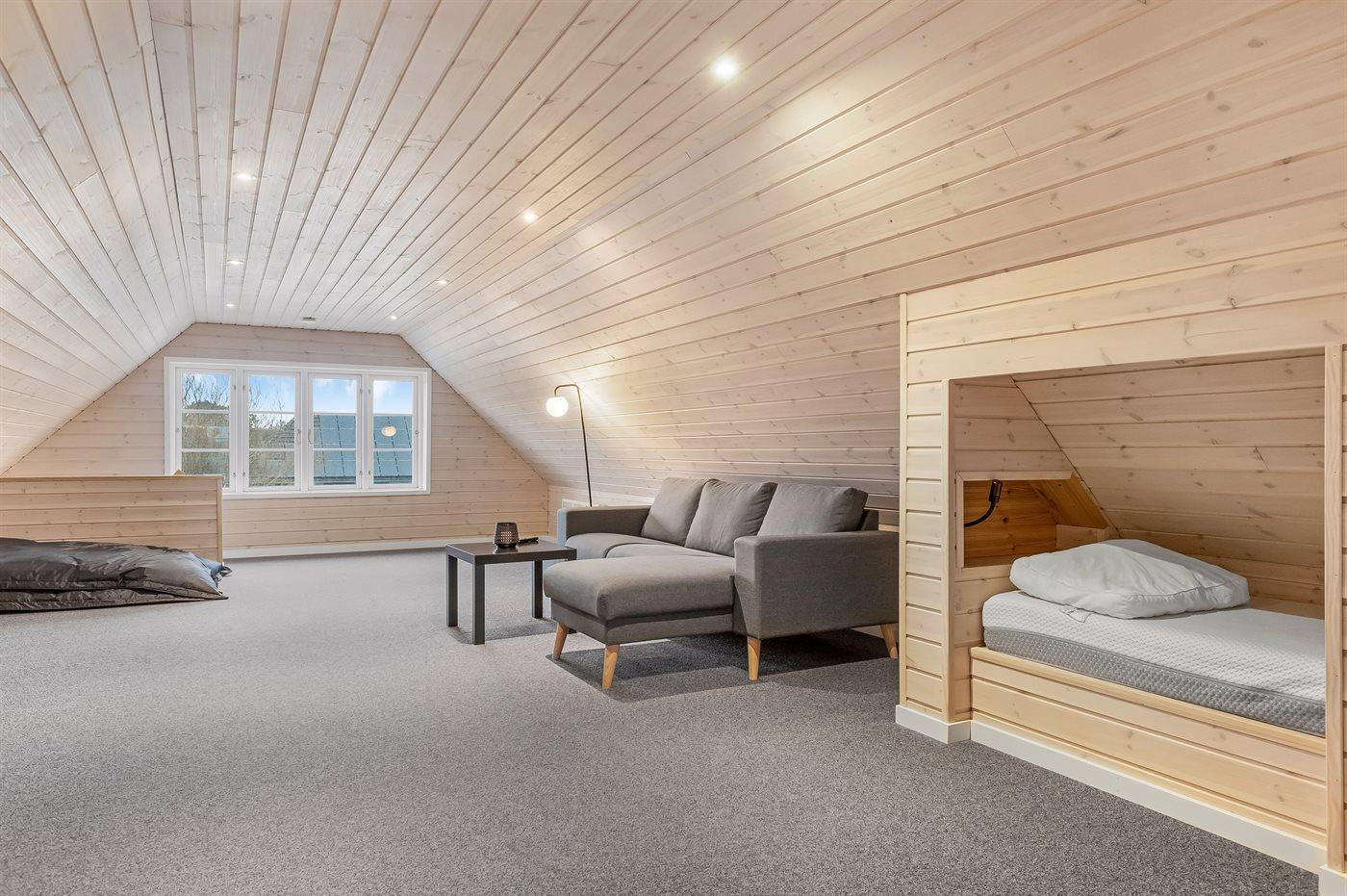Huset er indrettet med 2 rummelige opholdsstuer, hvoraf den ene befinder sig på 1. sal, hvor I også finder 2 af de i alt 5 soveværelser samt 2 sovepladser i hver sin alkove.