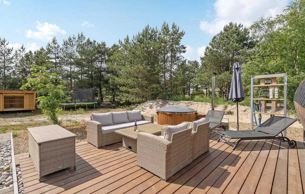Glæd jer til at tilbringe mange skønne timer på terrassen. Her kan I blandt andet slappe af og komme helt ned i gear i den udendørs sauna, eller hvad med at tage en kold drink med i vildmarksbadet efter en aktiv feriedag? På terrassen er der loungemøbler, havemøbler og grill til jeres rådighed, så I let kan arrangere hyggelige grillmiddage og nyde de lune sommeraftener. I haven finder I også både shelter og en trampolin, så familiens yngste vil helt sikkert også være underholdt. På grunden er der gode muligheder for at dyrke privatlivets fred, men der er dog heller ikke langt til naboer, hvis I har lyst til at møde andre feriegæster.