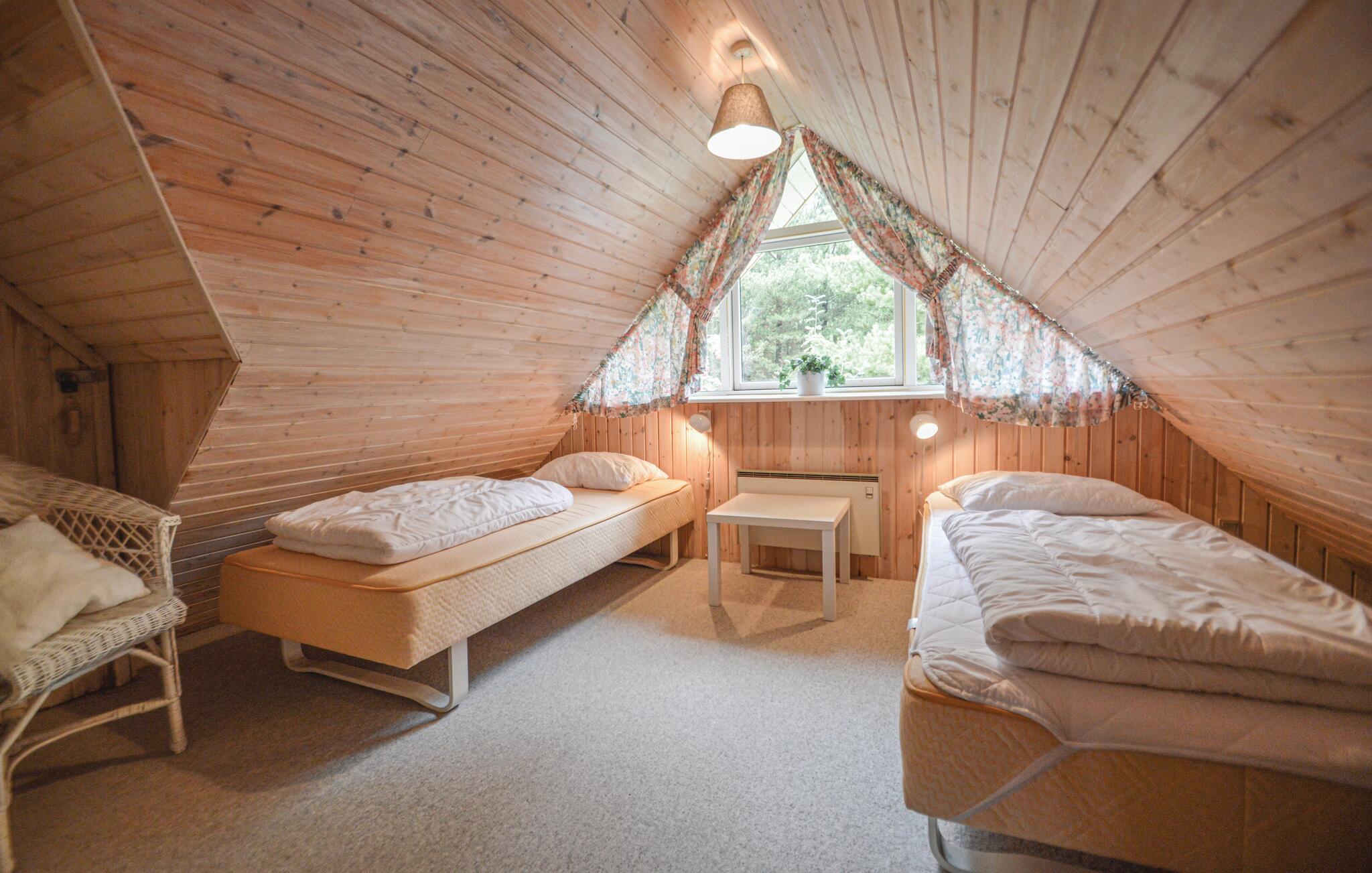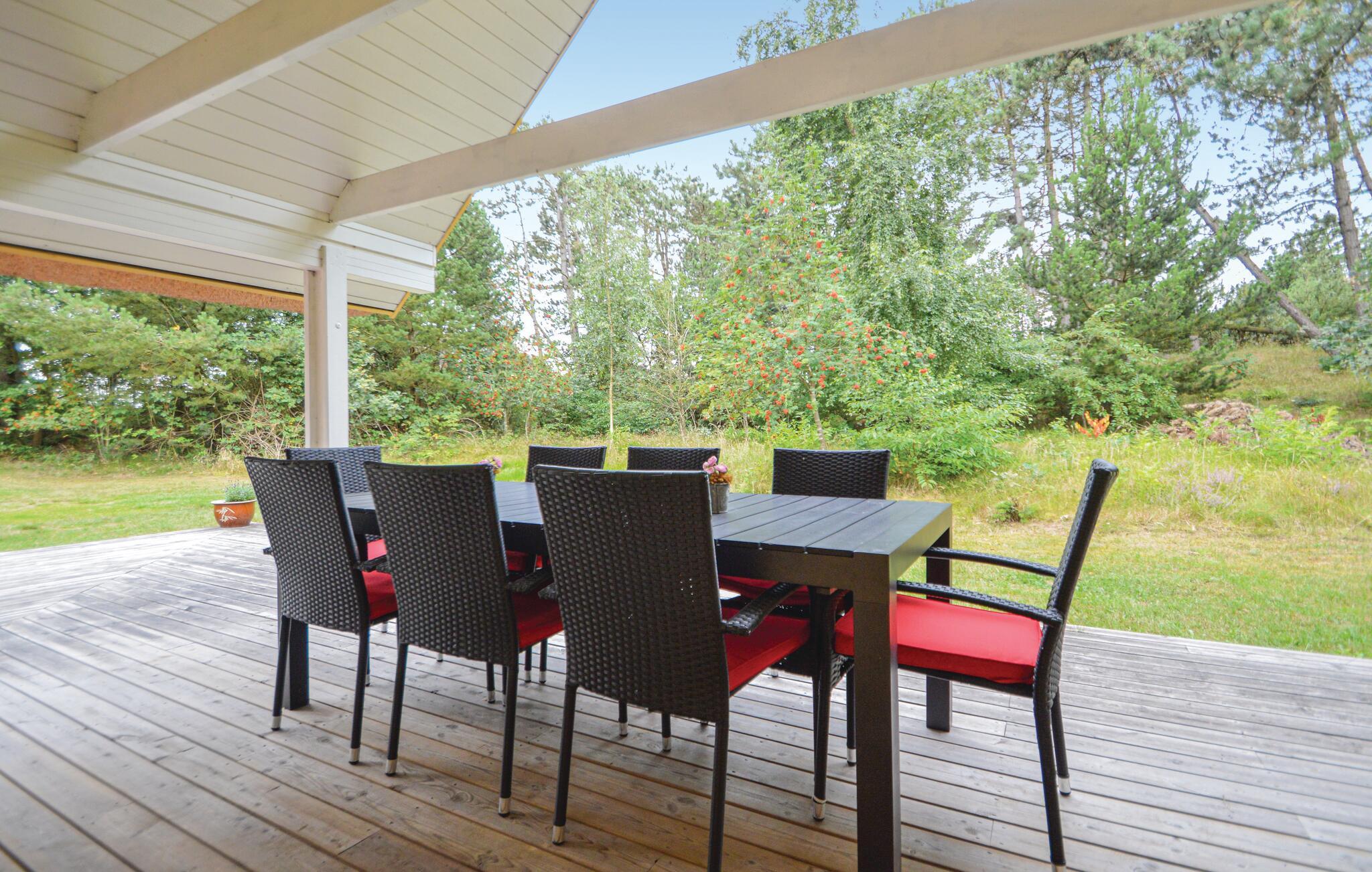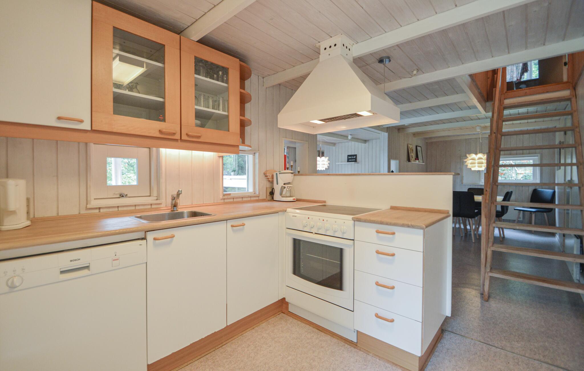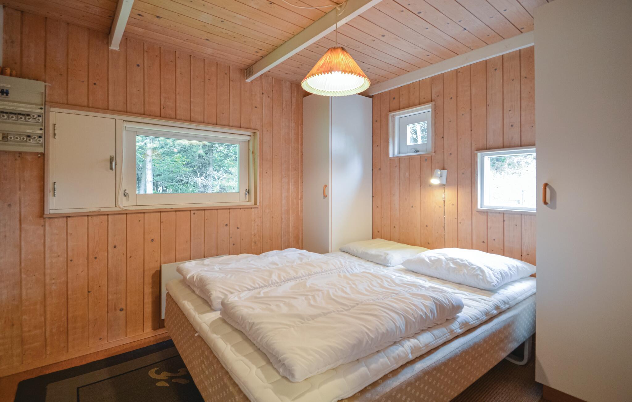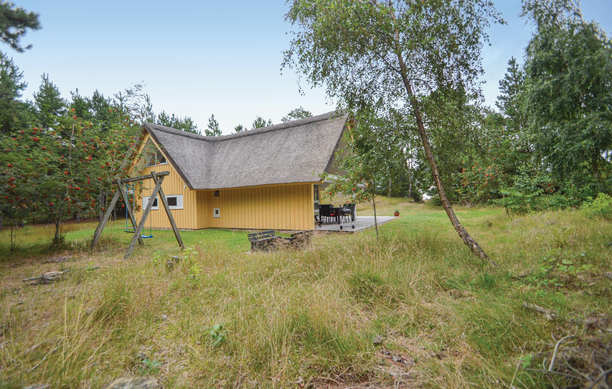 Pænt, stråtækt feriehus der ligger på en skøn, kuperet naturgrund, der er omkranset af træer, så I både har sol og skygge i haven. Her hører I kun naturens lyde, og får måske besøg af et rådyr. På en kølig dag er det hyggeligt at sidde indendørs med ild i brændeovnen og en god bog i hånden. Køkkenet er centralt placeret i huset, og fra vinkelstuen er der direkte adgang til den overdækkede terrasse. Husets soveværelse i stueplan er udstyret med en dobbeltseng, og de to soveværelser på førstesalen er udstyret med hver to enkeltsenge og har god gulvplads.