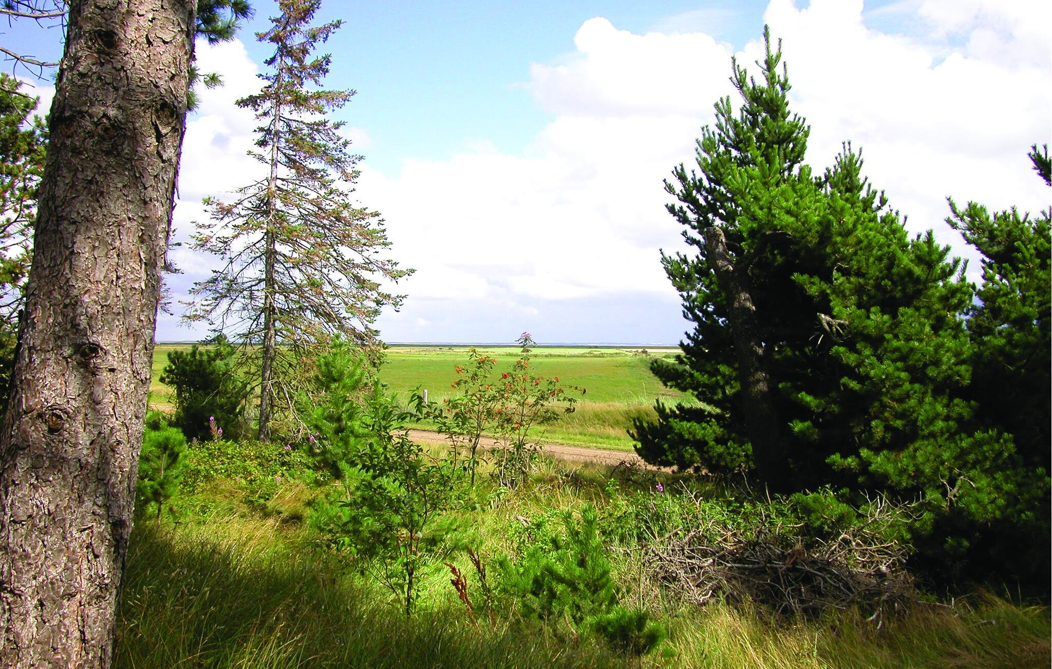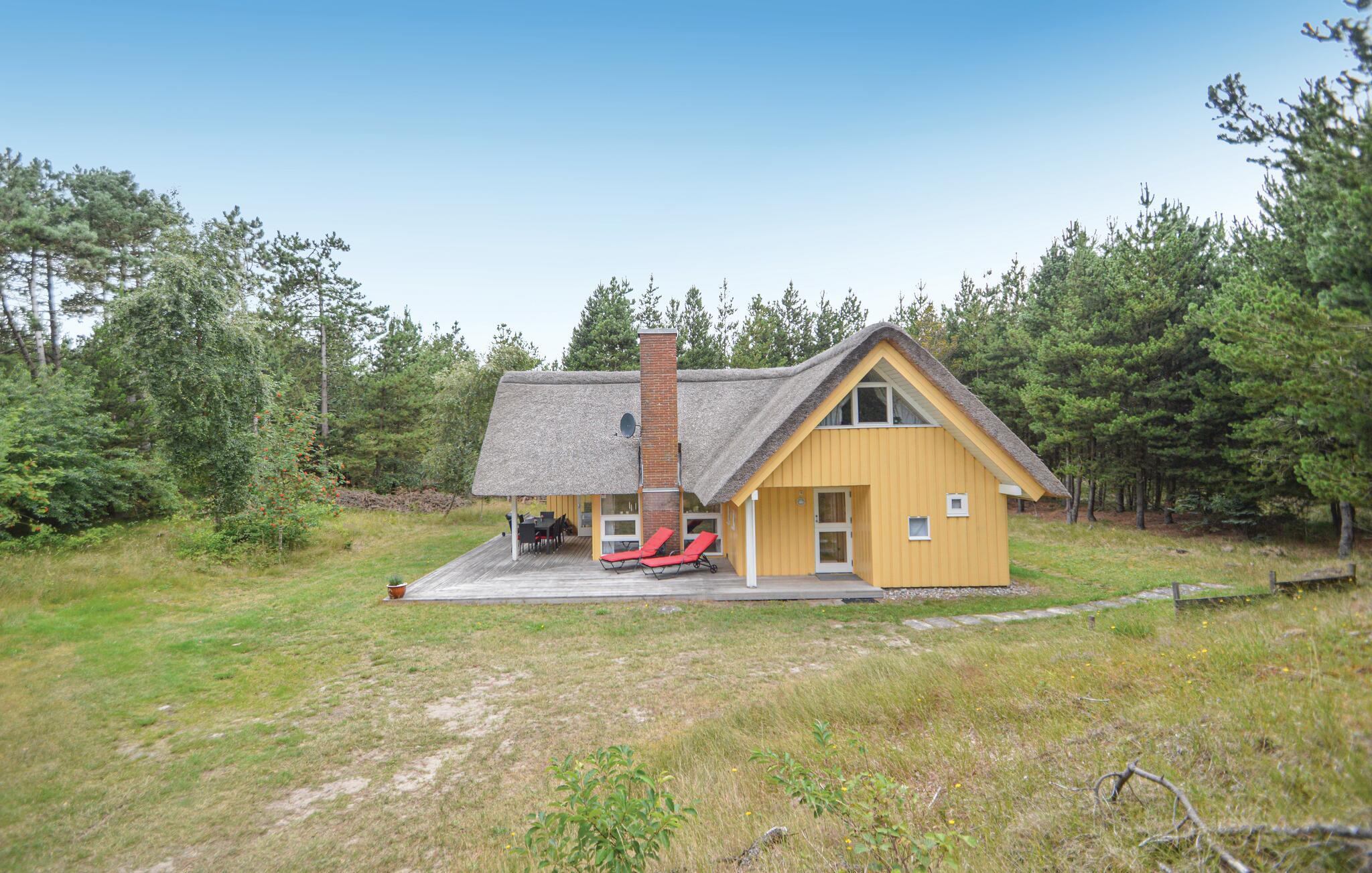 Hyggeligt stråtækt feriehus på Rømø med naturgrund, brændeovn, overdækket terrasse og adgang til bred strand.
