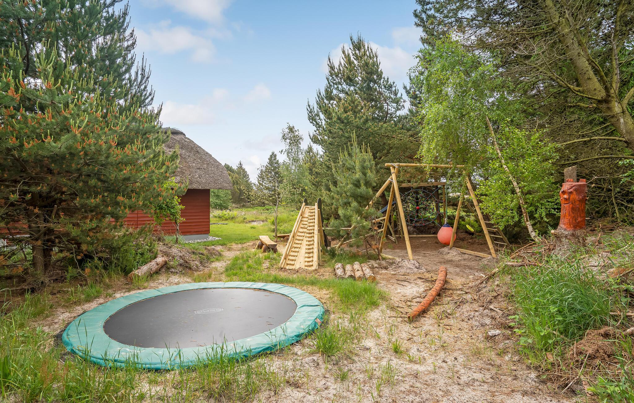 Dejligt sommerhus på en meget stor, kuperet naturgrund. Det er indrettet med en kombineret køkken- og stue, hvorfra der er adgang til en dejlig sydvendt terrasse, hvor I kan nyde solen det meste af dagen under åben himmel. På den store naturgrund er der placeret et dejlig shelter samt en hyggelig cylinderformet hytte med bord og bænke. Der er også mulighed for leg på trampolinen, gyngen og rutsjebanen. Husets anneks er lyst indrettet og indeholder 2 gode senge.