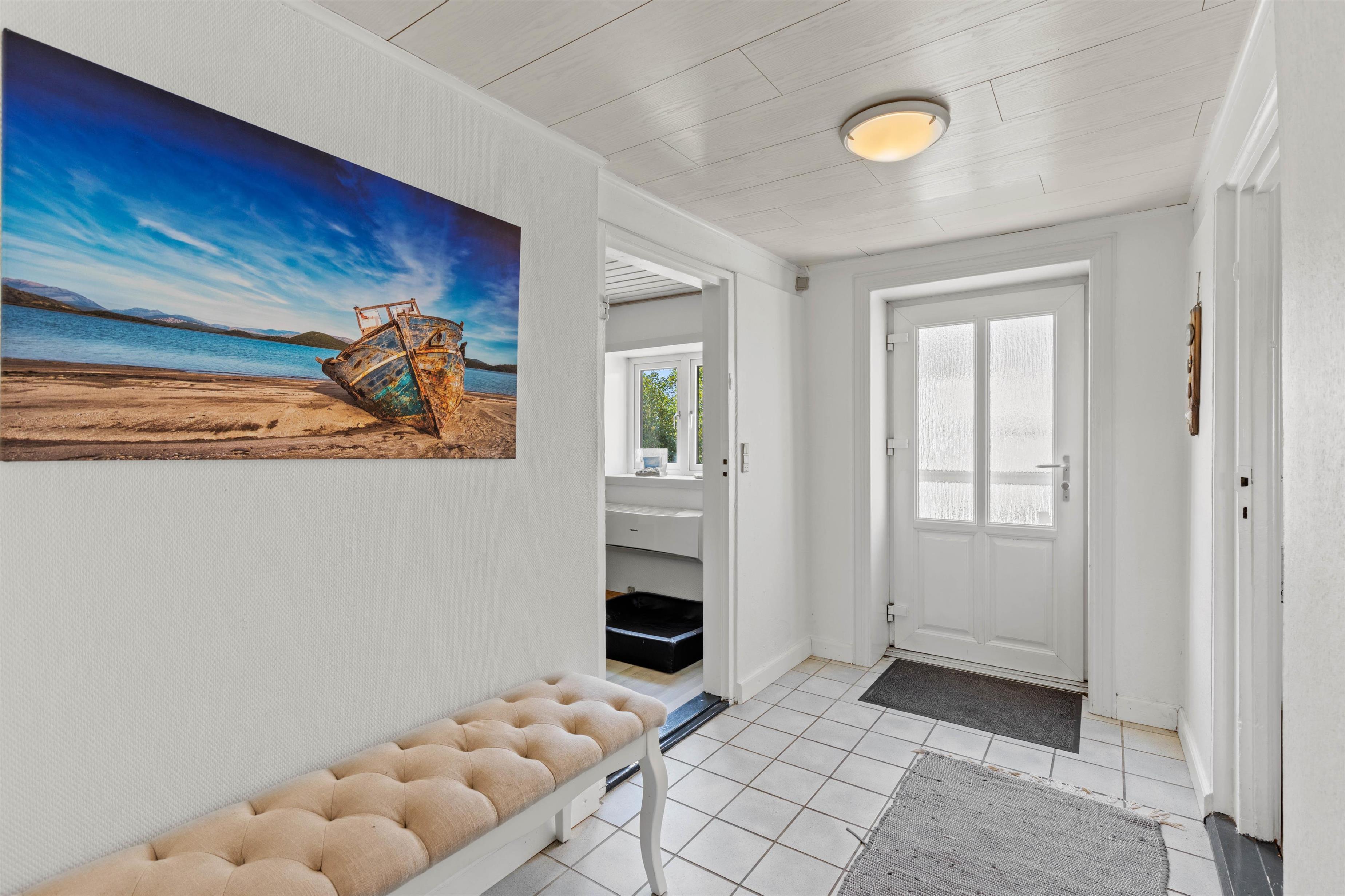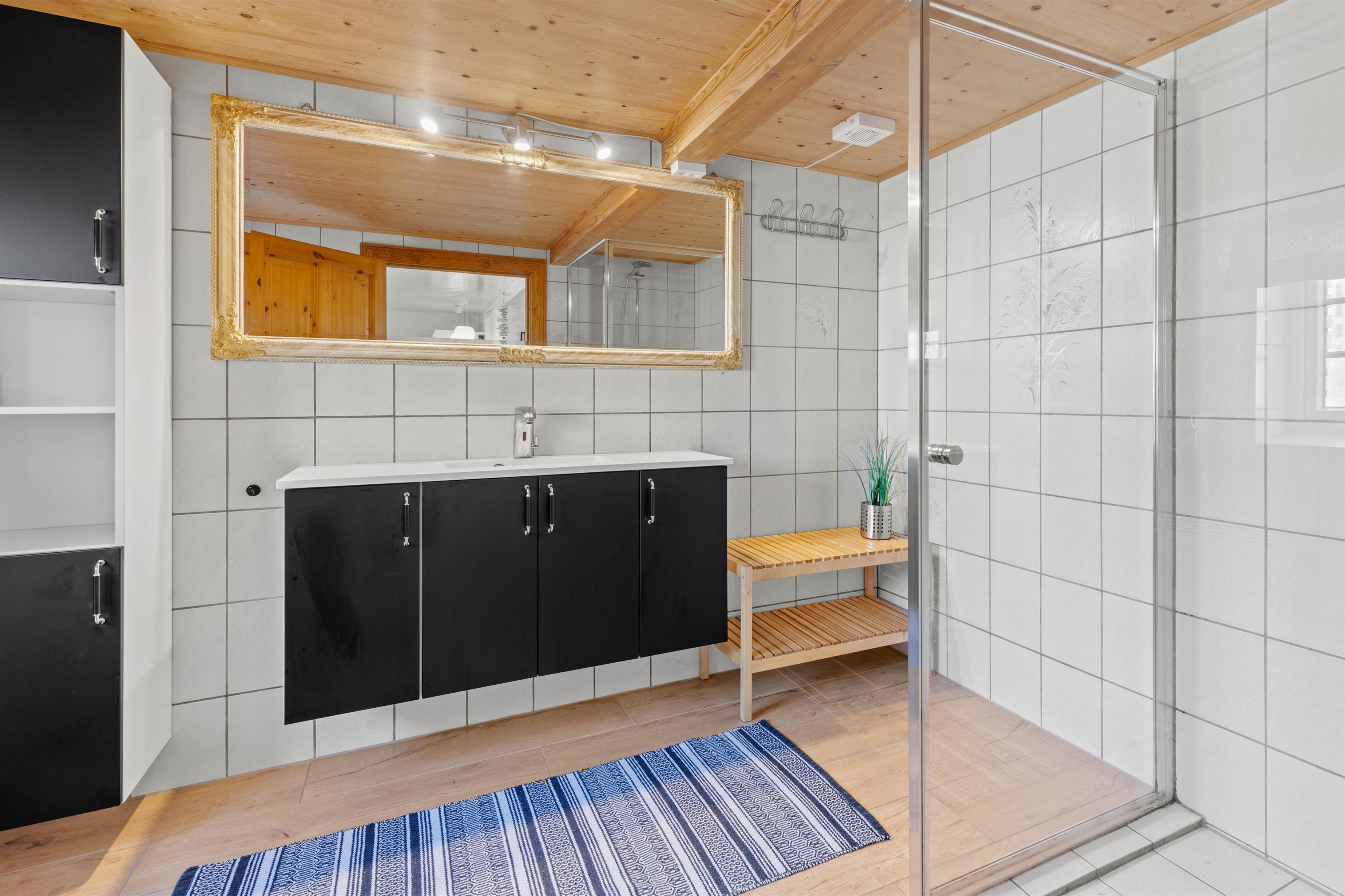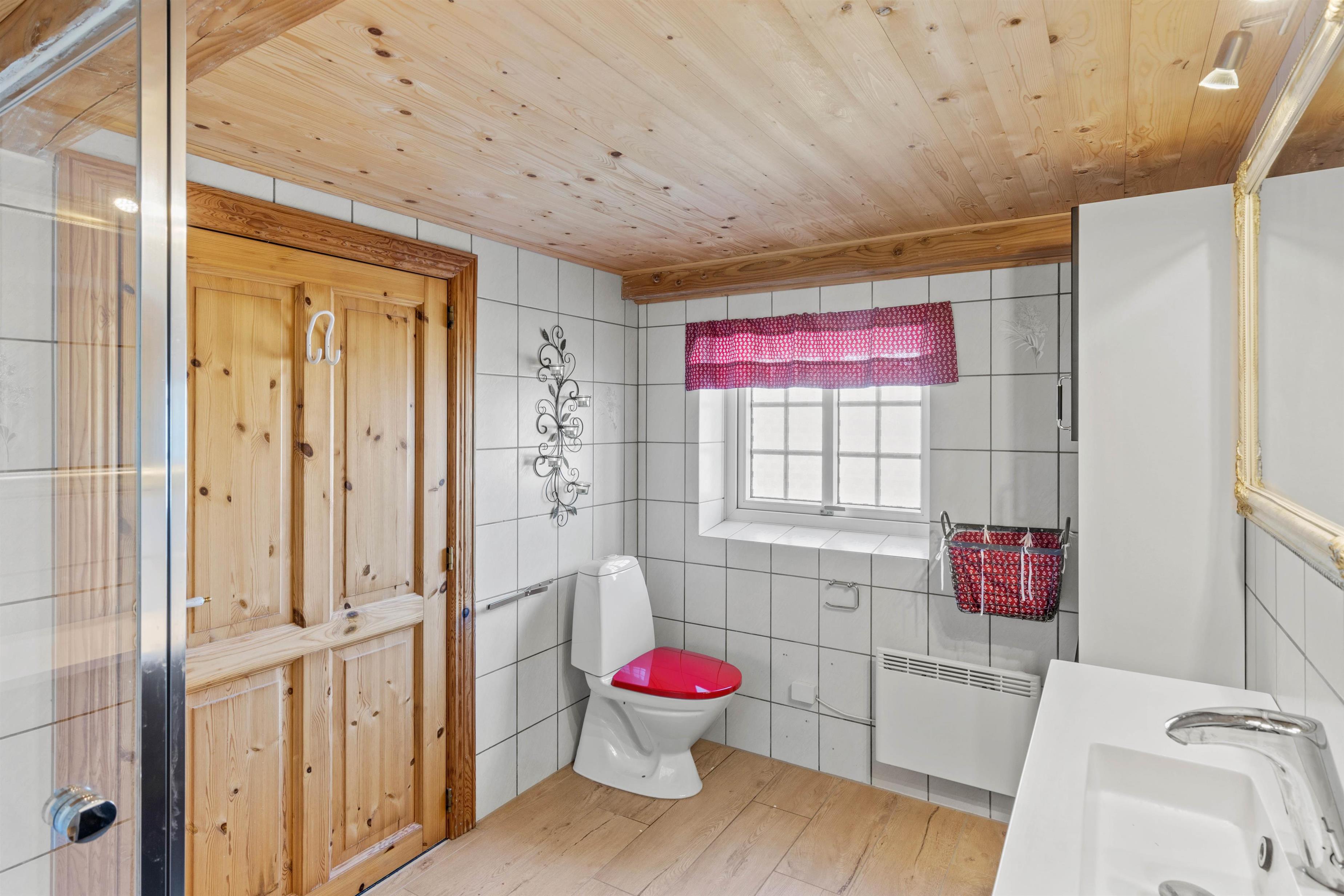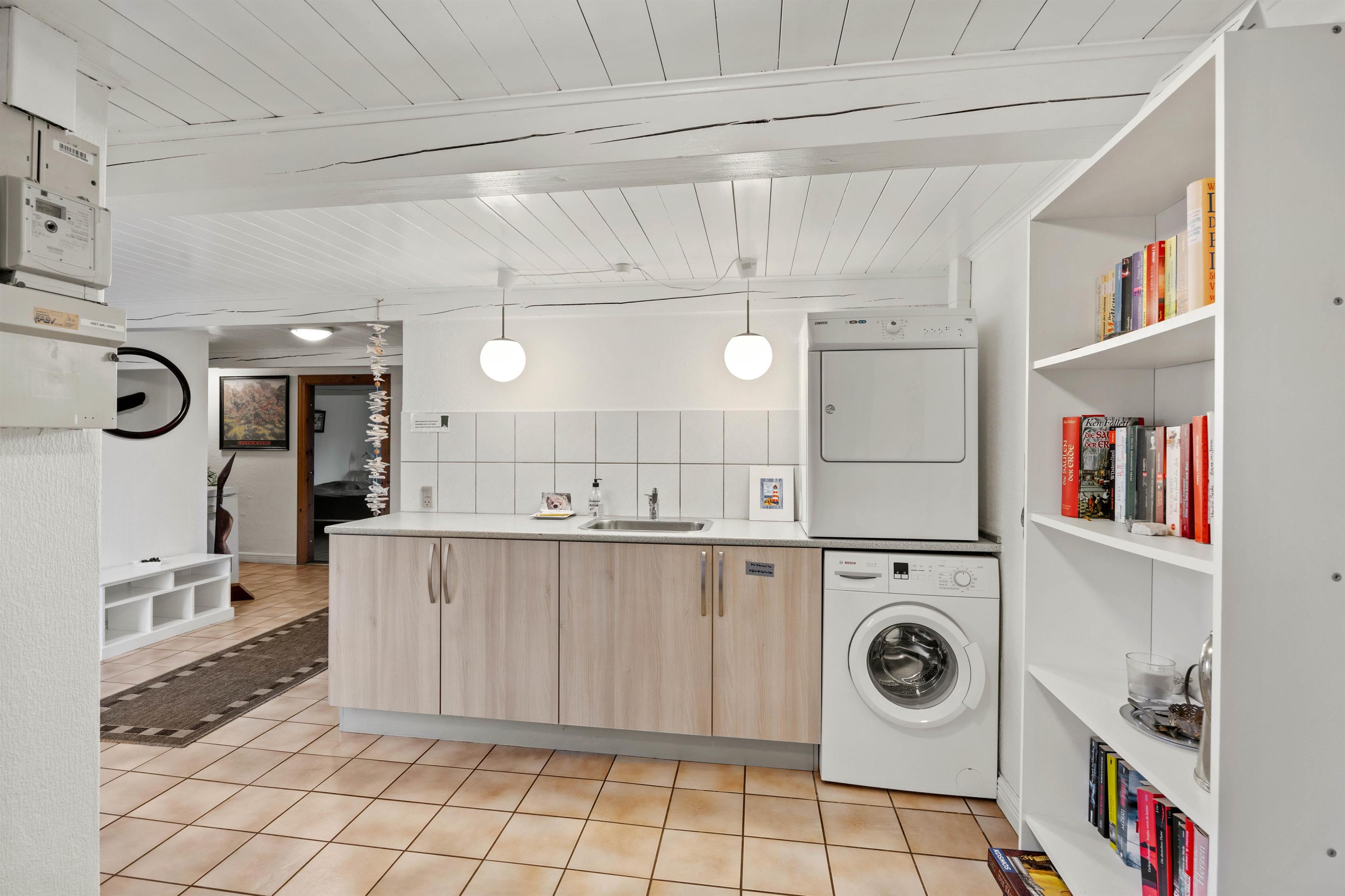Ferielejlighedens badeværelse er udstyret med gulvvarme, og I bryggerset finder I både vaskemaskine og tørretumbler.