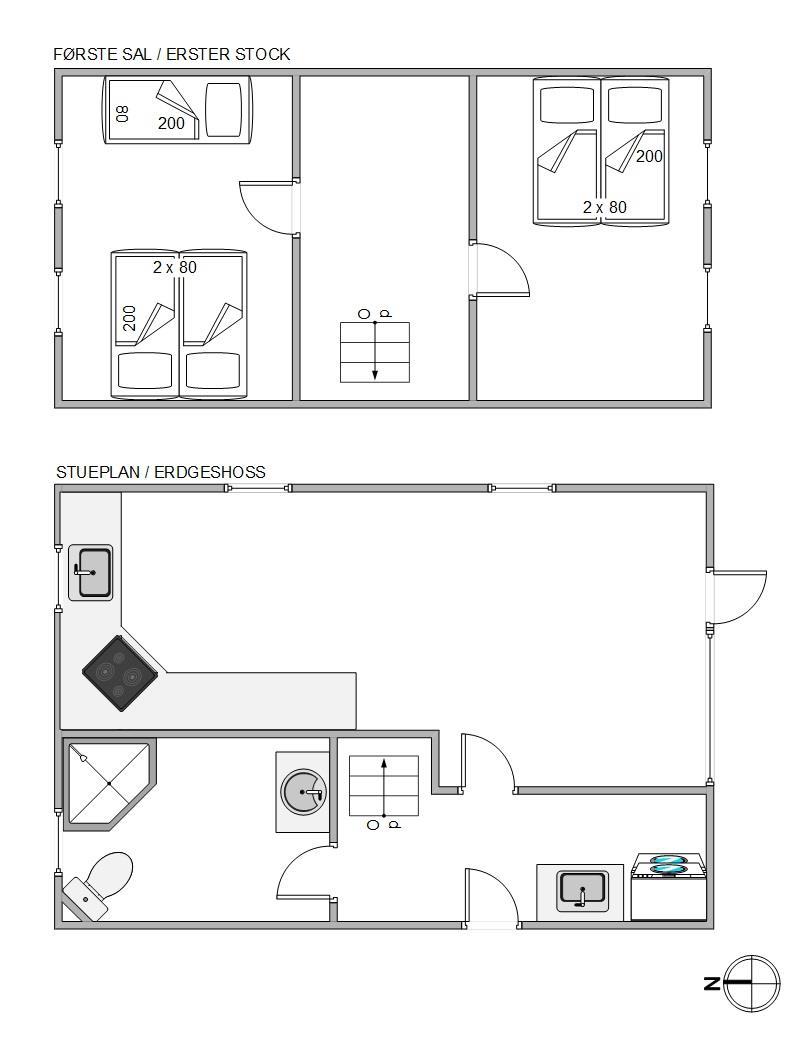 I alt har dette feriehus 80 m2, som er fordelt 2 etager. Køkken, badeværelse med gulvvarme samt opholdsområdet (gulvvarme) er i stueetagen. De 2 soveværelser ligger på øverste etage – trappen derop er lidt stejl, så den er ikke for mennesker med gangbesvær.