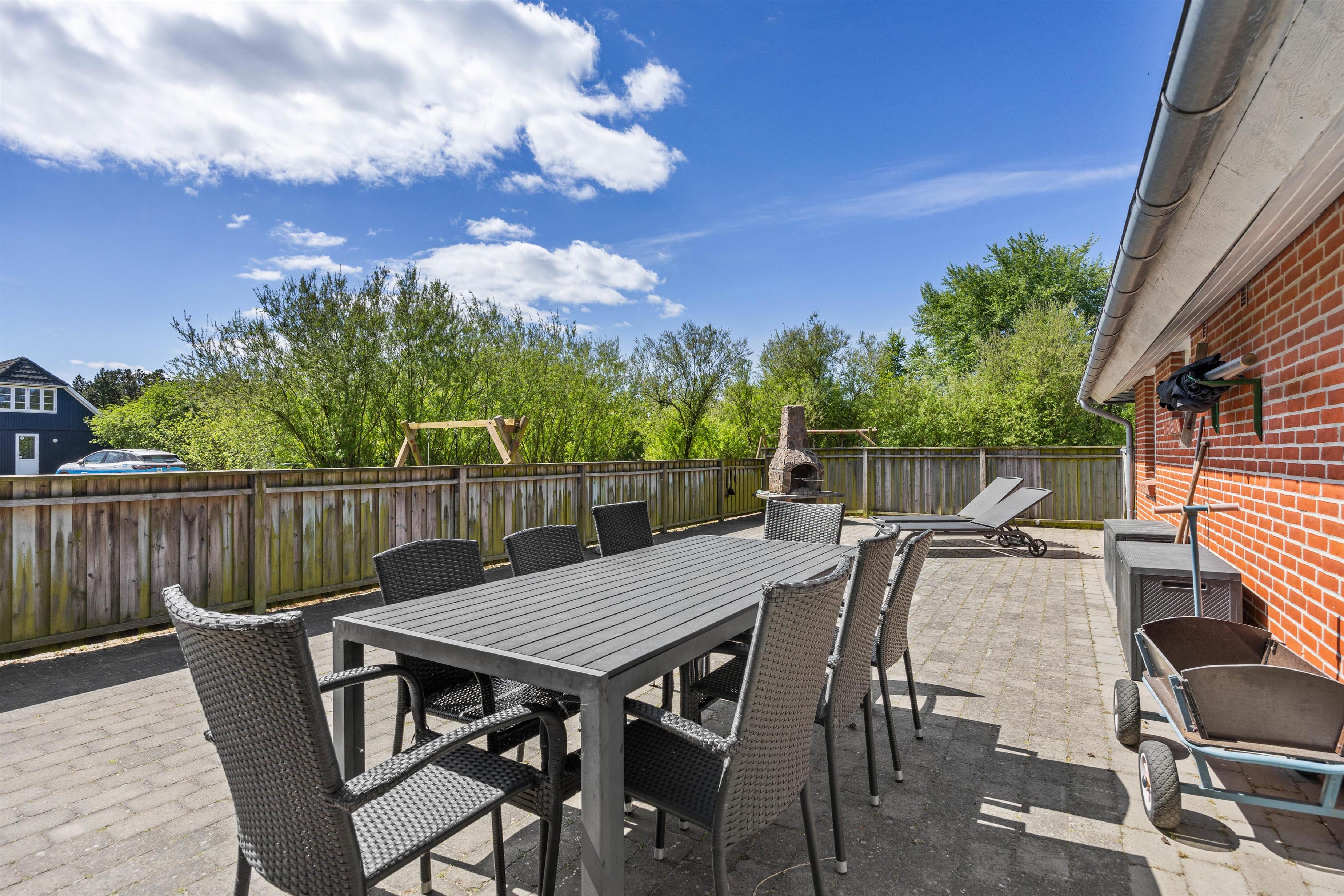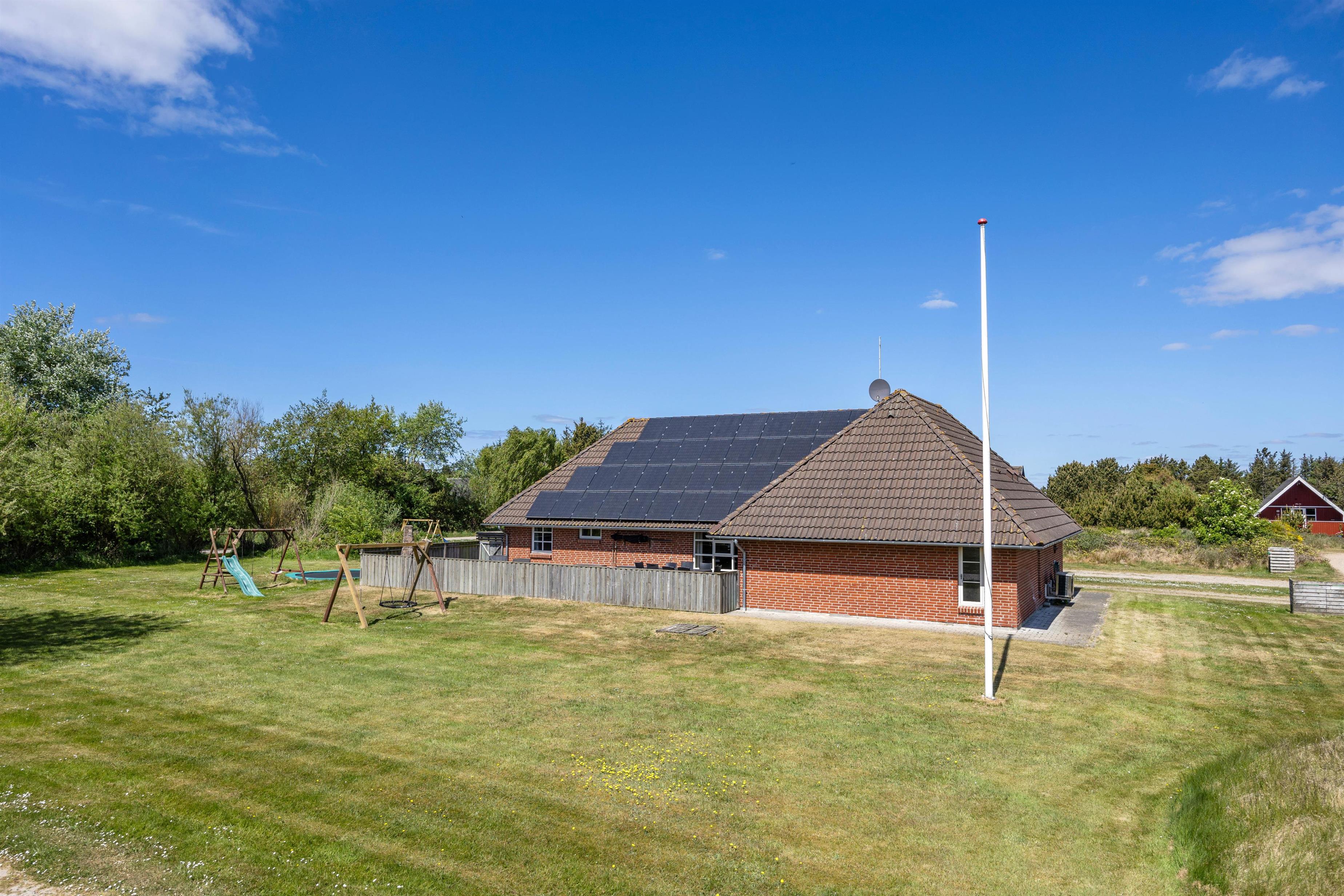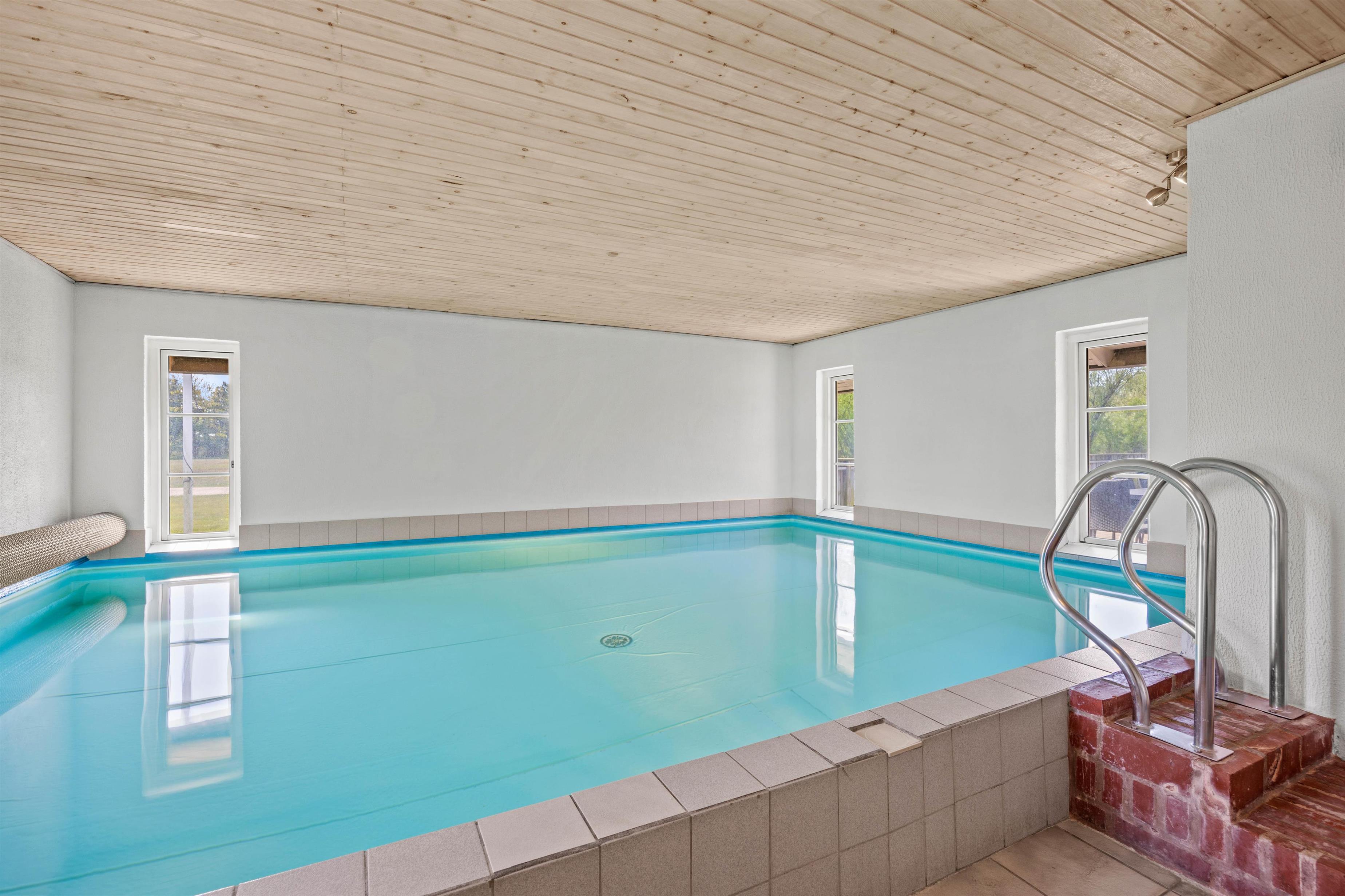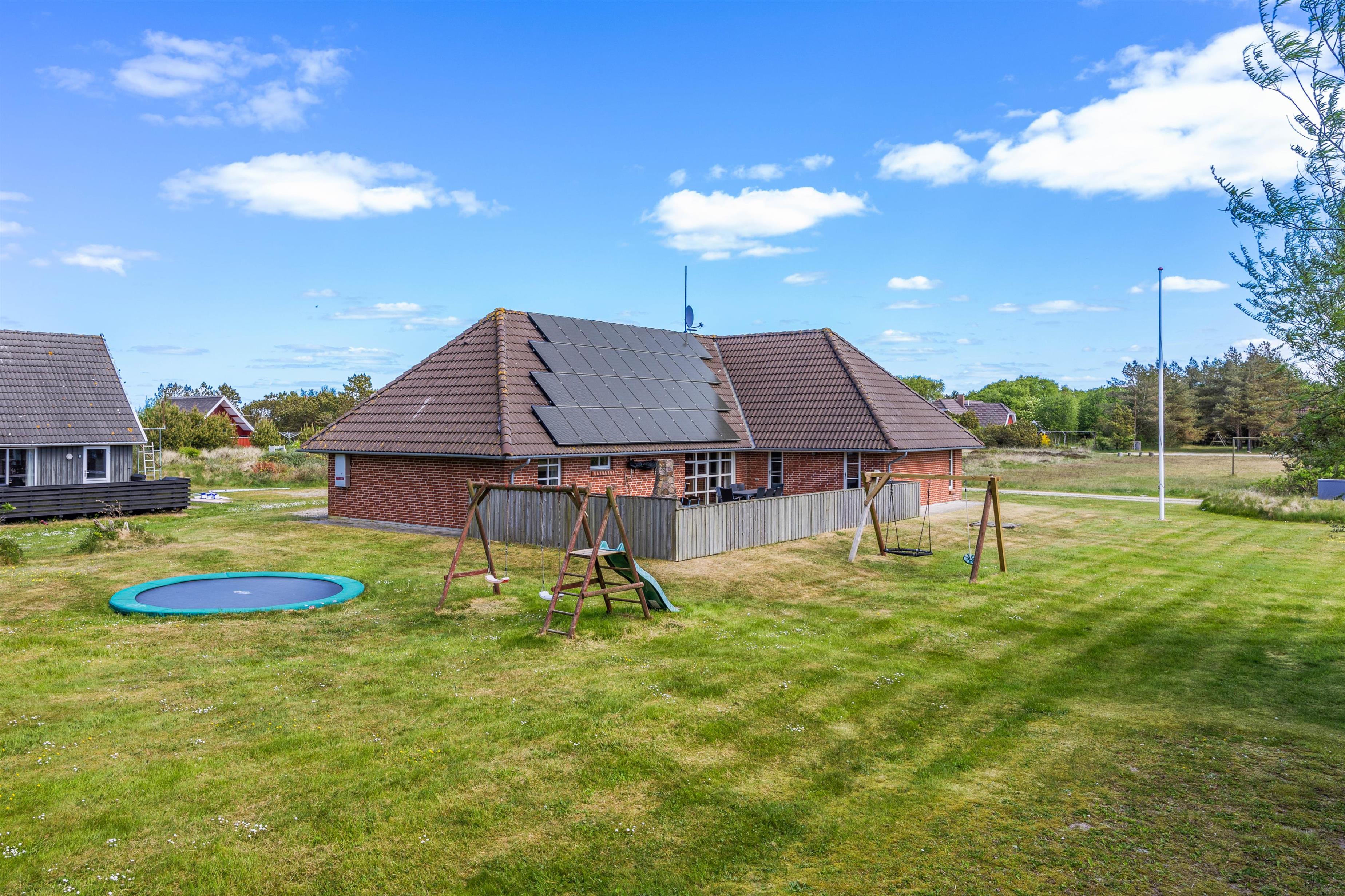 Sommerhusets 28 m² store swimmingpool er et absolut højdepunkt, der giver mulighed for badning året rundt. Derudover kan du lade hverdagens stress forsvinde i saunaen eller spabadet. Udenfor venter et paradis for børn med gynger, sandkasse og trampolin, mens du kan nyde en stille stund på den lukkede terrasse. Når aftenen falder på, indbyder grillen til hyggelige stunder med familie og venner under den åbne himmel.