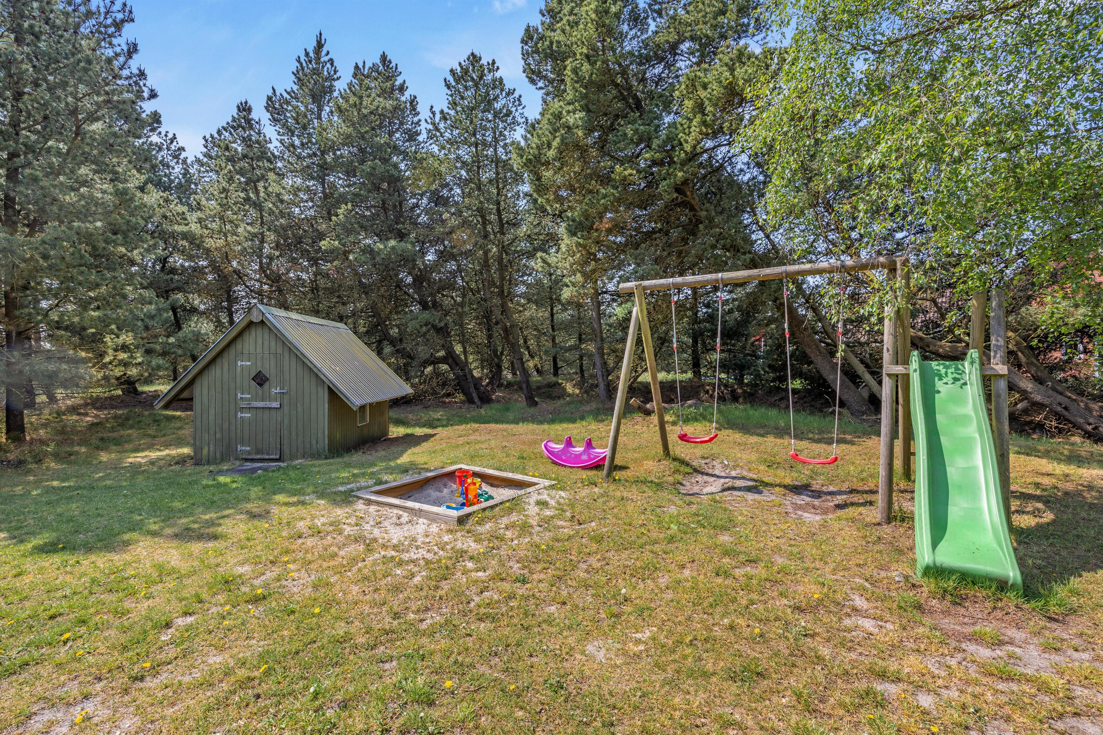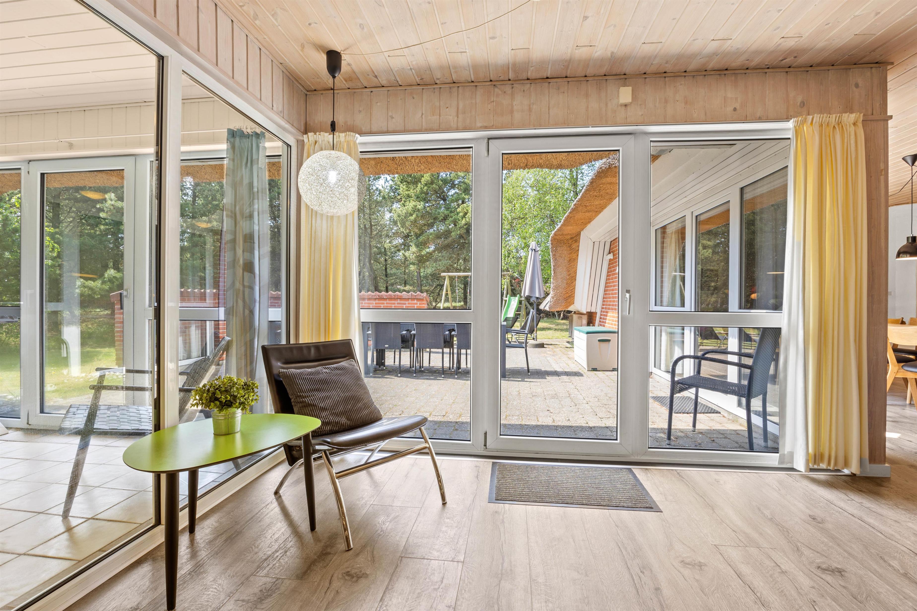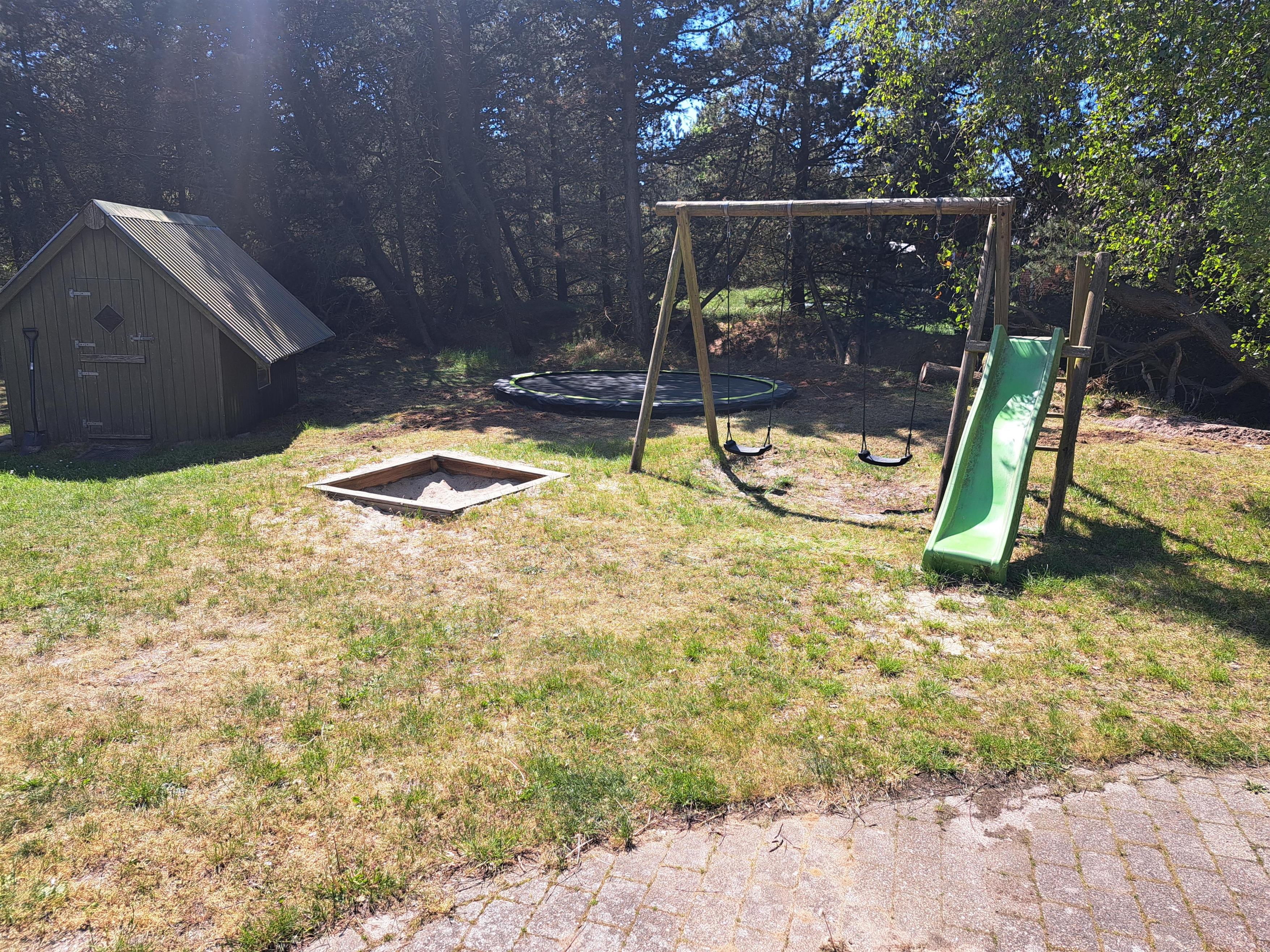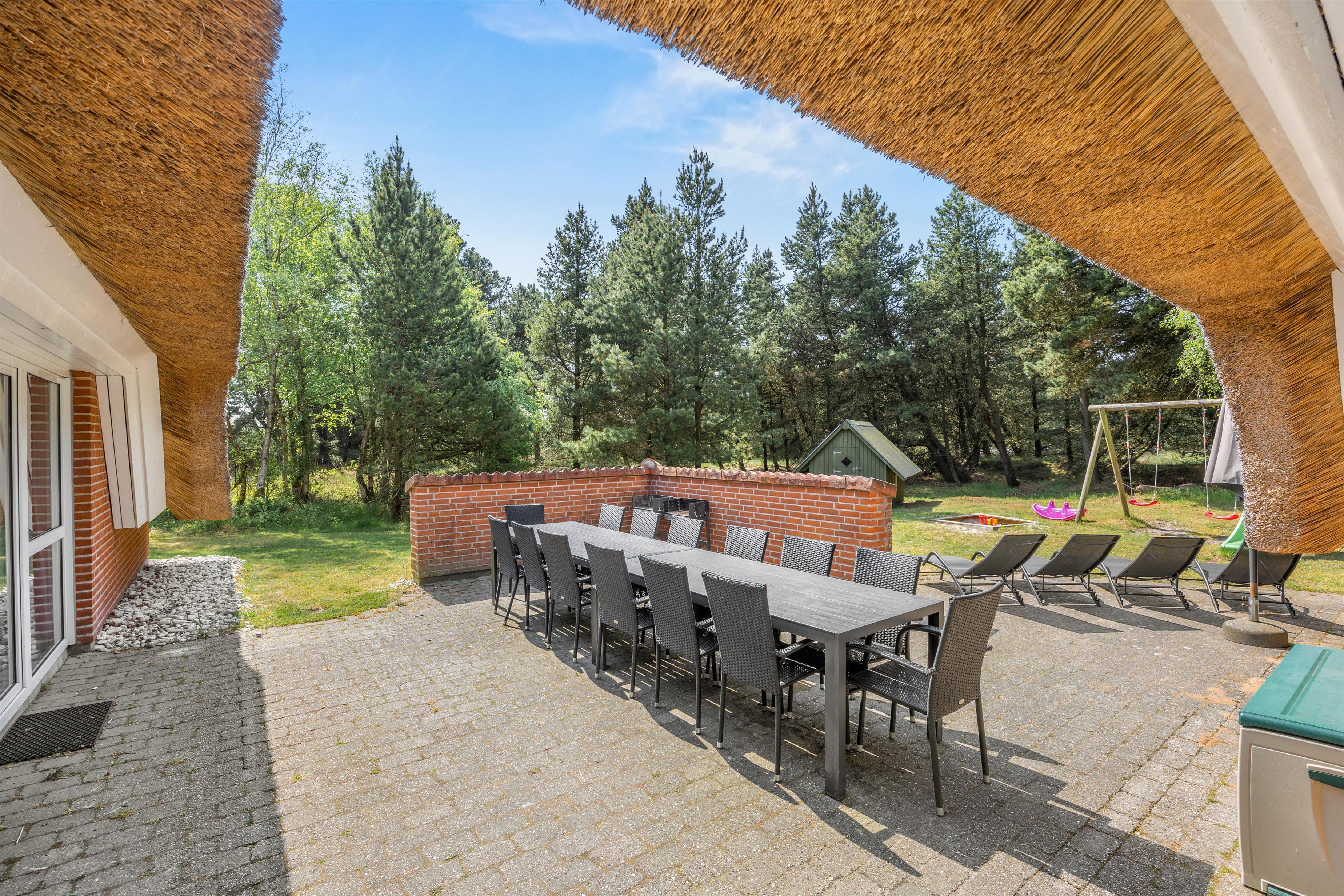 På den åbne terrasse kan I slappe af i de komfortable havemøbler og liggestole, imens børnene leger på gynger, rutsjebane og i sandkasse. Her er såmænd også en nedgravet trampolin, hvor børnene kan hoppe. Smør en ordentlig gang håndmadder og spis frokosten udendørs ved de lange borde på terrassen. Besøg den fantastiske sandstrand på vestsiden af øen og nyd det salte bekendtskab med Vesterhavet. På vejen tilbage kan I købe ind til aftensmaden i de lokale butikker med kvalitetsvarer – fisk – grillmad – lækre brød og så videre.