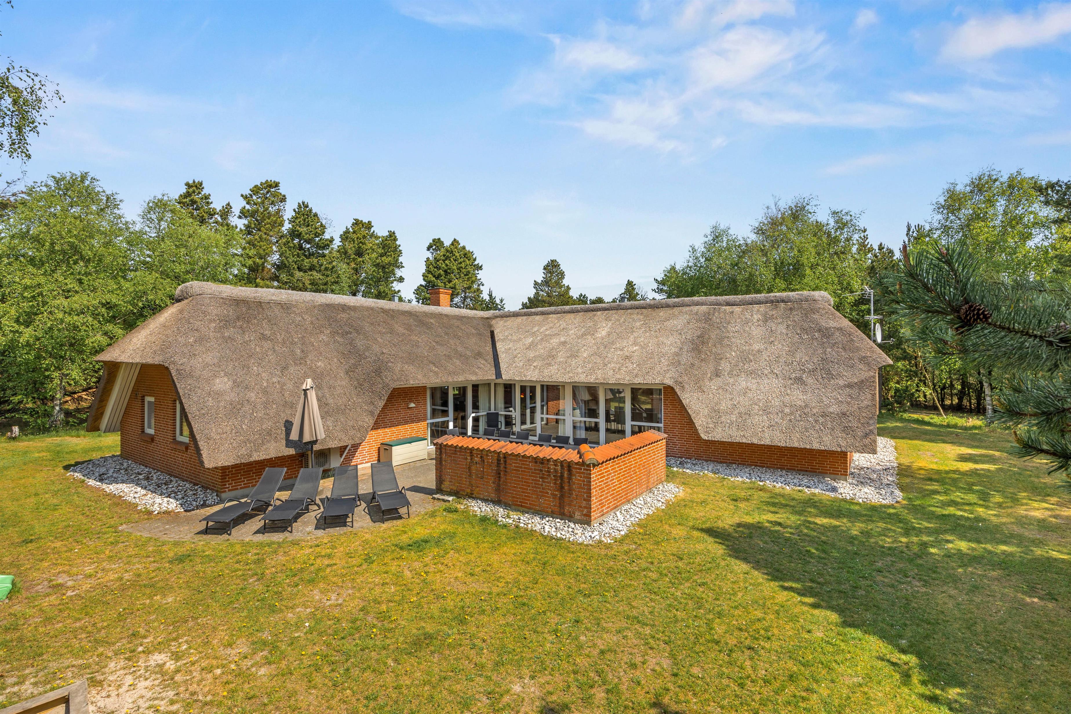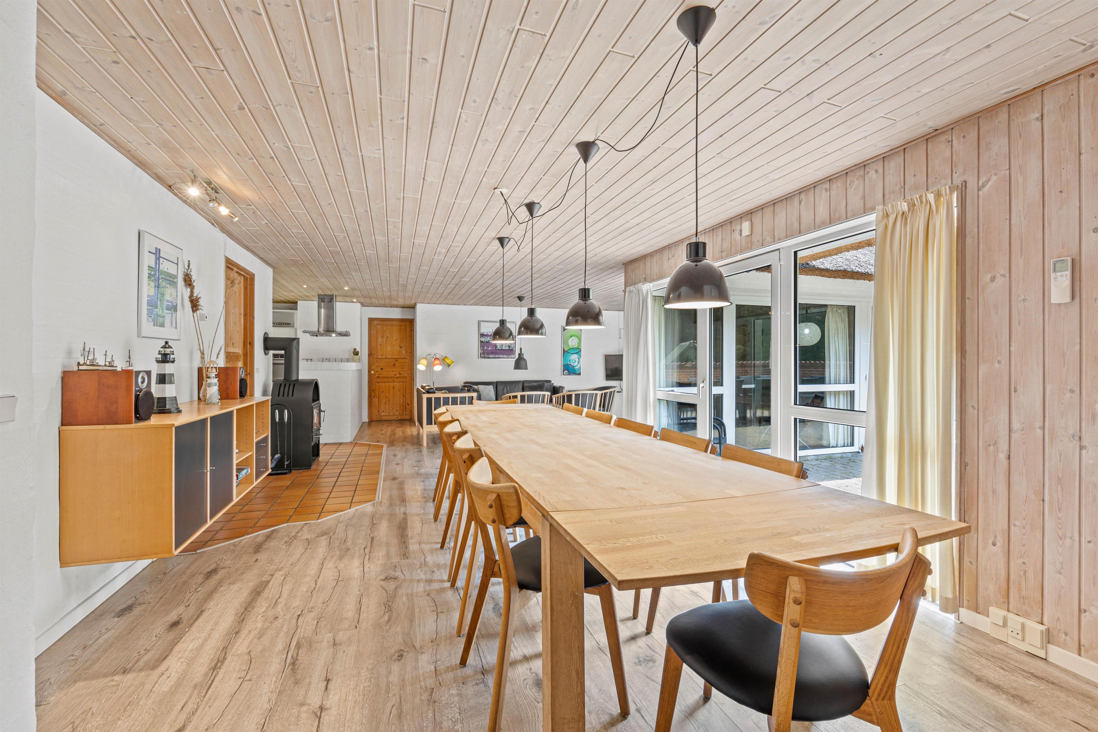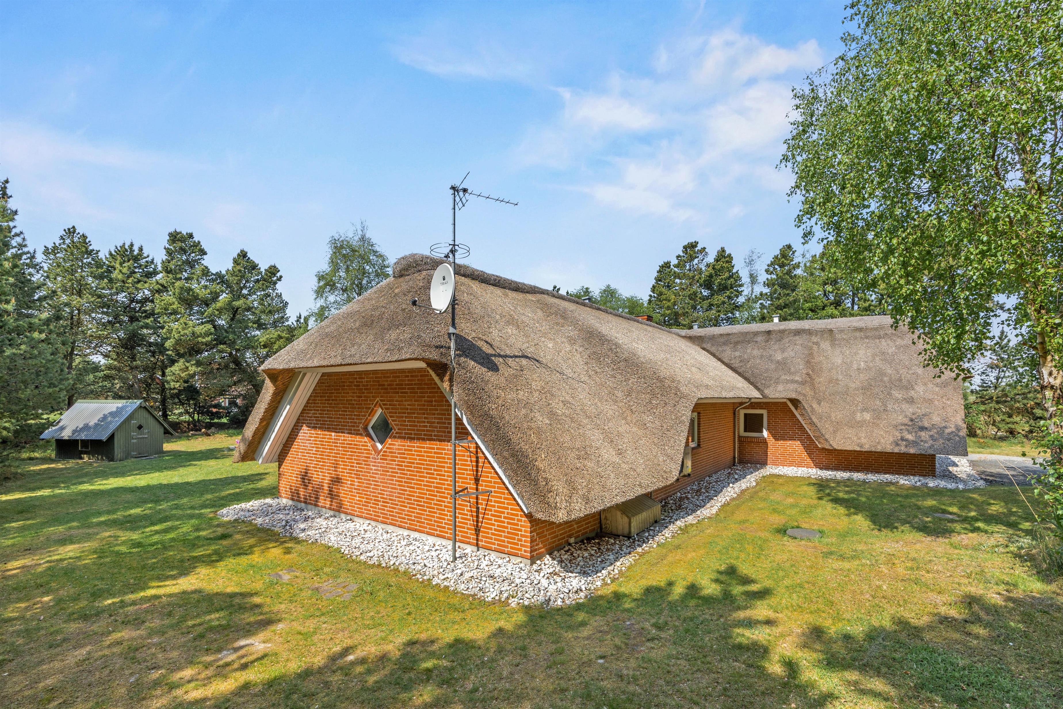 Det stråtækte sommerhus på Moritzvej 18 ligger på en 2.500 m2 stor naturgrund, ugenert og omkranset af løv- og nåletræer. I det store vinkel-opholdsrum med brændeovn er der god plads til, at alle kan spise og opholde sig sammen. Ved det lange spisebord kan I indtage jeres hjemmelavede måltider, spille kort eller brætspil, imens ilden knitrer i brændeovnen. Eller I kan hygge jer i sofagruppen med en god bog eller en film på TV’et. I alle soveværelser er der et TV.