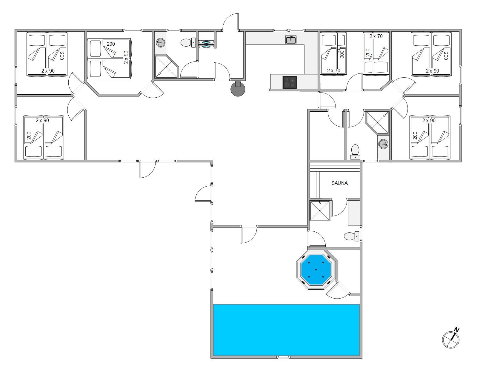 I det åbne køkken er alt, hvad I behøver for at forkæle hinanden med lækre måltider. Er I mange, eller er der lystfiskere iblandt jer, er den separate fryser på 110 L en god hjælp til opbevaring, derudover er der 2 køleskabe. I wellnessområdet kan I tilbringe utallige fornøjelige timer sammen i spa, sauna og swimmingpool. Lad børnene lave bomber i poolen, mens de voksne slapper af i spaen – eller omvendt. De 3 badeværelser med gulvvarme bidrager til, at I ikke behøver at stå i kø til morgenbadet. Og i de hyggelige soveværelser kan I alle sove rigtig godt ud i den friske vesterhavsluft.