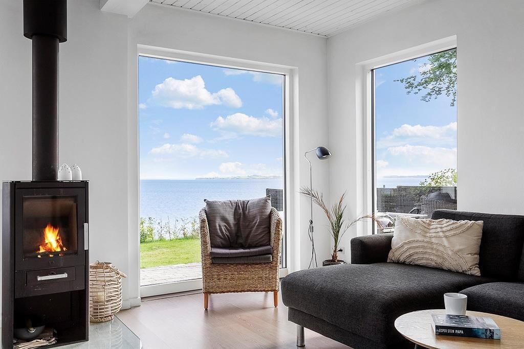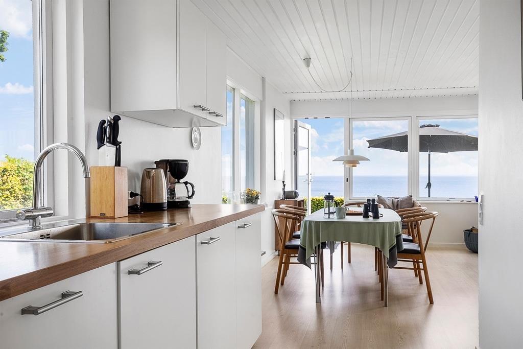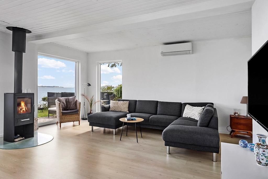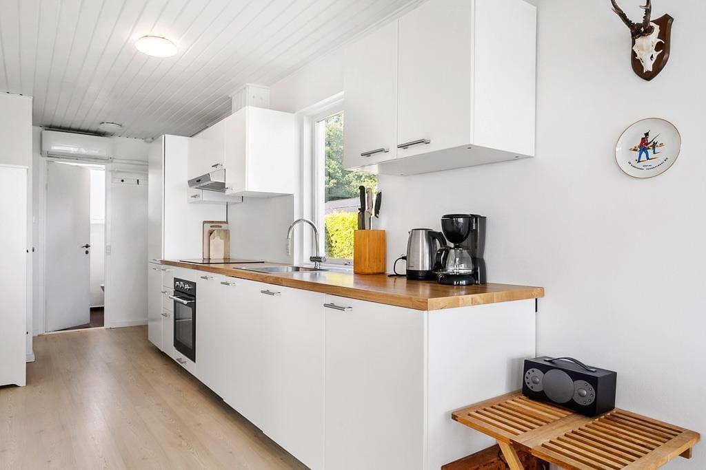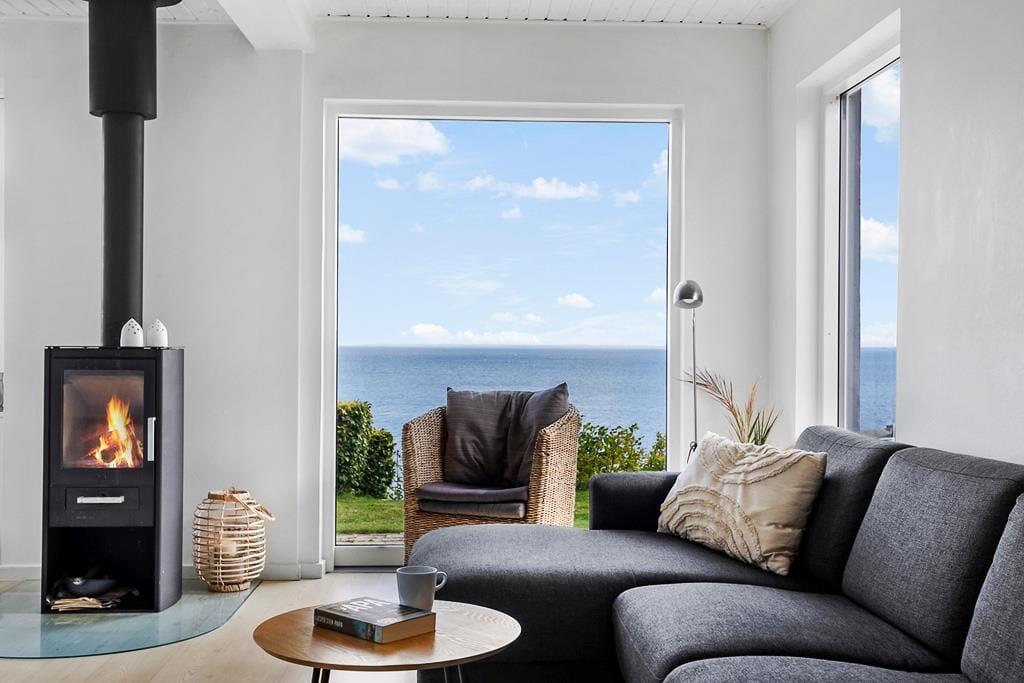 Indretningen er lys og indbydende med et åbent opholdsrum, hvor det naturlige samlingspunkt er den hyggelige stue. Her kan du slå dig ned med et tæppe i sofaen og mærke varmen brede sig fra brændeovnen, mens du hører træet knitre og nyder en stille stund med en kop kaffe og udsigt til vandet i horisonten. Køkkenet ligger i åben forbindelse med stuen, så du kan være sammen med resten af familien, mens du tilbereder morgenmaden eller aftensmaden. Efter dagens udflugter er det skønt at vende hjem til dette fredelige og stemningsfulde rum, hvor man virkelig kan mærke, at ferien er i gang.