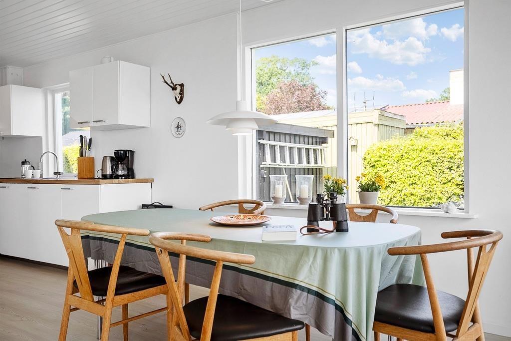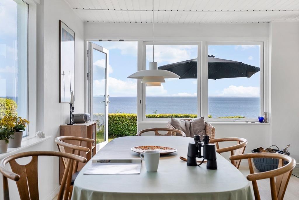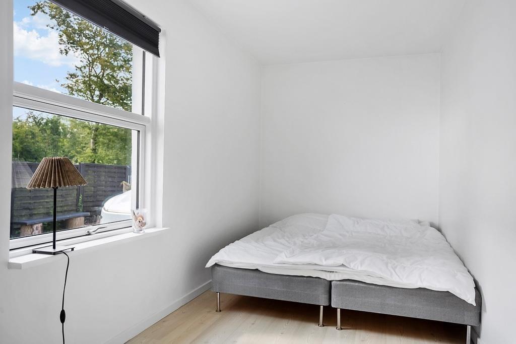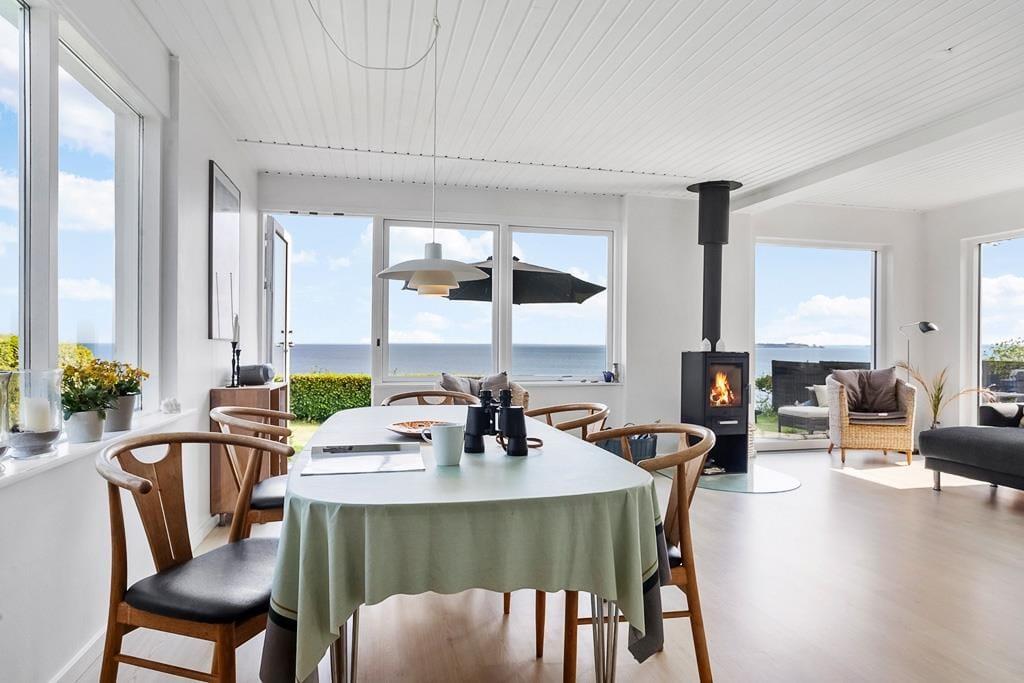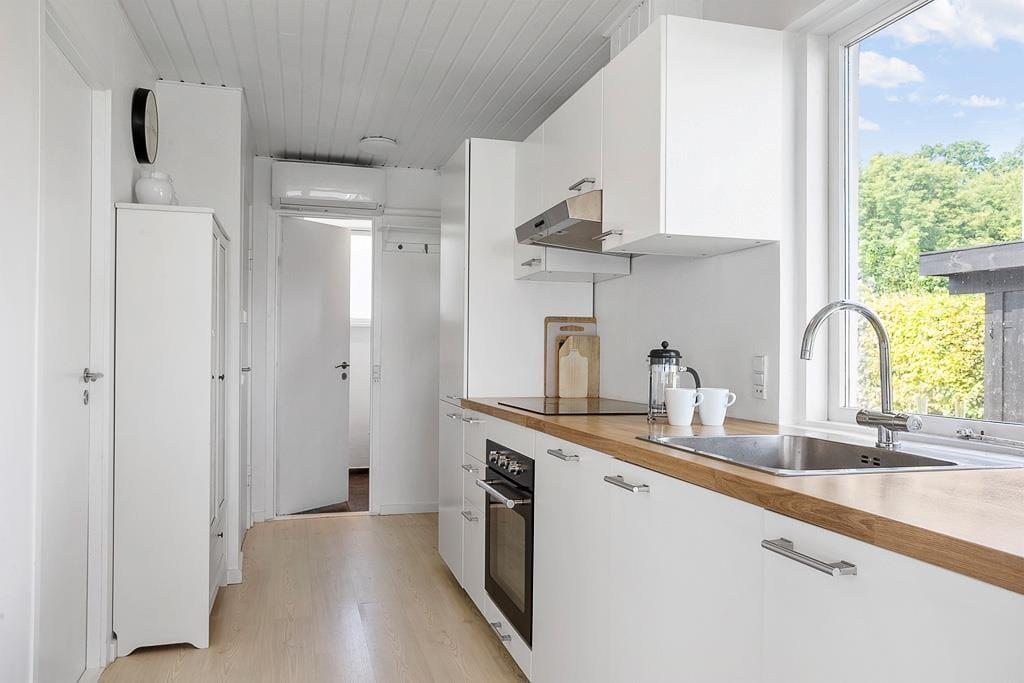 Indretningen er lys og indbydende med et åbent opholdsrum, hvor det naturlige samlingspunkt er den hyggelige stue. Her kan du slå dig ned med et tæppe i sofaen og mærke varmen brede sig fra brændeovnen, mens du hører træet knitre og nyder en stille stund med en kop kaffe og udsigt til vandet i horisonten. Køkkenet ligger i åben forbindelse med stuen, så du kan være sammen med resten af familien, mens du tilbereder morgenmaden eller aftensmaden. Efter dagens udflugter er det skønt at vende hjem til dette fredelige og stemningsfulde rum, hvor man virkelig kan mærke, at ferien er i gang.