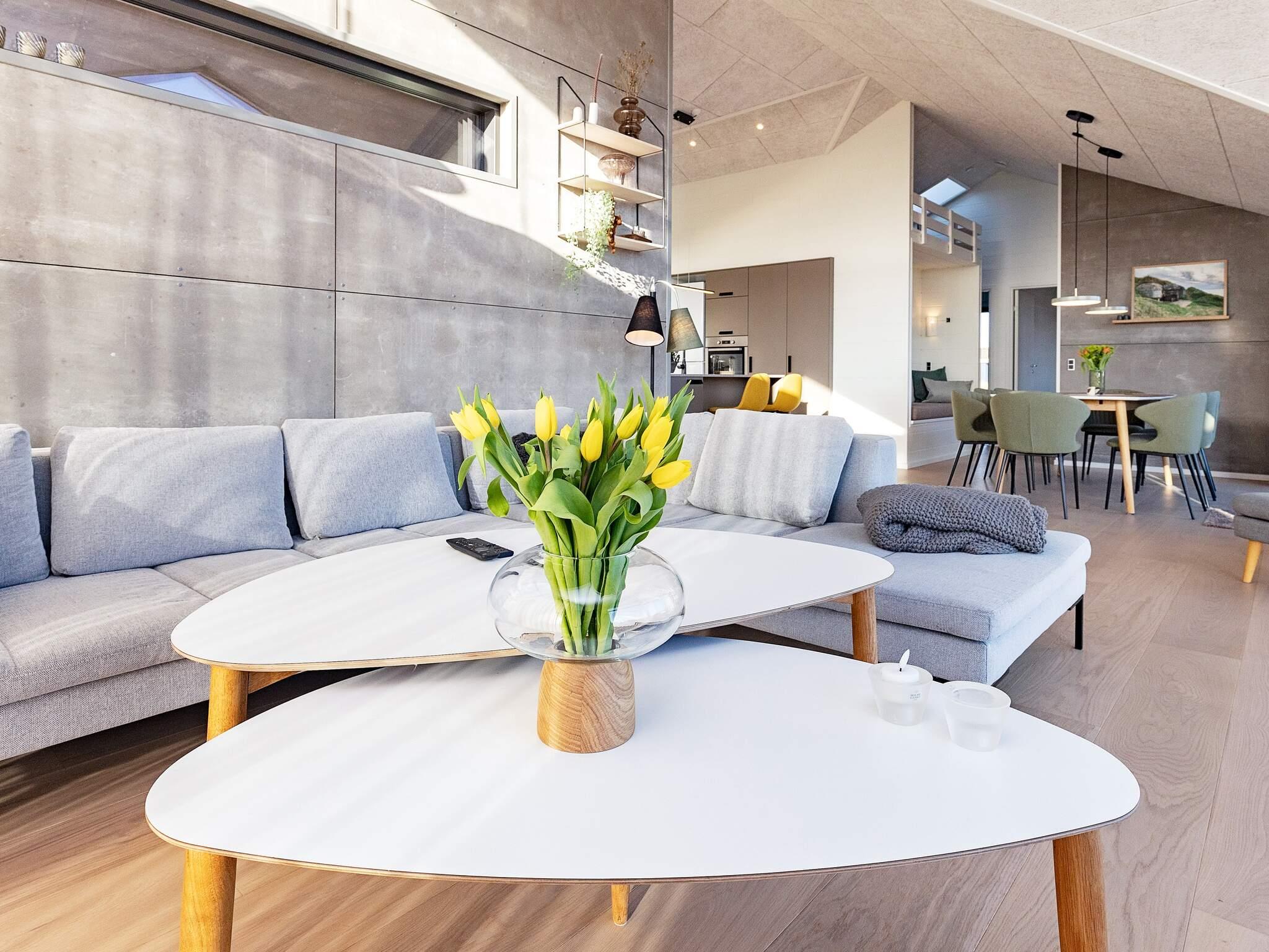 Hjertet i sommerhuset er en stor åben stue med god akustik i forbindelse med det veludstyrede køkken. Der er plads til, at alle kan samles og nyde madlavning, måltider, spil, en god film i husets alkove, eller hvad der ellers er lyst til. Rummet har flere vinduespartier, der lader det fascinerende nordjyske lys strømme ind, og på varme dage kan du åbne ud til terrassen.