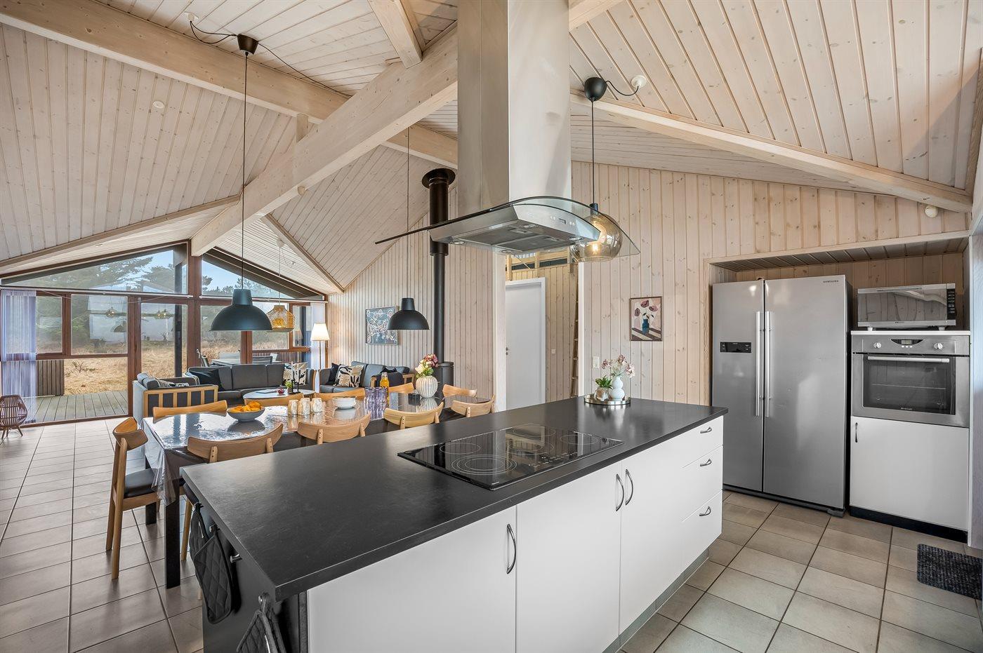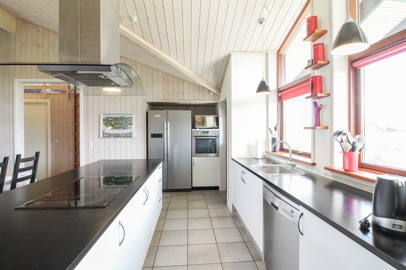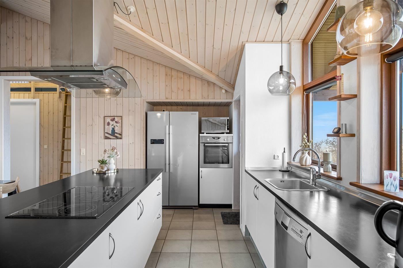 Køkkenet er udstyret med 1 amerikansk køleskab. Der er 5 keramiske kogeplader, bageovn, varmluftovn, mikrobølgeovn samt opvaskemaskine.