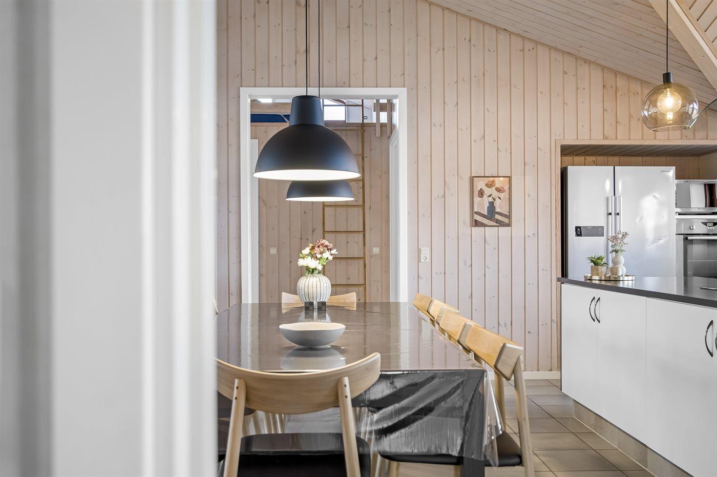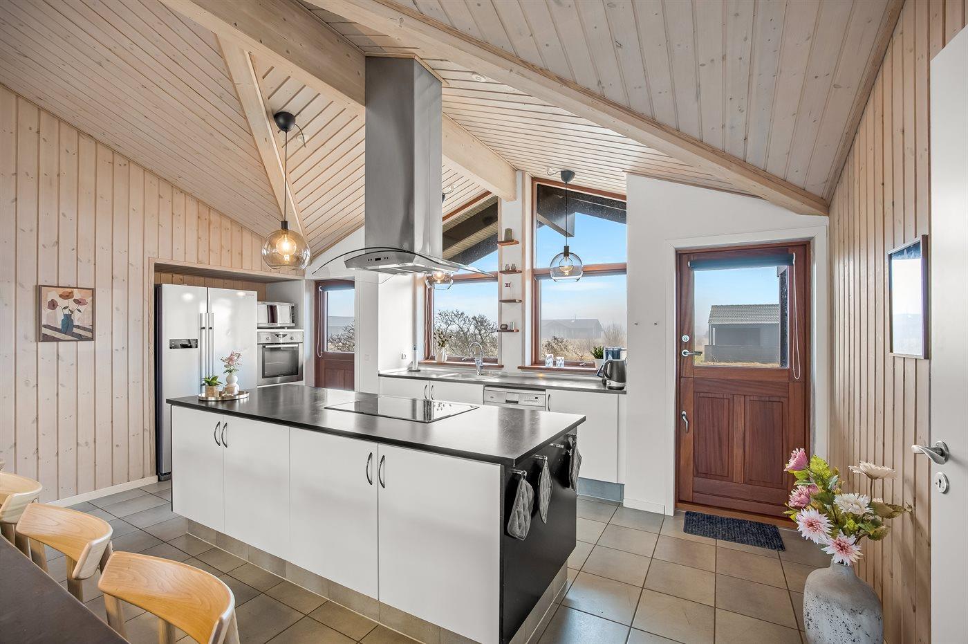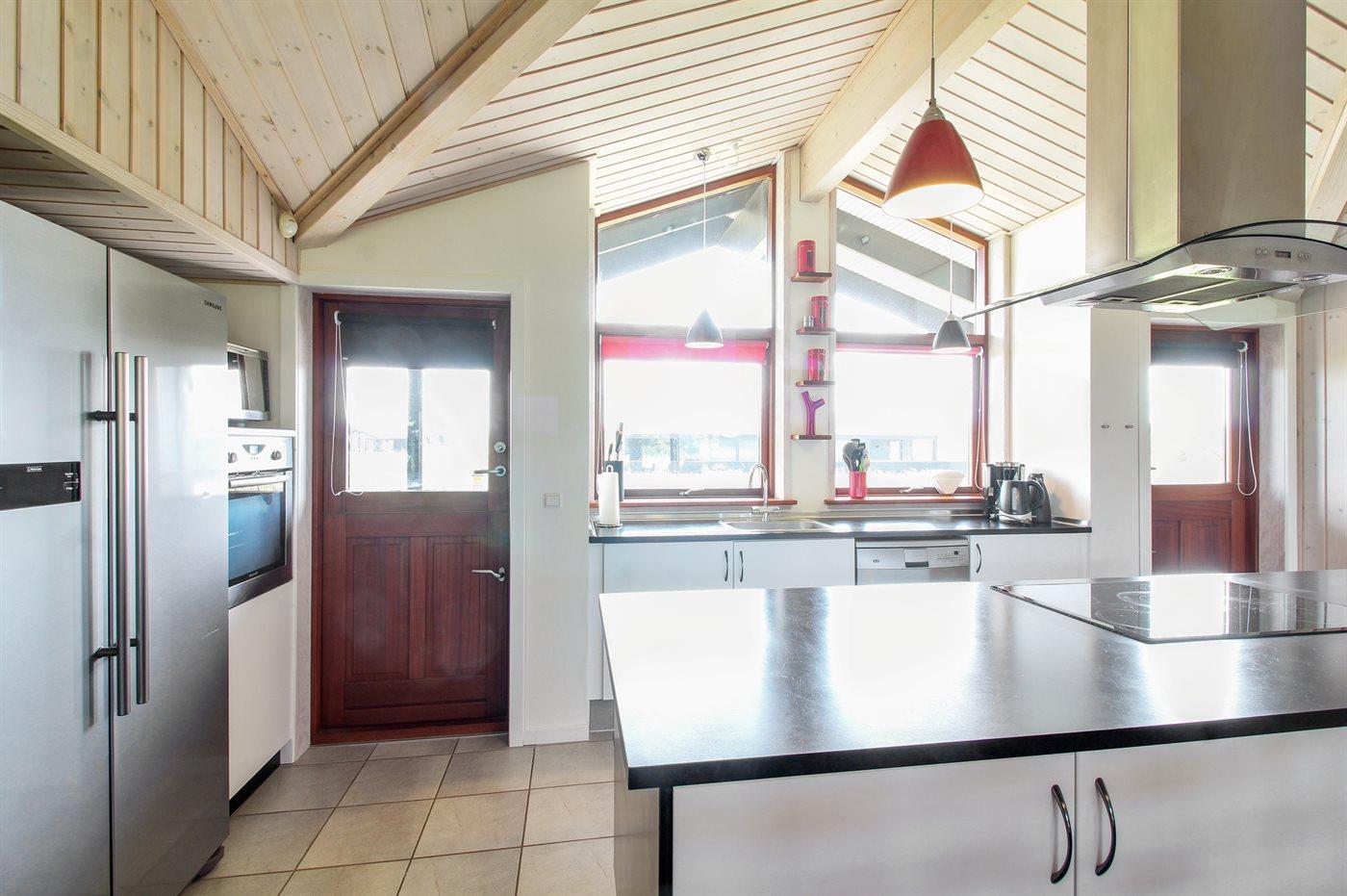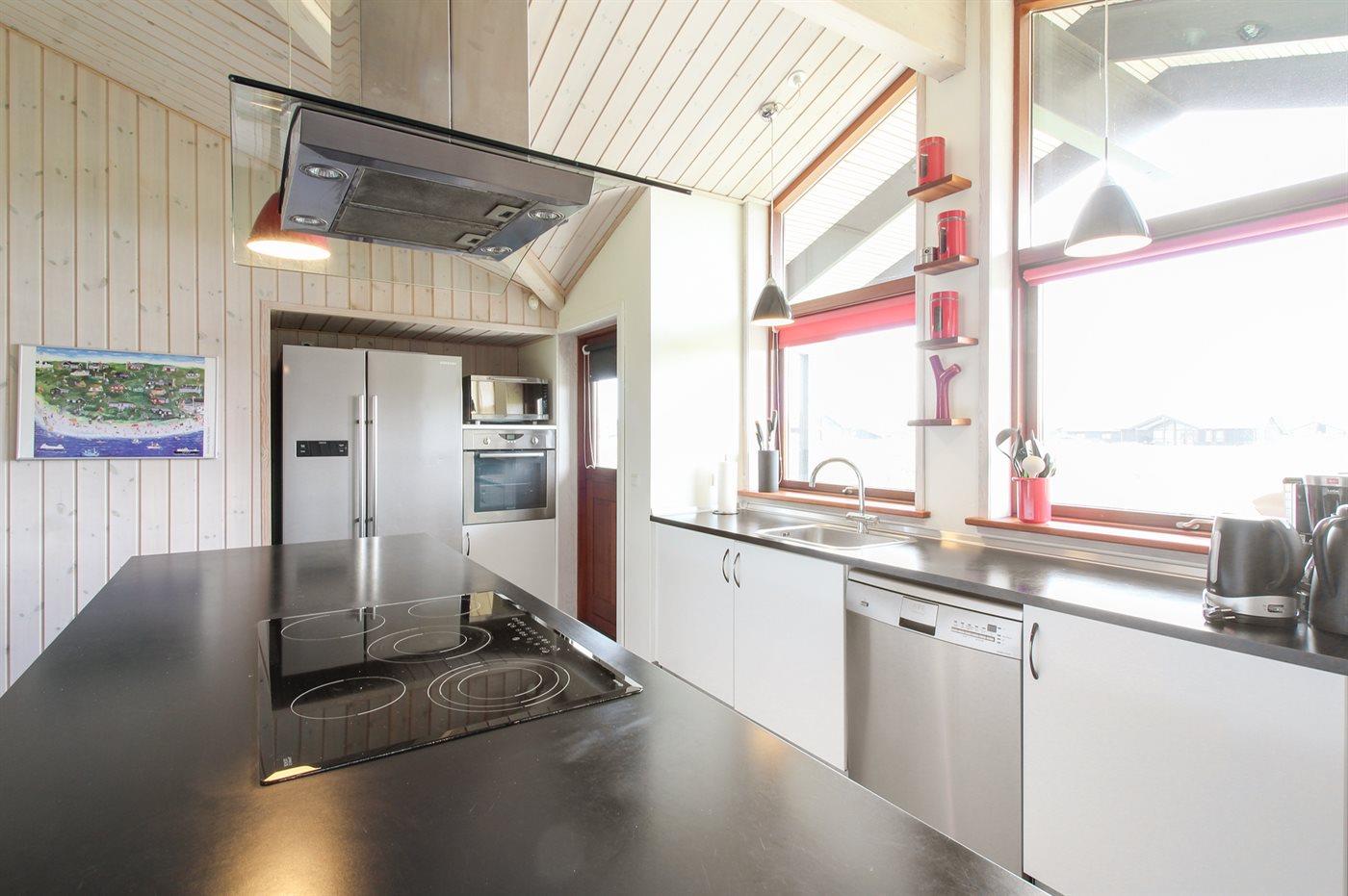 Køkkenet er udstyret med 1 amerikansk køleskab. Der er 5 keramiske kogeplader, bageovn, varmluftovn, mikrobølgeovn samt opvaskemaskine.