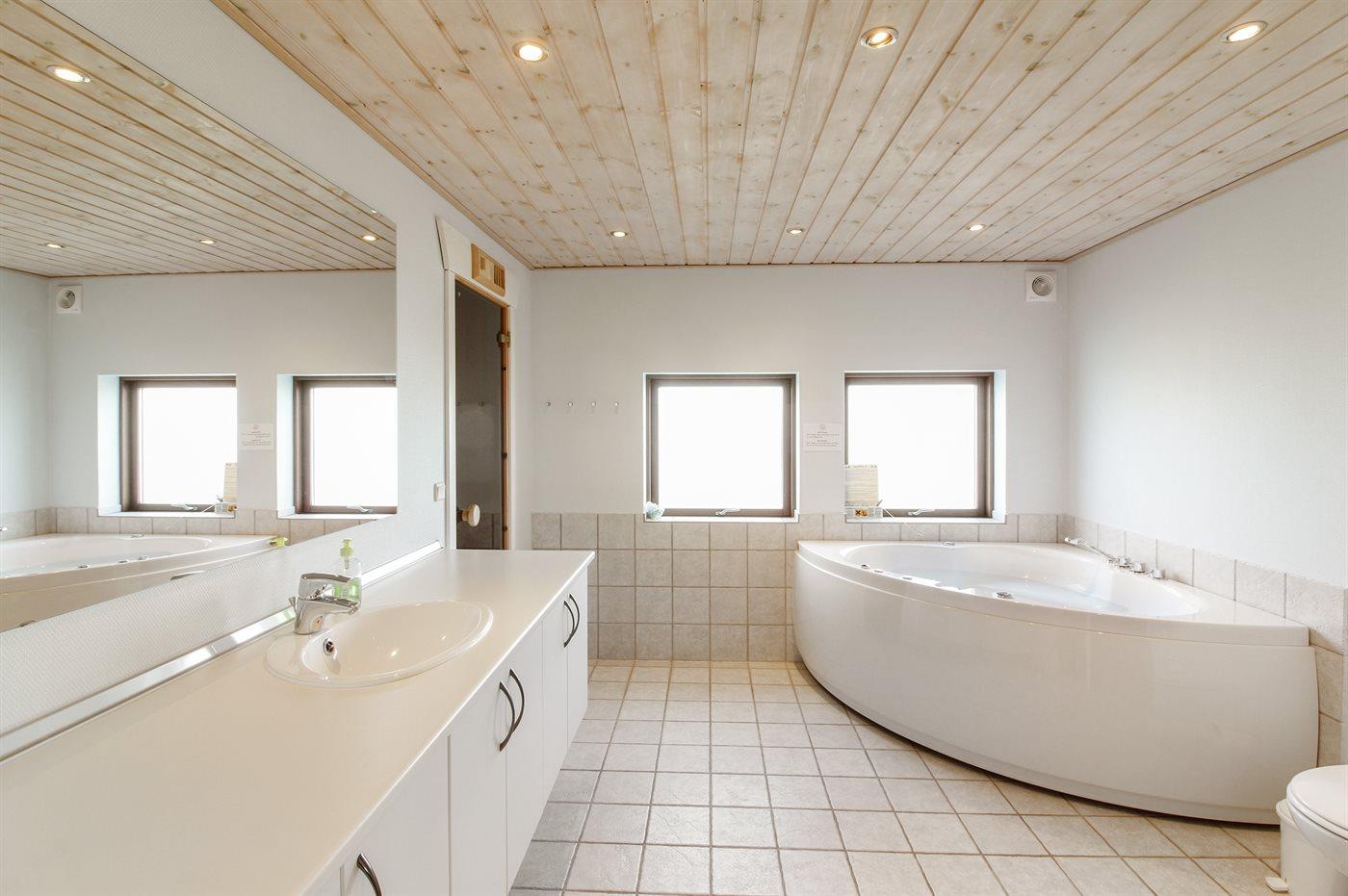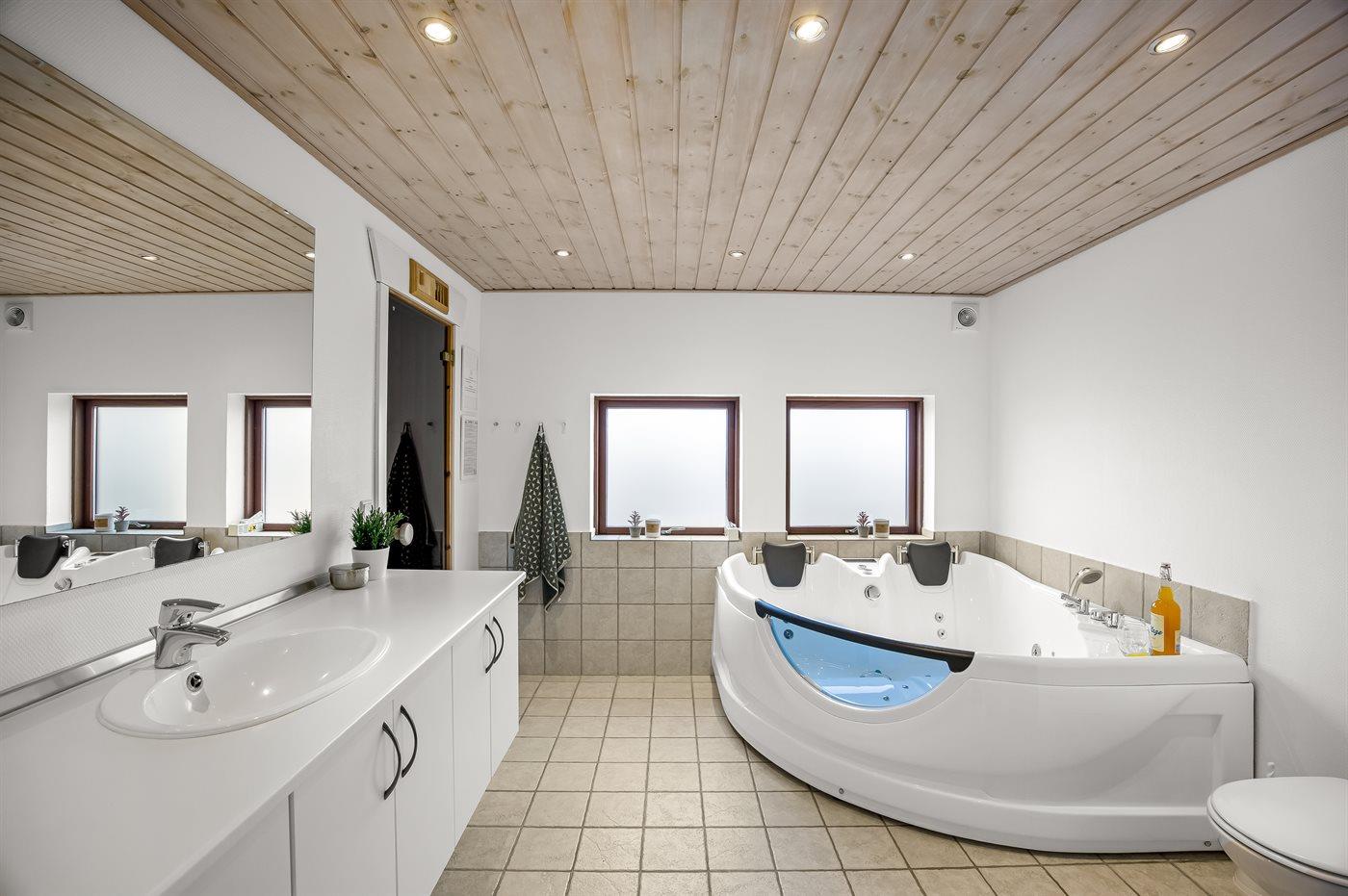 Der er 2 badeværelser med bruseniche og 2 toiletter. Der er gulvvarme på 2 badeværelser. I saunaen er der mulighed for afslapning.