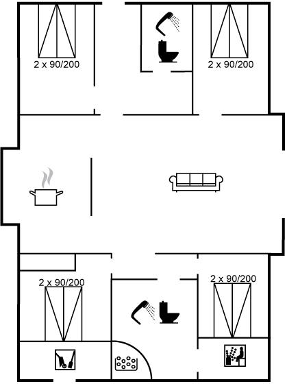Der er i alt 4 soveværelser. Sovepladserne fordeler sig på: 8 sovepladser i dobbeltsenge. 2 sovepladser i enkeltsenge. 2 af disse sovepladser befinder sig på husets hems. Derudover er der 1 stk. barneseng.