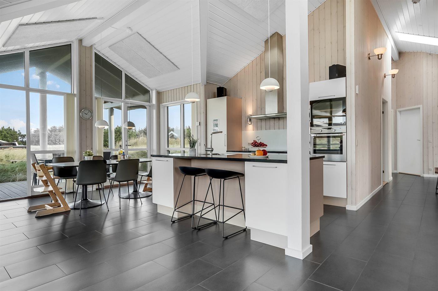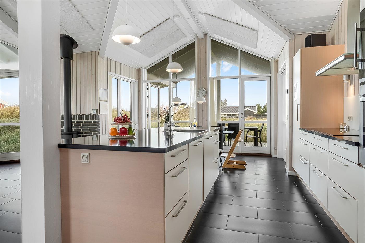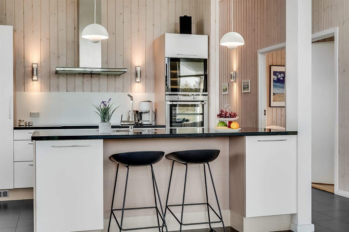 Køkkenet er udstyret med stort køleskab og vinkøleskab. Der er 4 induktionskogeplader, varmluftovn, mikrobølgeovn samt opvaskemaskine. Fryser på 120 liter i udhus. Ferieboligen har vaskemaskine og tørretumbler. Der er desuden brændeovn. Til de små er der 2 stk. barnestole.