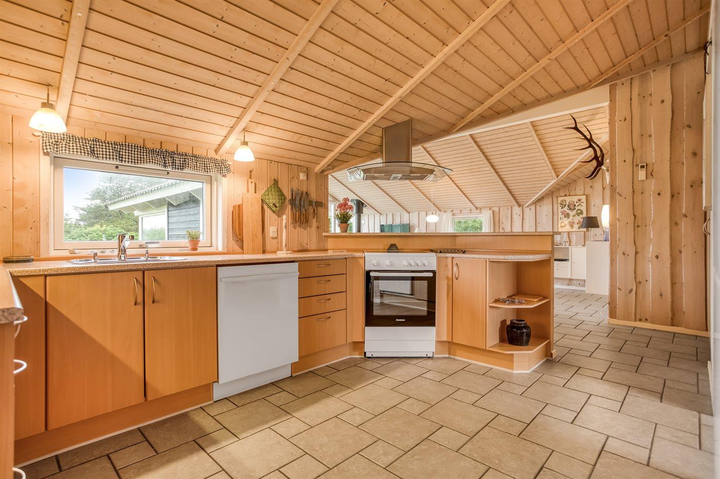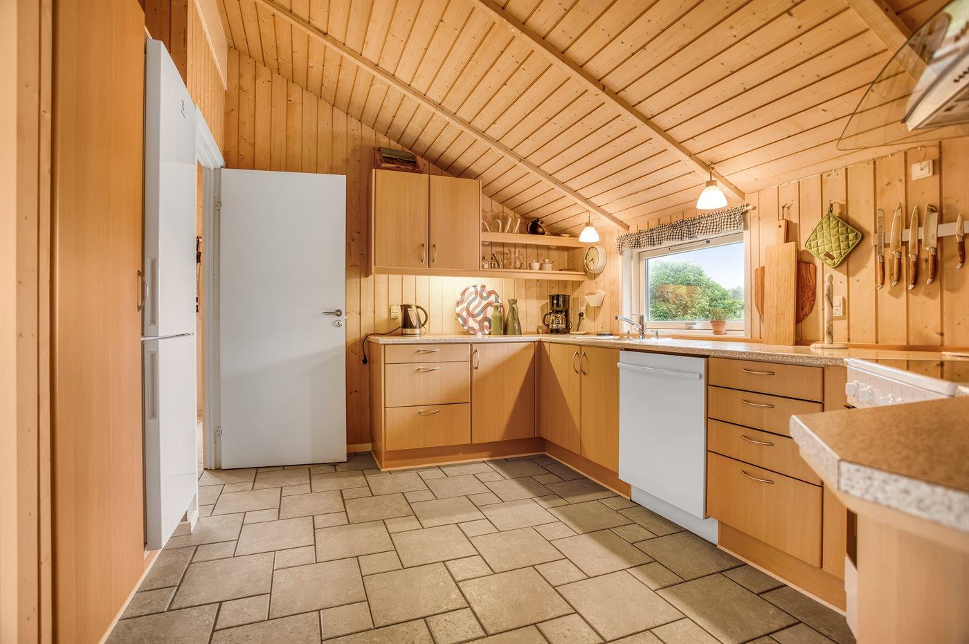 Køkkenet er udstyret med 1 køleskab. Der er 4 keramiske kogeplader, varmluftovn, mikrobølgeovn samt opvaskemaskine.