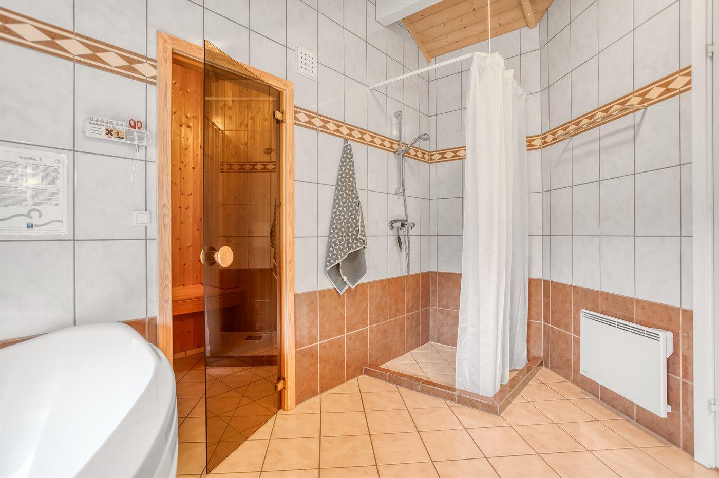 Der er 2 badeværelser med bruseniche og 2 toiletter. Der er gulvvarme på 2 badeværelser. I saunaen er der mulighed for afslapning.