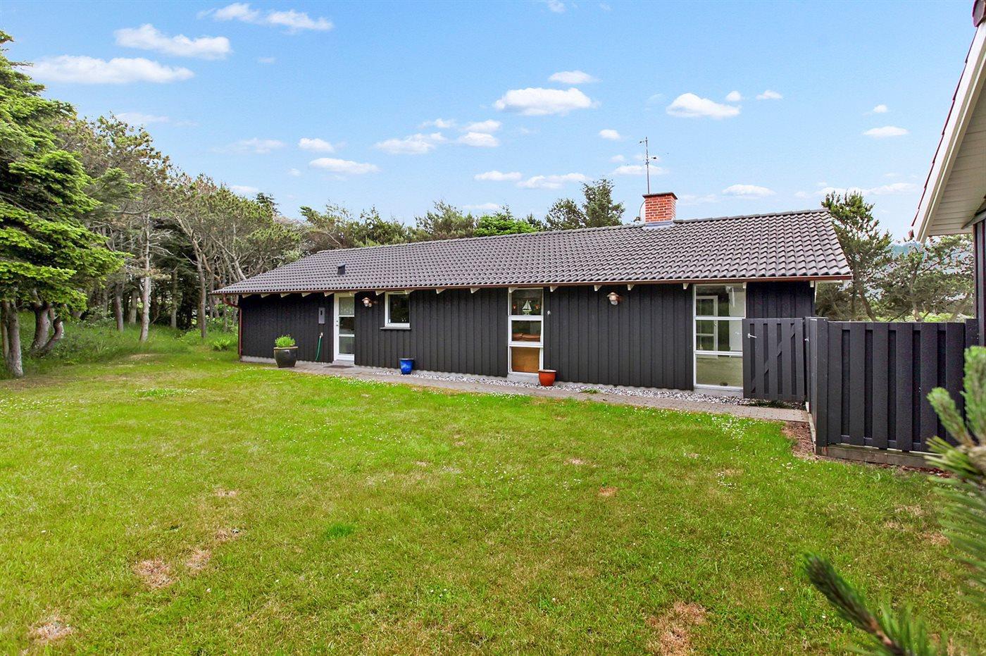 Dejligt og lyst indrettet sommerhus med god plads beliggende på en meget stor og delvis lukket grund med mange træer på halvdelen af grunden. Huset ligger desuden i et roligt og naturskønt område nær Vesterhavet og skøn badestrand samt skovarealer med flere gode vandrestier.