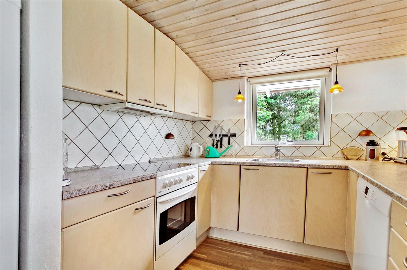 Køkkenet er udstyret med 1 køleskab. Der er 4 keramiske kogeplader, varmluftovn, mikrobølgeovn samt opvaskemaskine.