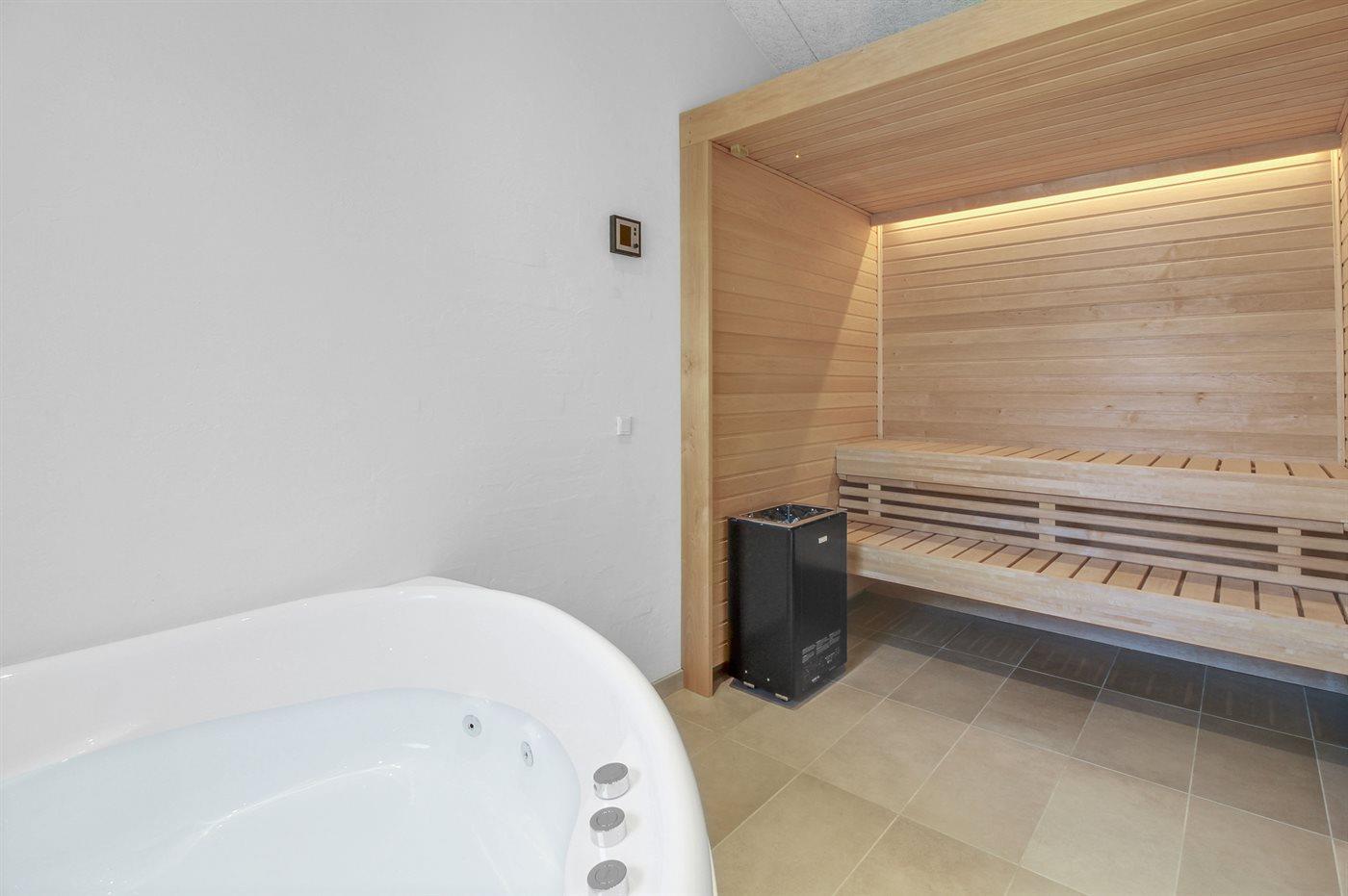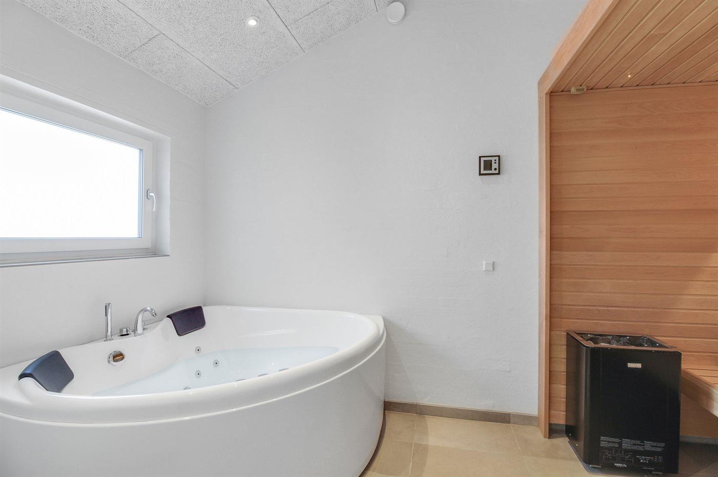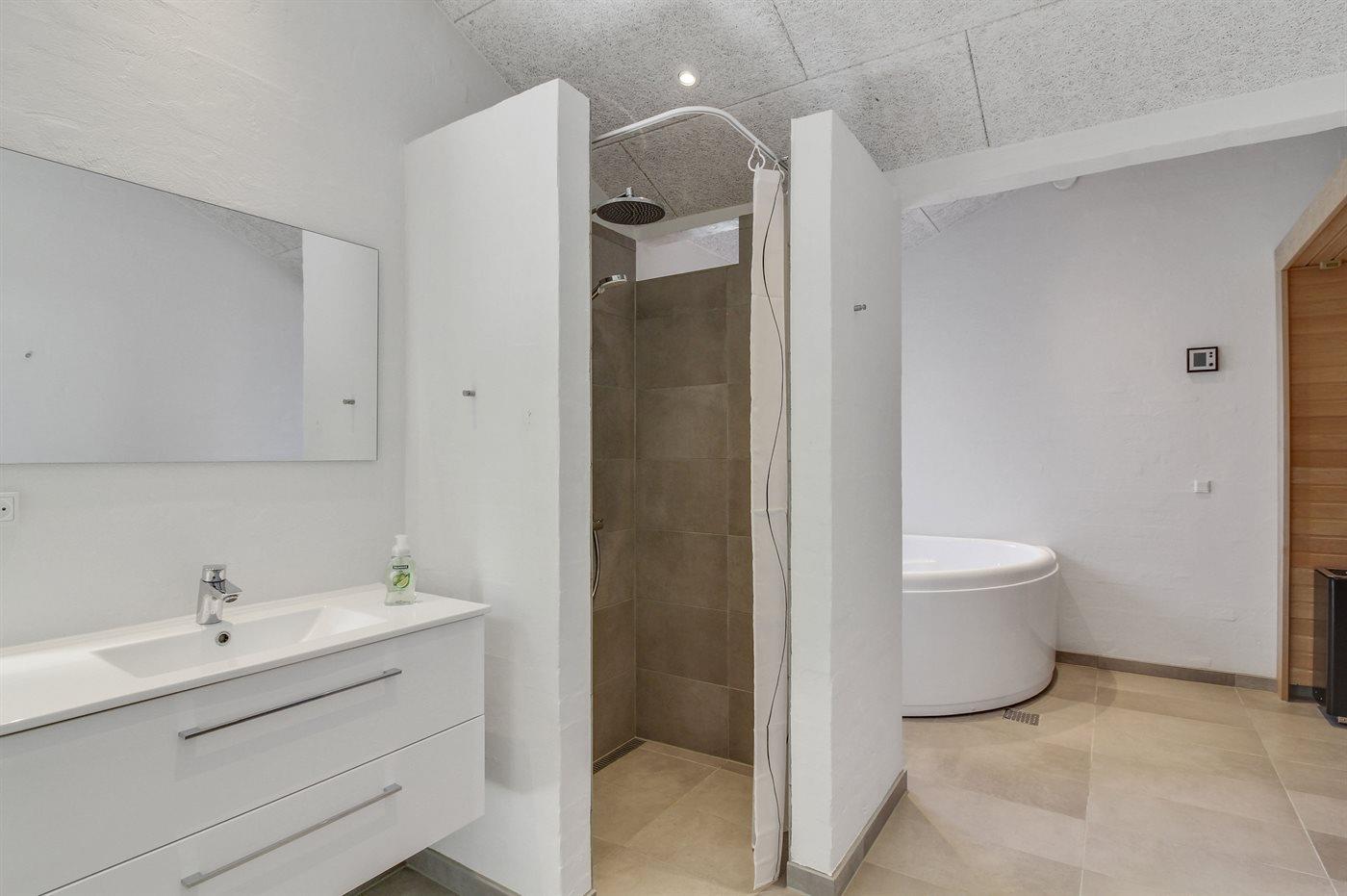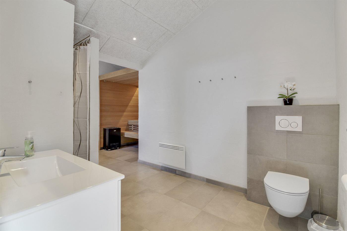 Der er 2 badeværelser med bruseniche og 2 toiletter. Der er gulvvarme på 2 badeværelser. I saunaen, der både har infrarød og almindelig funktion, er der mulighed for afslapning.
