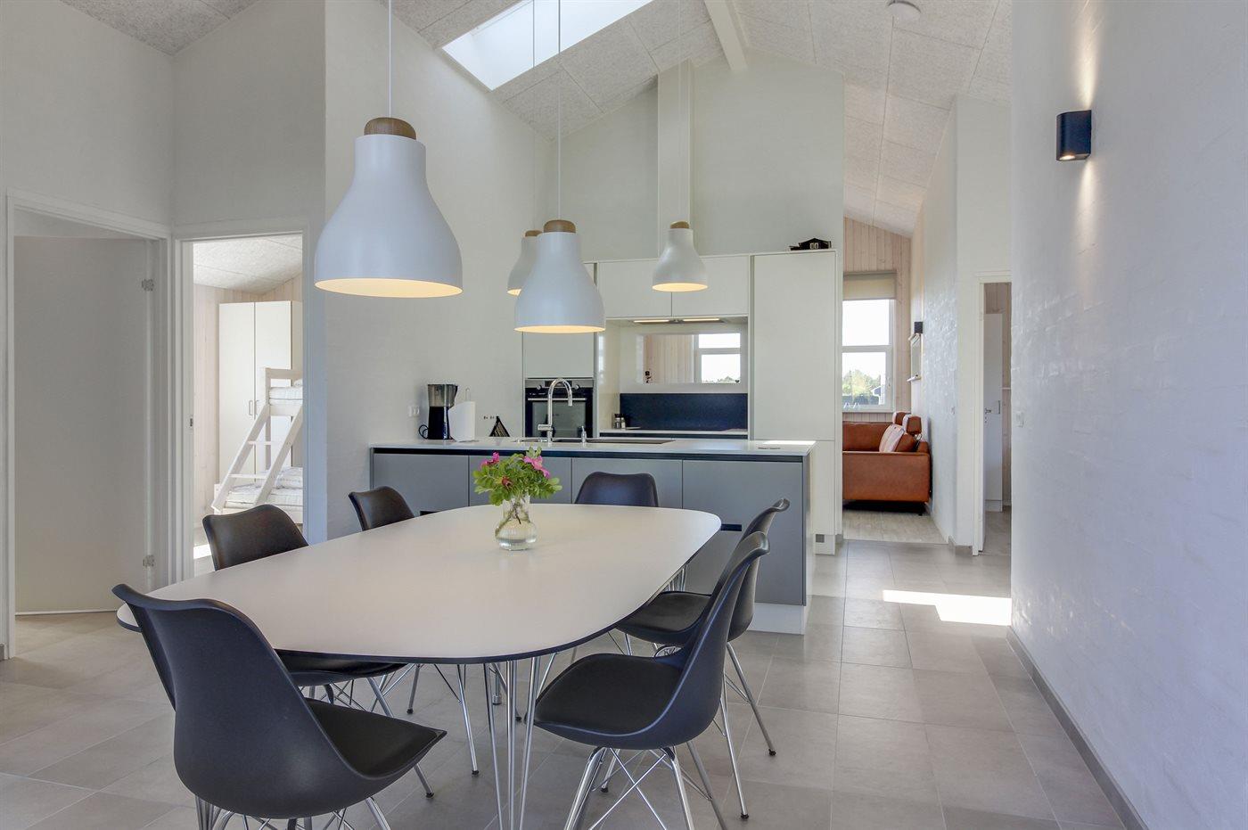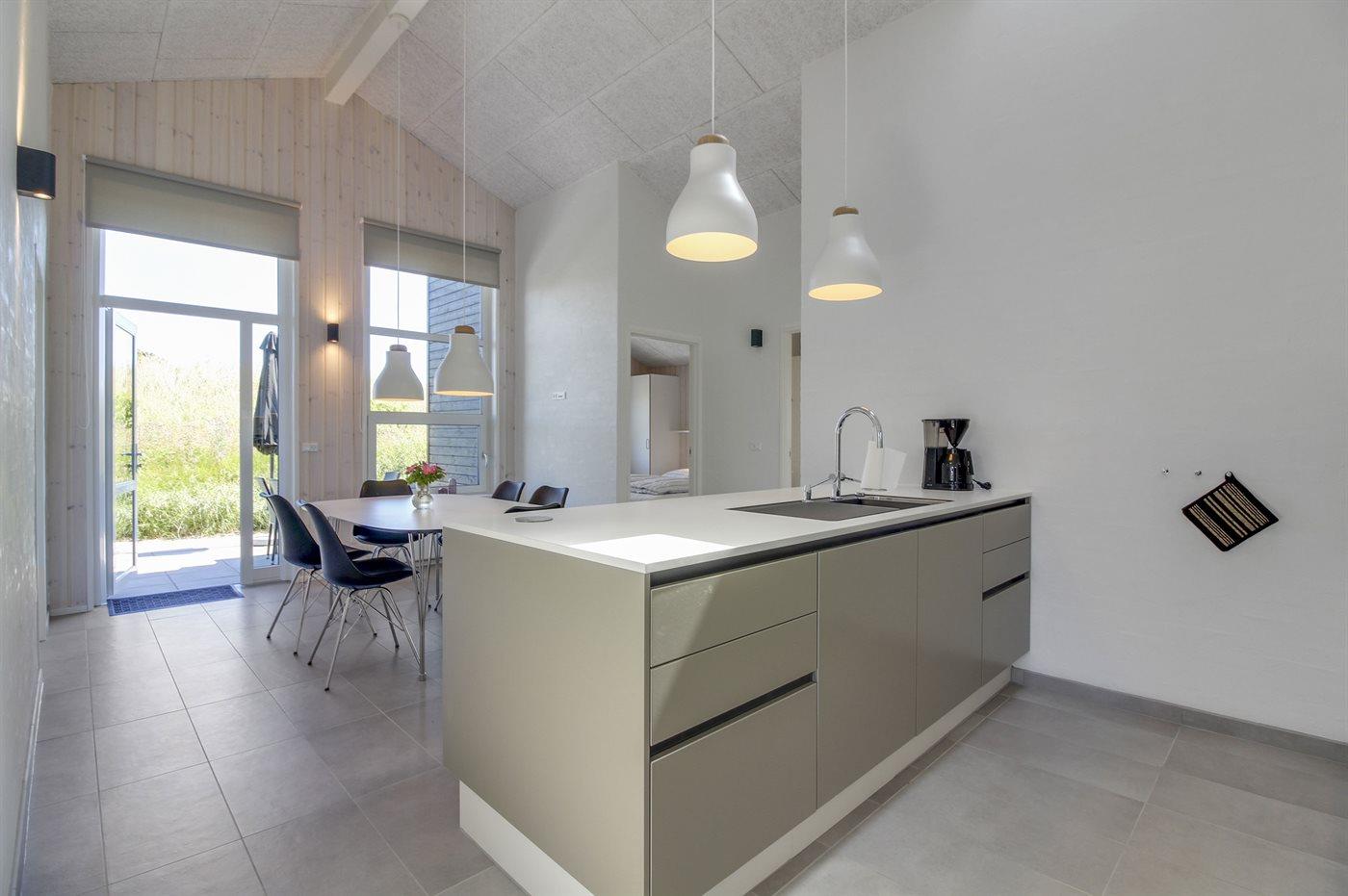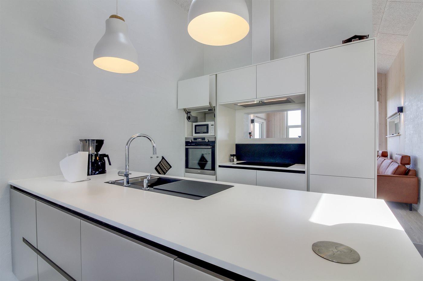 Køkkenet er udstyret med 1 køleskab. Der er 4 induktionskogeplader, varmluftovn, mikrobølgeovn samt opvaskemaskine.