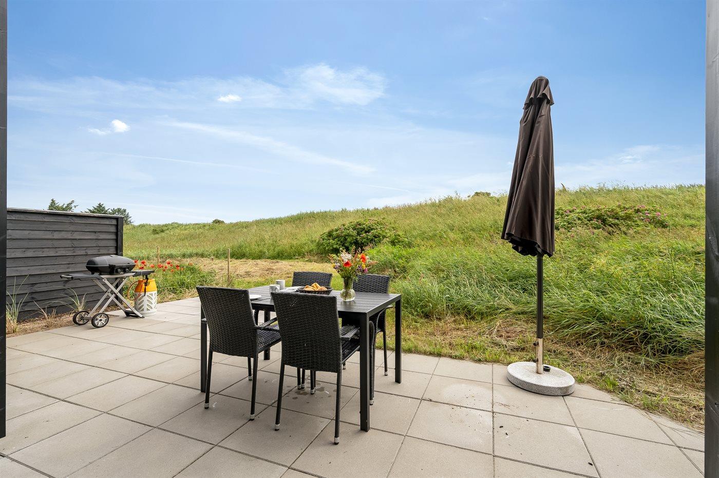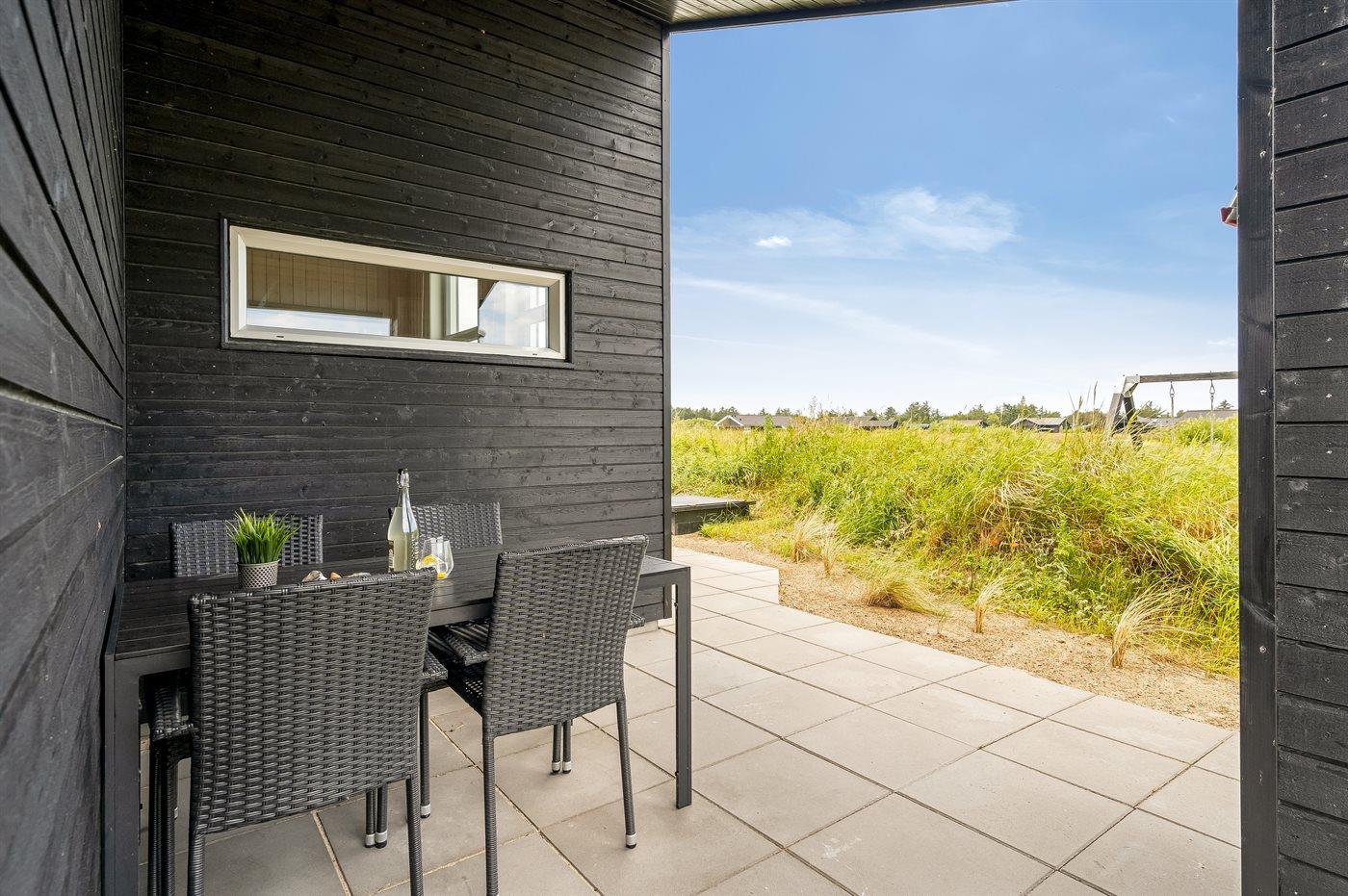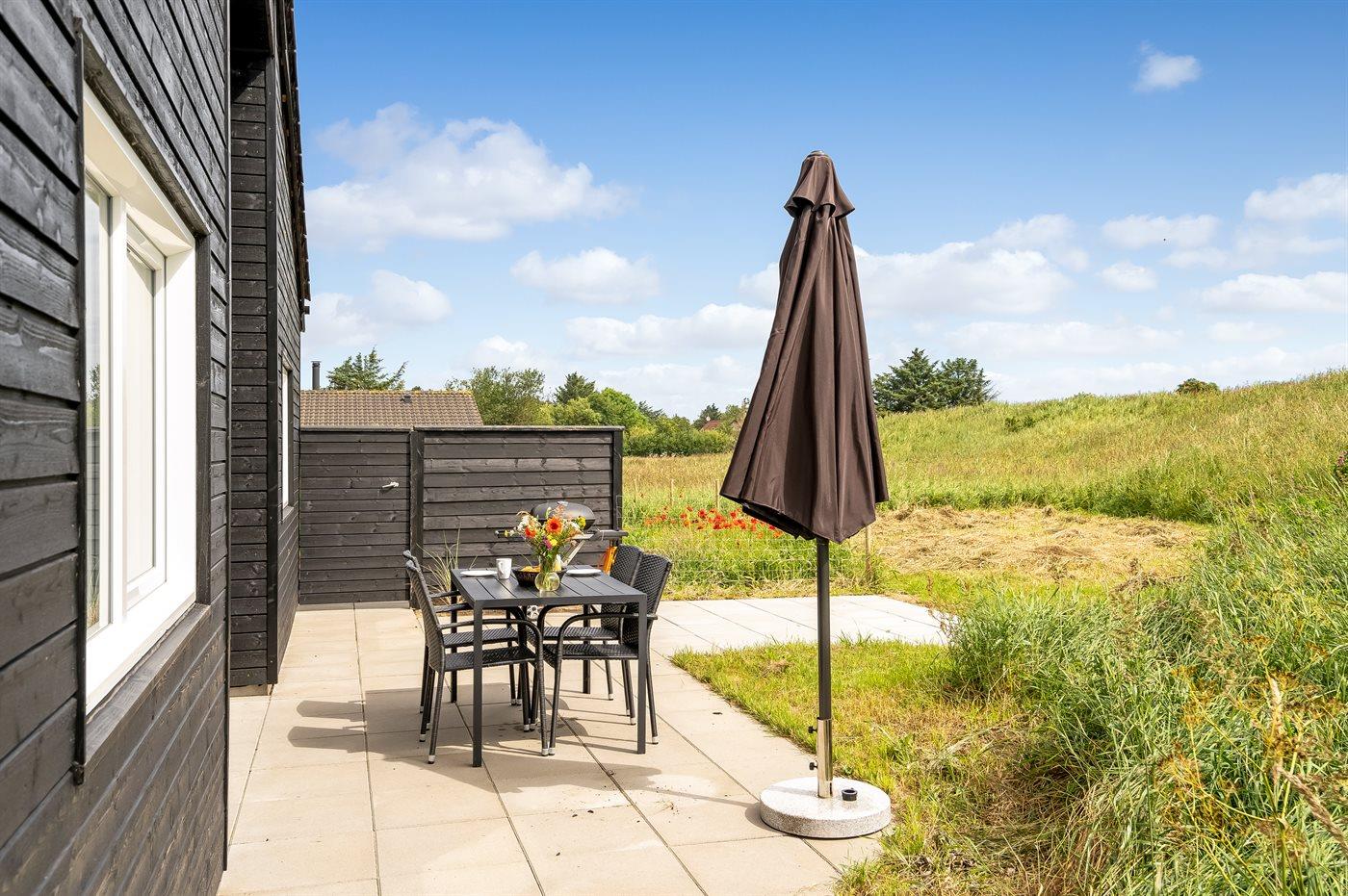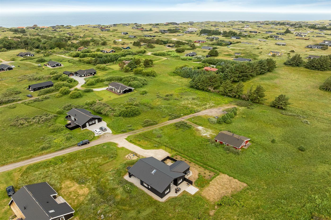 Ferieboligen er beliggende på en 2500 m² stor naturgrund. Der er 1000 m til havet. Nærmeste forretning er beliggende i en afstand af 3000 m. Til ferieboligen hører 58 m² terrasseareal. Desuden er der 24 m² overdækket terrasse. Der er redskabsrum. Gynge. Sandkasse. Der er installeret stik til opladning af elbil. CEE stik. Parkering ved ferieboligen.