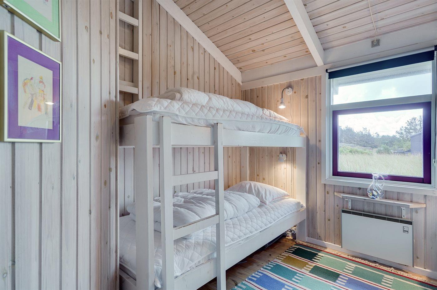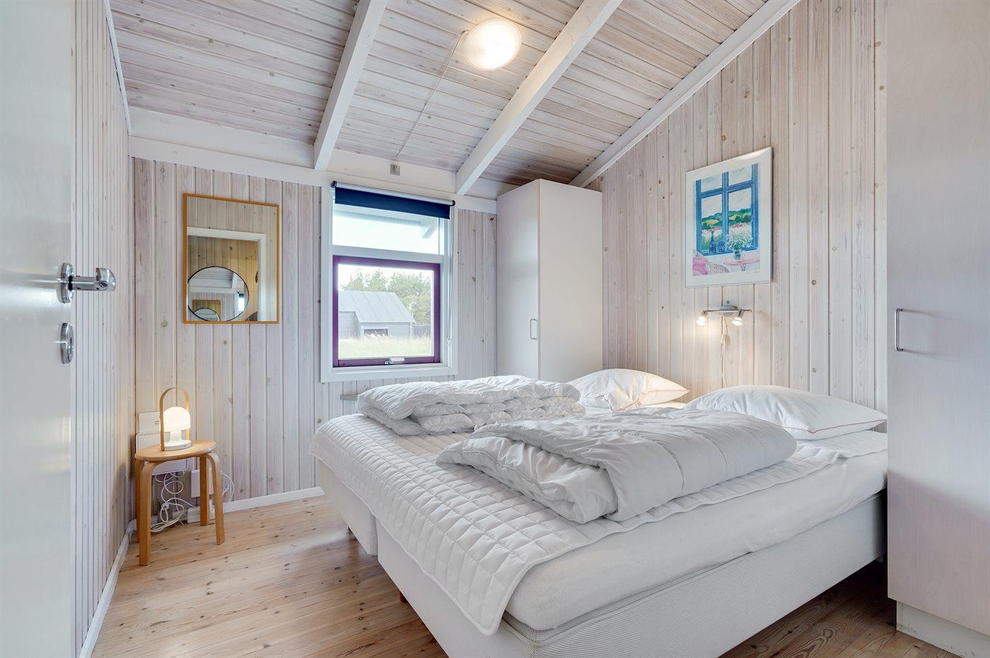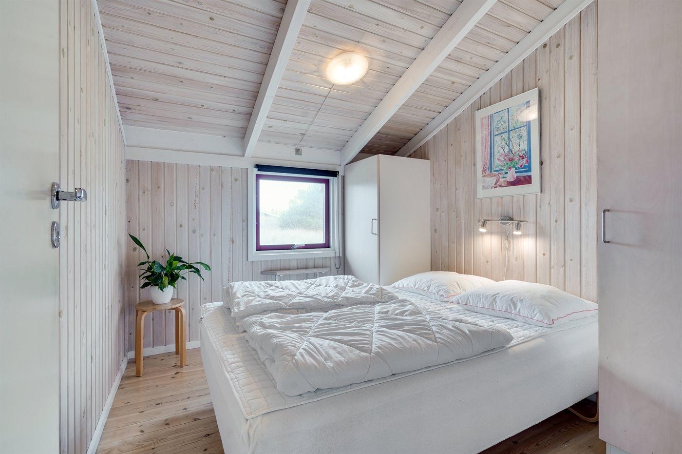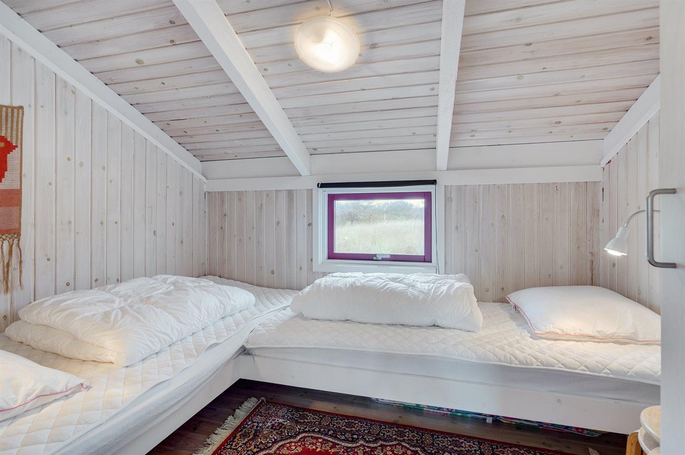 Der er i alt 4 soveværelser. Sovepladserne fordeler sig på: 4 sovepladser i dobbeltsenge. 2 sovepladser i enkeltsenge. 2 sovepladser i køjeseng. Derudover er der 1 stk. barneseng.