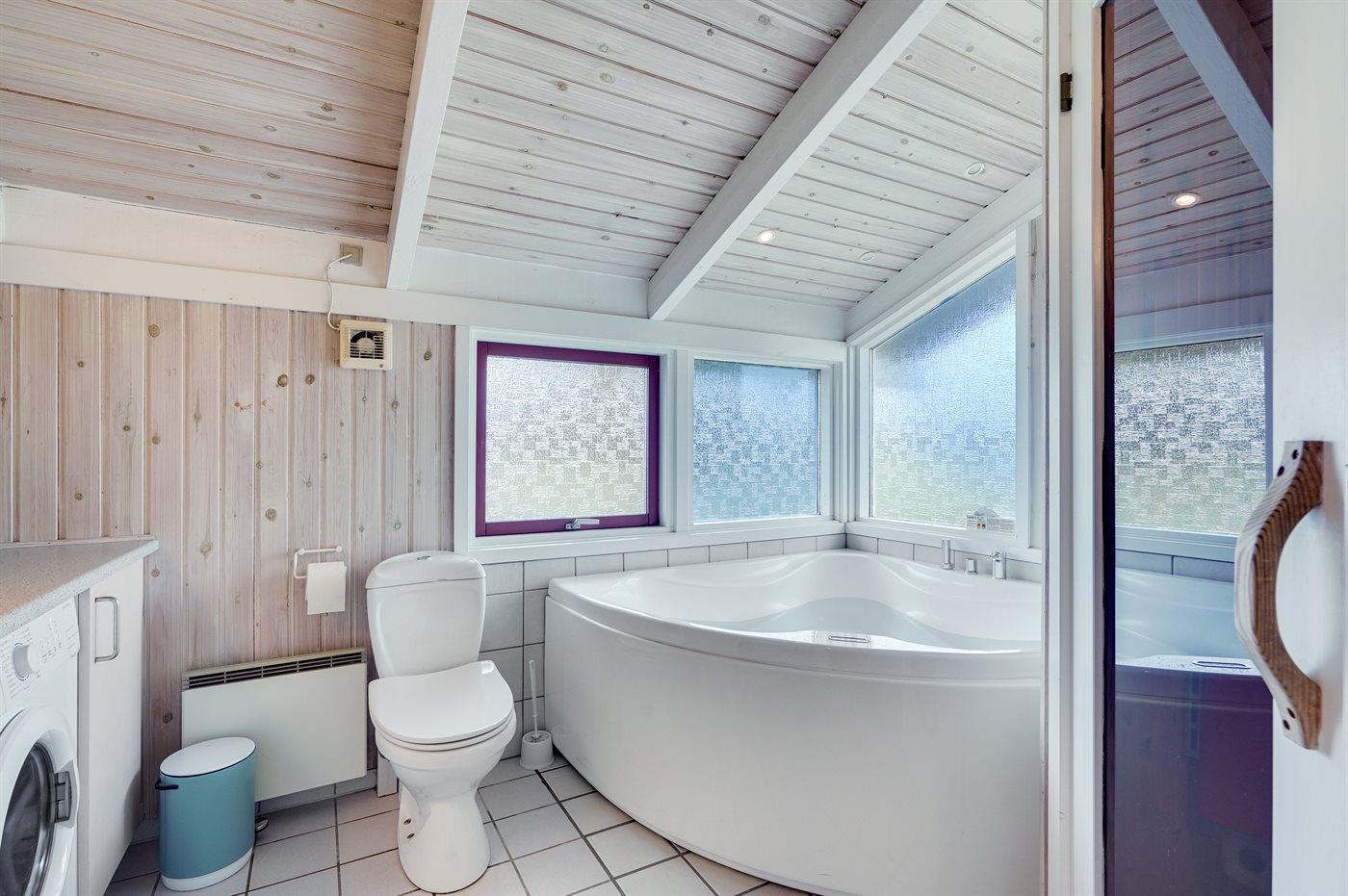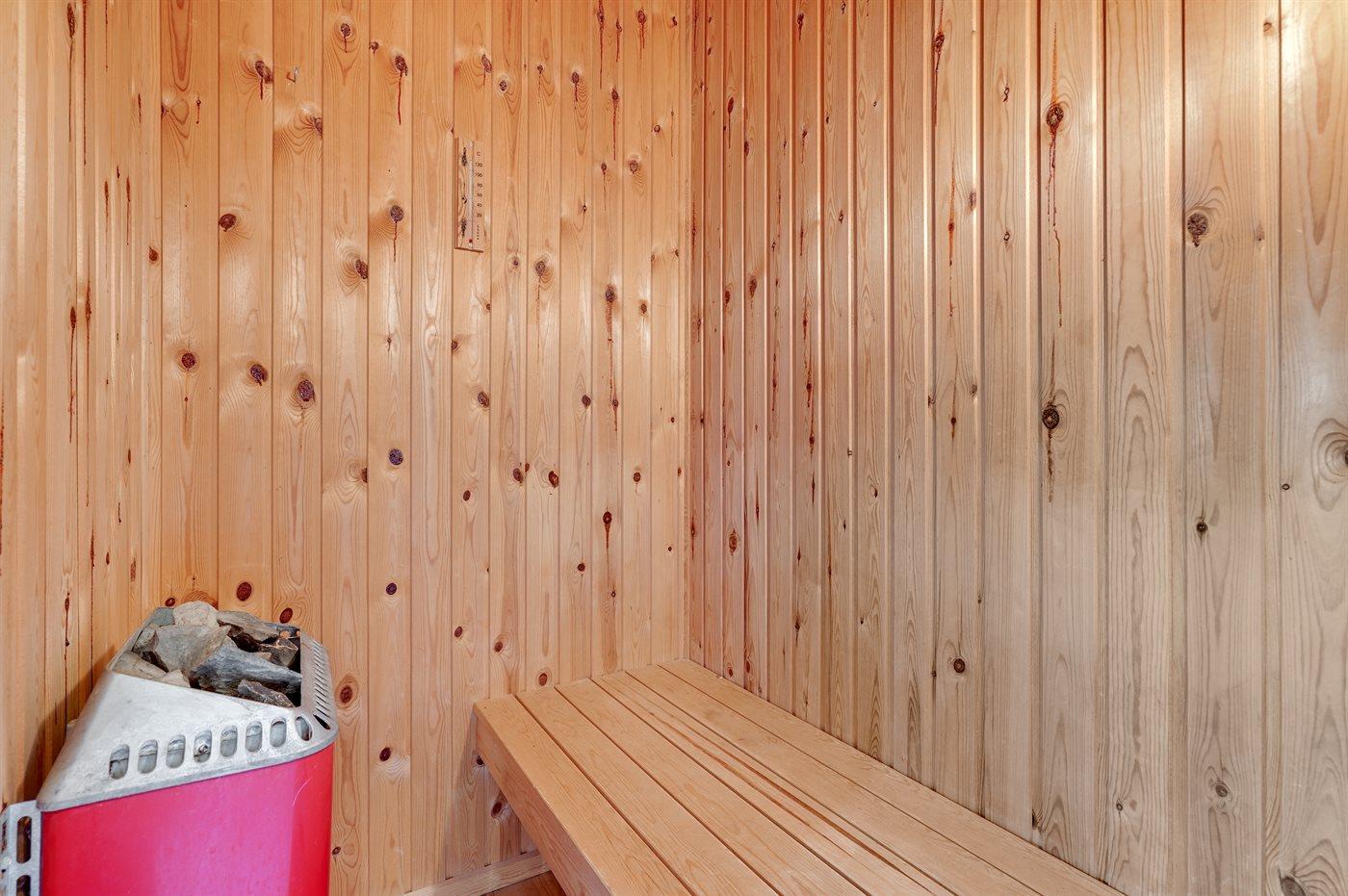 Der er 2 badeværelser med bruseniche og 2 toiletter. Der er gulvvarme på 1 badeværelse. I saunaen er der mulighed for afslapning.