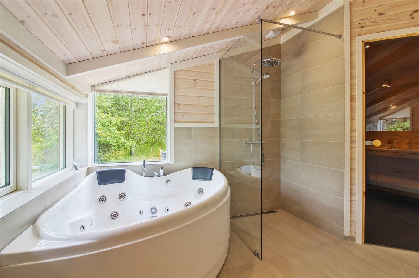 Der er 2 badeværelser med bruseniche og 2 toiletter. Der er gulvvarme på 2 badeværelser. I saunaen er der mulighed for afslapning.