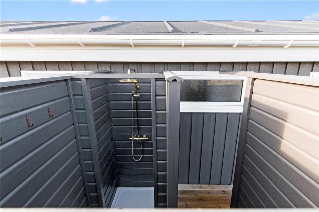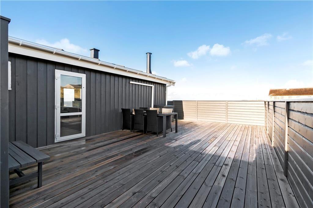 Fra stuen har I direkte adgang til en stor og åben terrasse, og her er panoramavuet over Vesterhavet mindst lige så strålende. En mindre del af terrassen er overdækket, og derudover er der et større overdækket terrasseområde på den anden side af huset – og her sørger vinduer for, at I ikke går glip af havudsigten. Et afskærmet terrasseområde byder for øvrigt på en udendørs bruser, så når I vender hjem fra badeturen, kan I nemt skylle sand og saltvand af, inden I slænger jer i liggestolene.