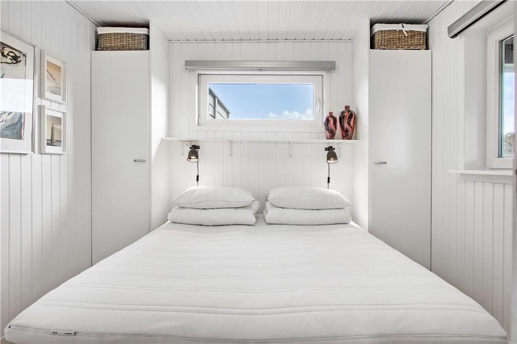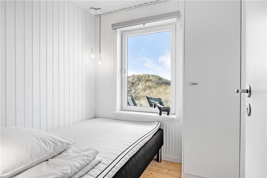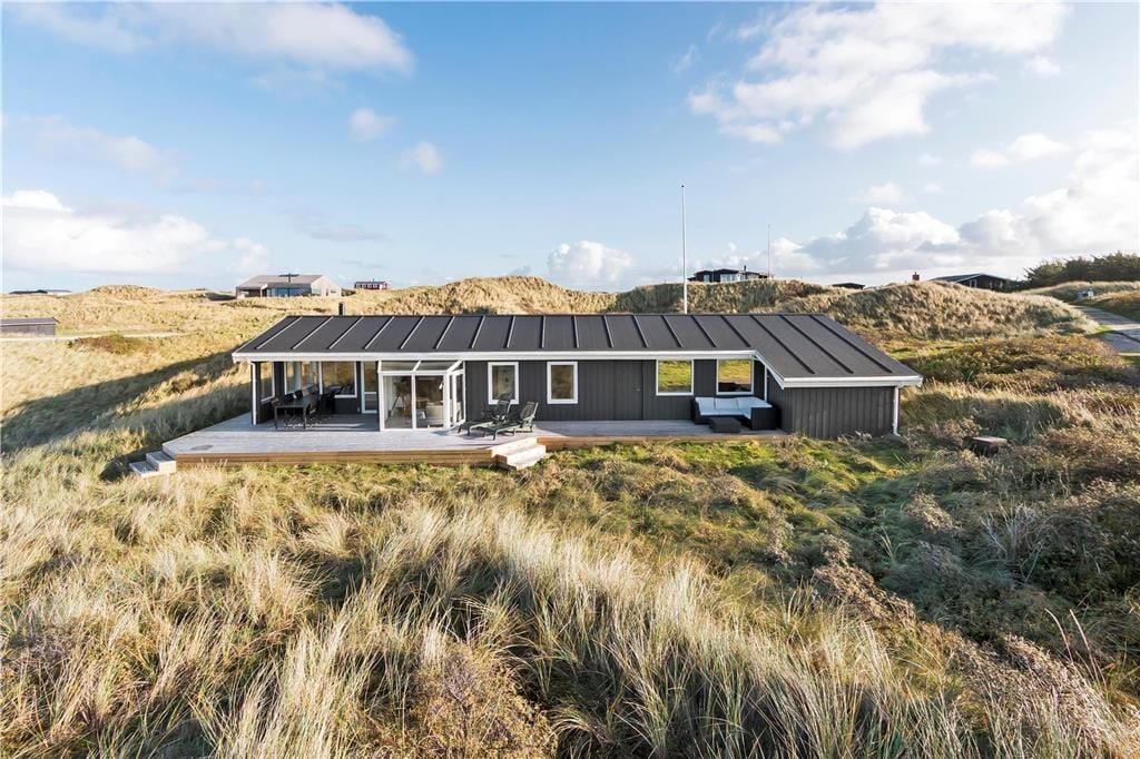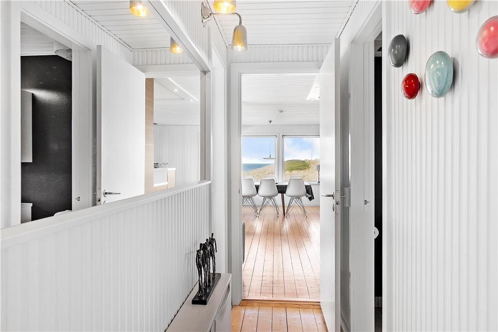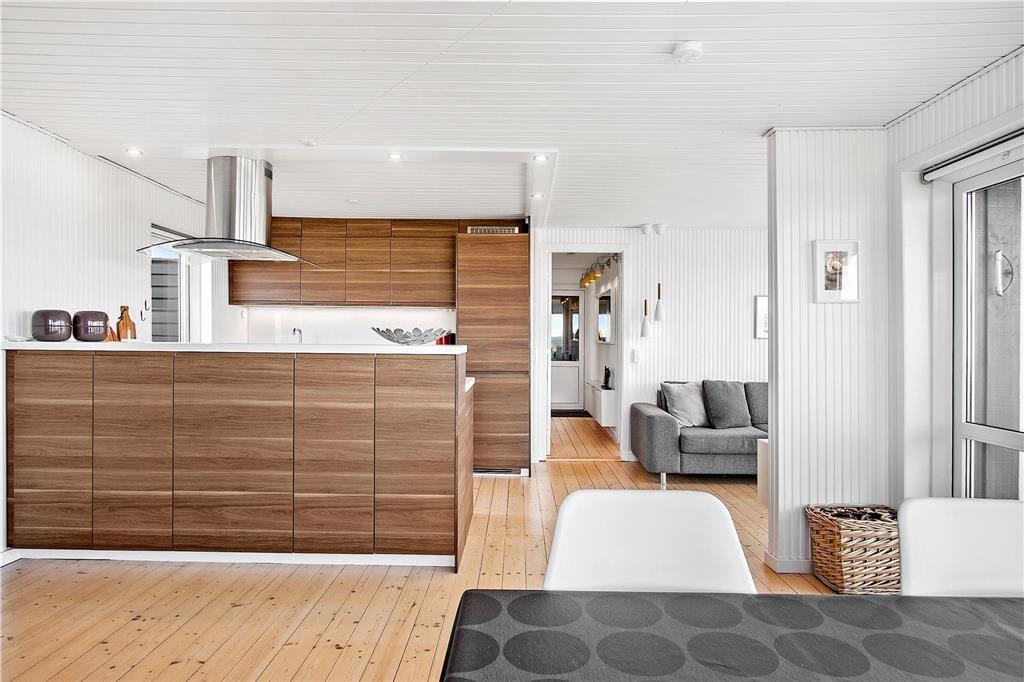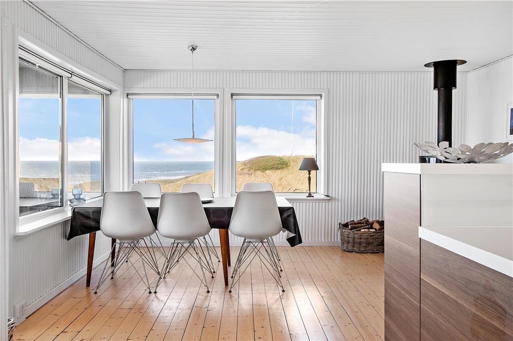 Sommerhuset er et klassisk træhus fra 1970, der er blevet renoveret i 2020. Blandt andet det flotte, åbne køkken er et tydeligt tegn på den vellykkede modernisering, som går godt i spænd med den øvrige enkle og hyggelige indretning. I stuen er der lænestole nær brændeovnen, spiseplads og sofaafdeling – og uanset hvor I slår jer ned, sørger de store vinduespartier for, at I har frit udsyn til Vesterhavet og den høje himmel. Planløsningen består desuden af et pænt badeværelse og tre soveværelser, der i alt kan huse fem personer.