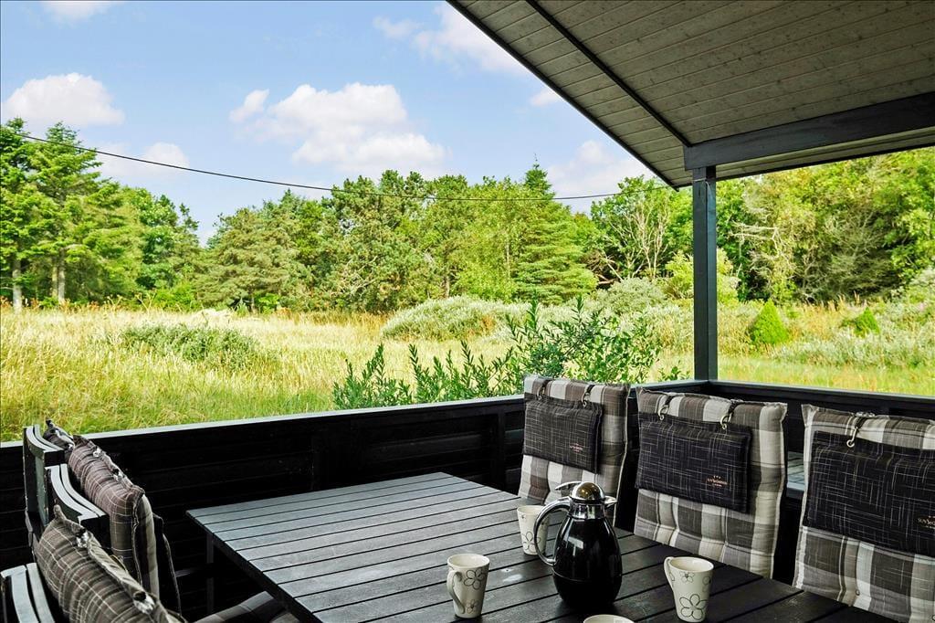 Takket være de mange havedøre er det nemt at træde ud i det fri for at nyde solskinnet. Rundt om huset er der flere terrasser, inklusiv en delvist overdækket og helt aflukket terrasse, hvor hundeejere kan lade de firbenede familiemedlemmer gå frit. Ude i det fri har I alt, hvad I skal bruge for at nyde livet i form af havemøbler, liggestole, parasol og grill, og der er også en udendørs bruser. Og så kommer middagsluren i øvrigt til at foregå i ugenerede omgivelser, for udelivet skærmes af bevoksningen på den store naturgrund.