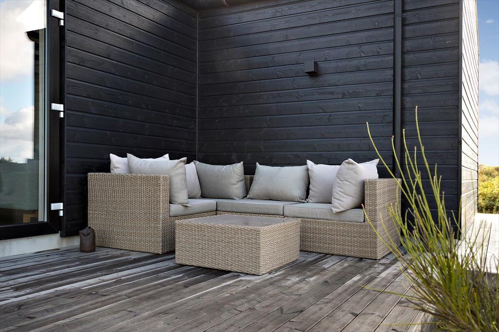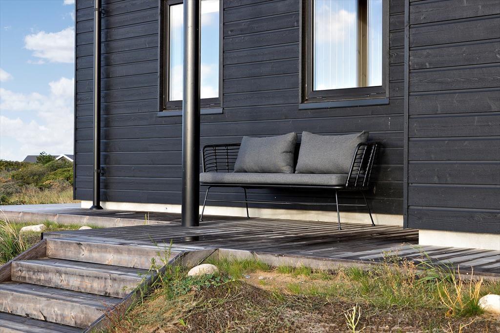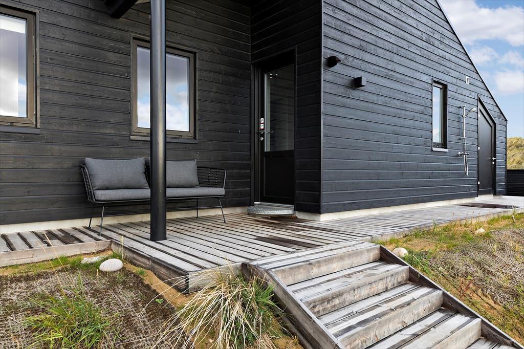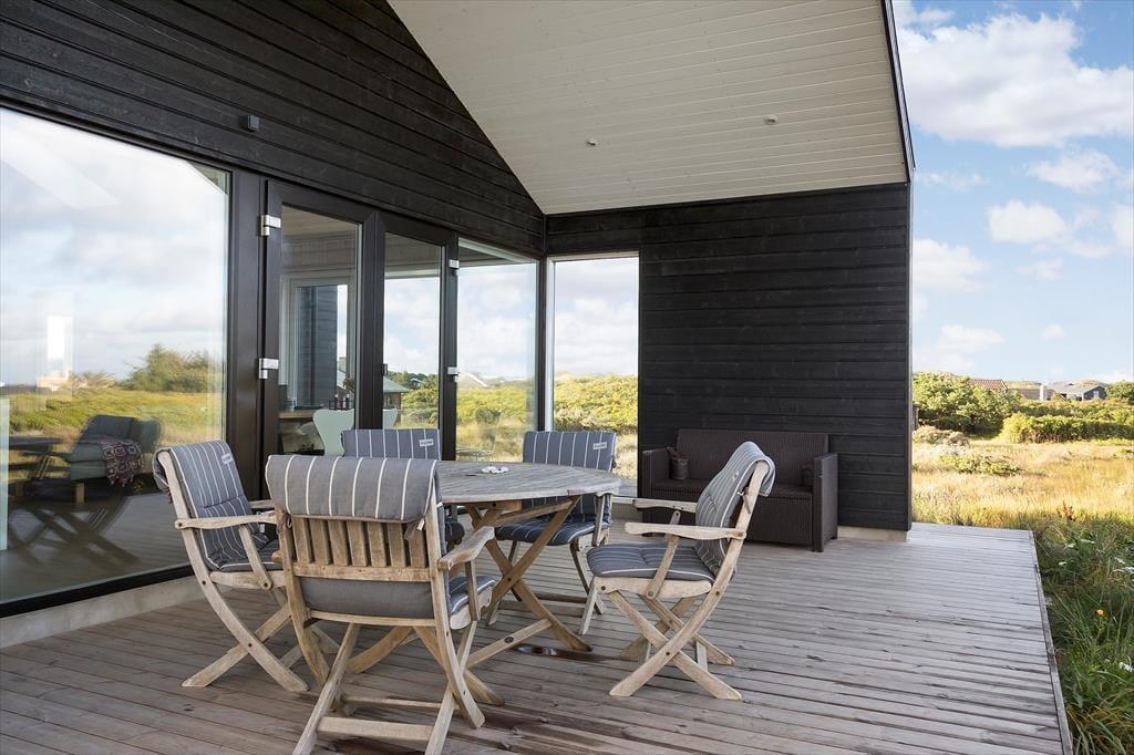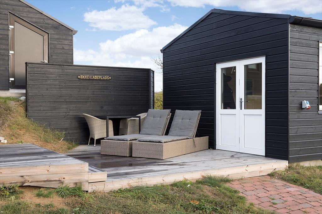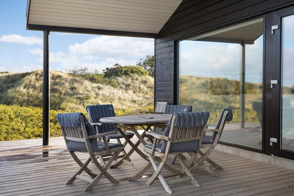 Både i forbindelse med sommerhuset og annekset er der anlagt smukke træterrasser, så I kan lade det være helt op til vindretningen og solforholdene, når I skal vælge en opholdsplads. Det delvist overdækkede terrassemiljø omkring sommerhuset ligger højst, så her er udsigten bedst, mens anneksets terrasse ligger mere afskærmet på naturgrunden. Havemøblerne matcher husets æstetik og komfortniveau, og som dejlige detaljer er der både en udebruser og ladestik til elbil ved huset.