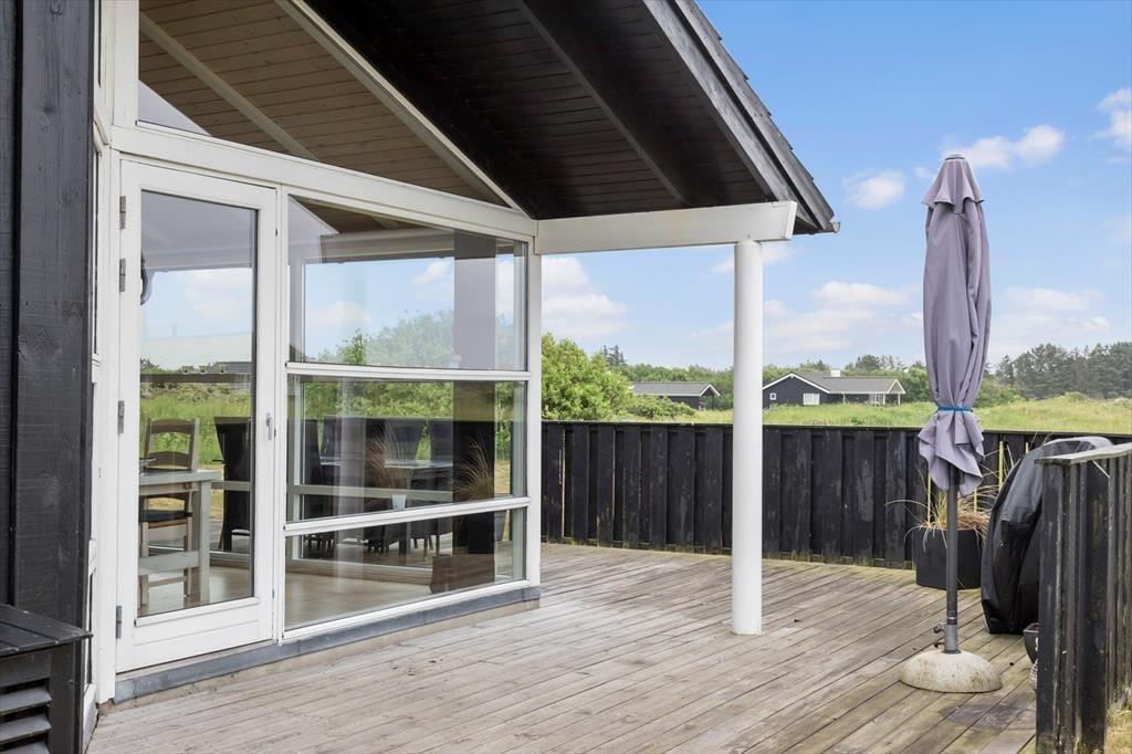 En stor træterrasse breder sig mod syd og vest, så det er nemt at finde en solrig opholdsplads en stor del af dagen. Vil I grille, er der mulighed for det, og hvis I slet ikke har lyst til at rykke indenfor, er det måske terrassen under halvtaget, der bliver jeres foretrukne sted at sidde om aftenen.