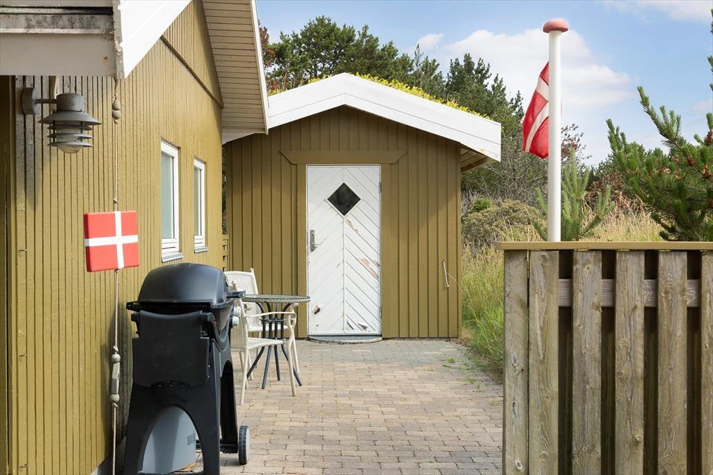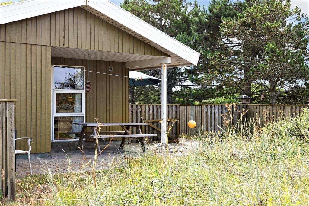 Et stort terrassemiljø breder sig rundt om sommerhuset, så der er gode chancer for at finde en plads i solen både morgen, middag og aften. Terrassen er delvist afskærmet af hegn, men I kan stadig nyde synet af den store naturgrund – og hvis I vil grille og rykke ind under overdækningen om aftenen, er der mulighed for det.