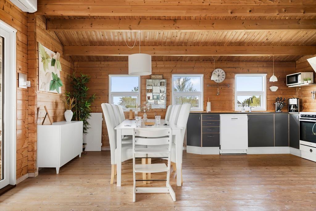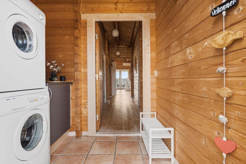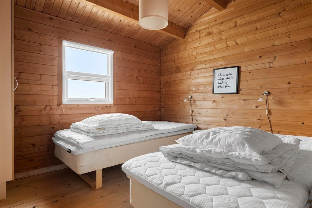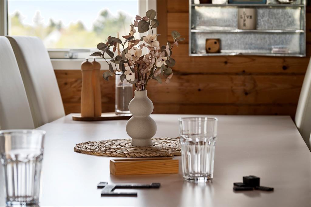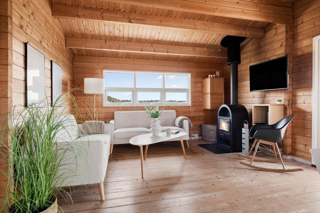 Indenfor byder sommerhuset på en varm og imødekommende atmosfære, hvor træbeklædte vægge og lofter skaber den autentiske sommerhusstemning, som mange drømmer om. Indretningen er både hyggelig og smagfuld, med velvalgte møbler og detaljer, der inviterer til ro og nærvær. Brændeovnen i stuen er husets naturlige samlingspunkt – her kan du læne dig tilbage med en god bog eller en kop varm kakao, mens flammerne knitrer og lyset danser på væggene. Stue og køkken er forbundet i et åbent rum, så du nemt kan holde samtalen i gang, mens du tilbereder dagens måltider. Når du trænger til lidt ekstra velvære, kan du glæde dig over det rummelige badeværelse, hvor et indendørs spabad venter på at forkæle både krop og sind – perfekt efter en lang gåtur ved havet eller på en kølig efterårsdag. Hele huset emmer af en afslappet, hjemlig charme, som gør det nemt at føle sig godt tilpas fra første øjeblik.