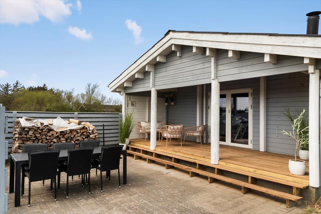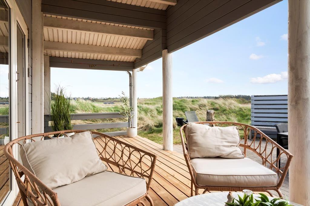 Udenfor venter en stor, overdækket træterrasse, som gør det muligt at nyde udelivet fra morgen til aften – uanset om solen skinner fra en skyfri himmel, eller en let sommerregn trækker ind over landskabet. De gode havemøbler inviterer til lange, dovne formiddage med morgenkaffen i hånden, og om aftenen er der rig mulighed for at samles omkring middagsbordet under åben himmel og lade måltidet strække sig i takt med solnedgangen. I de naturskønne omgivelser kan du høre fuglene synge og mærke den friske havluft, som Tornby er kendt for. Den store naturgrund omkring huset giver god plads til leg, afslapning og uforstyrret tid i det fri, og med det skiftende lys og årstidernes farvespil som bagtæppe er det svært ikke at falde helt til ro.
