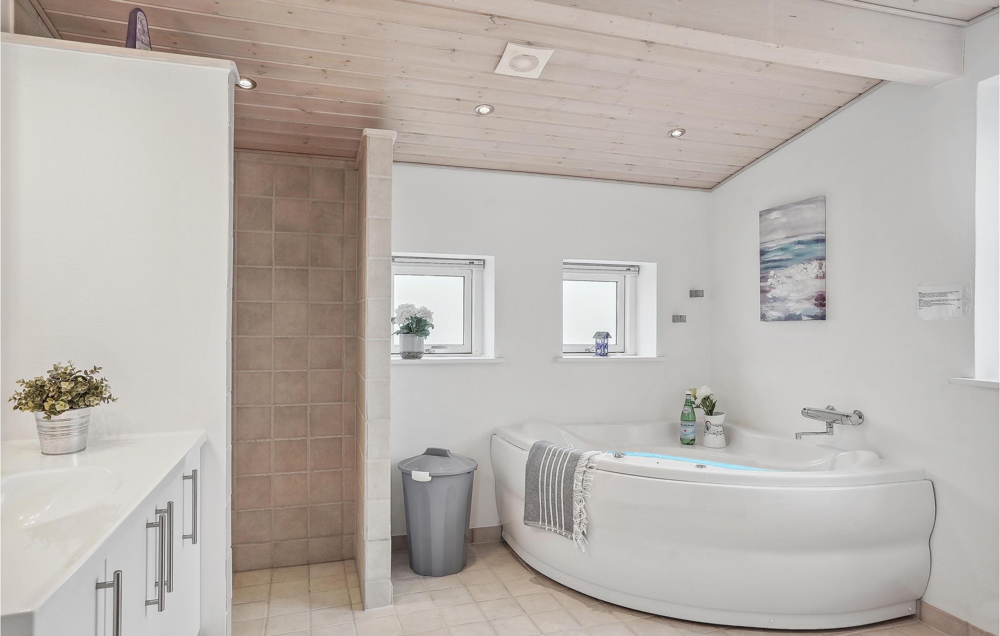 Syd for Hirtshals, tæt på Vesterhavet, ligger dette veludstyrede feriehus, som byder på en ekstra høj standard. Tilbring hyggelige timer i den rummelige stue med ovenlysvinduer, nyd lækre måltider, spil sjove brætspil eller læs en god bog nær brændeovnen. I aktivitetsrummet kan I udfordre hinanden i et spil bordfodbold, og efter en lang gåtur i den friske luft gør det godt med lidt wellness i boblebadet eller saunaen. De forskellige terrasser giver gode solforhold i løbet af dagen og mulighed for at slappe af i skyggen, mens de små slår sig løs i haven.