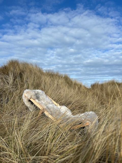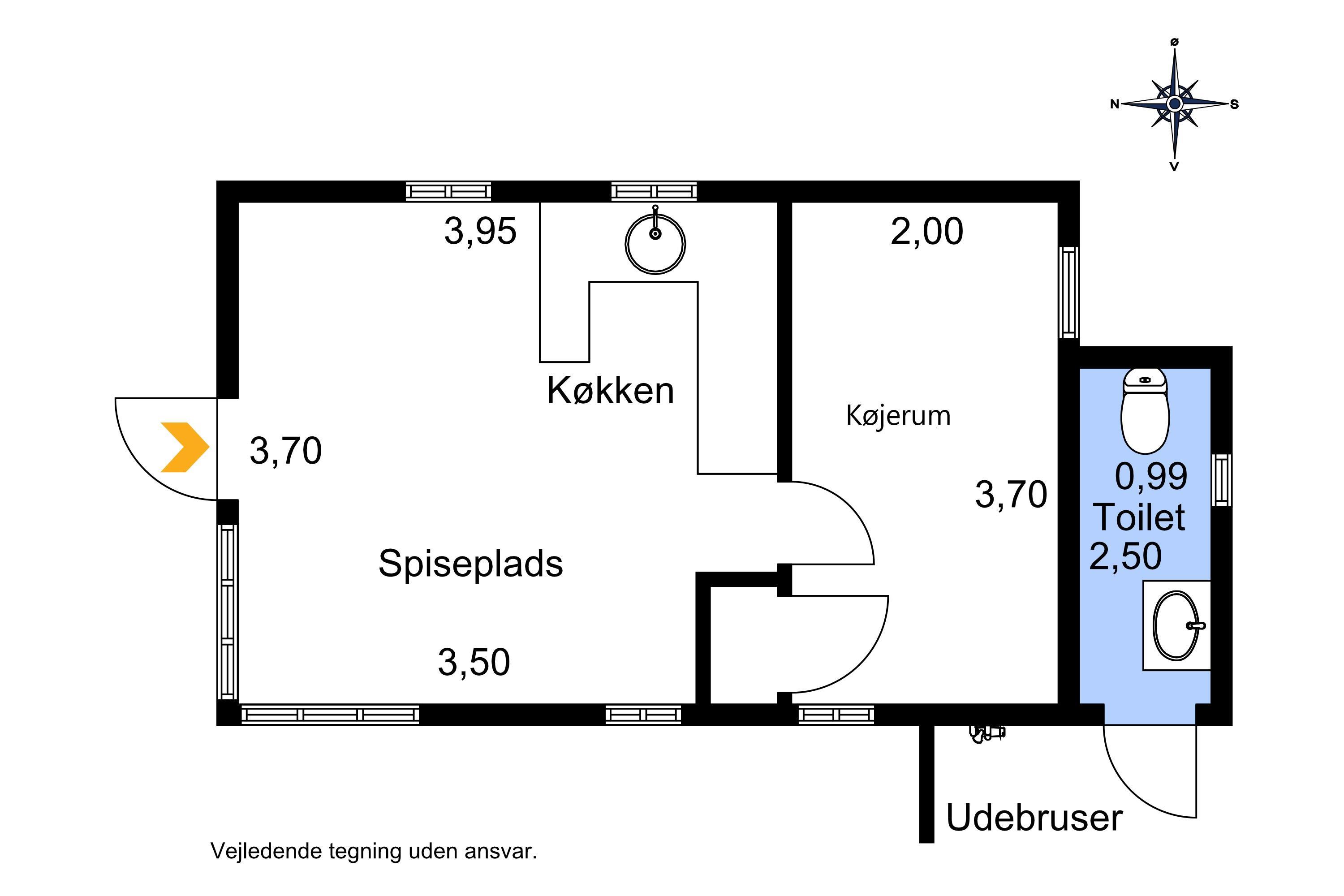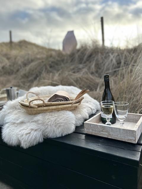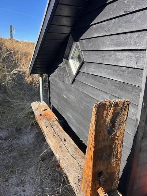 Det lille toilet med håndvask er bygget på bagsiden af feriehuset og kan kun tilgåes udefra. Bruseren er placeret udendørs, beskyttet mod indkig, så du kan nyde et varmt bad midt i klitterne med udsigt til naturens vidder.