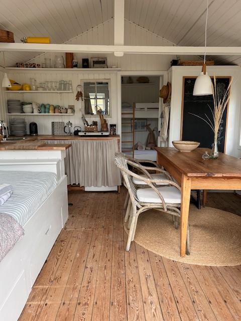 Indvendigt – enkelt og charmerende. Rylereden er indrettet med fokus på det enkle og smukke. Her er plads til op til 4 personer. Husets hjerte er det store spisebord i træ – et samlingspunkt for hyggelige måltider. Ved siden af står en hyggelig daybed, der fungerer både som sofa og seng til to. I et mindre værelse findes to køjesenge samt et praktisk, indbygget skab.