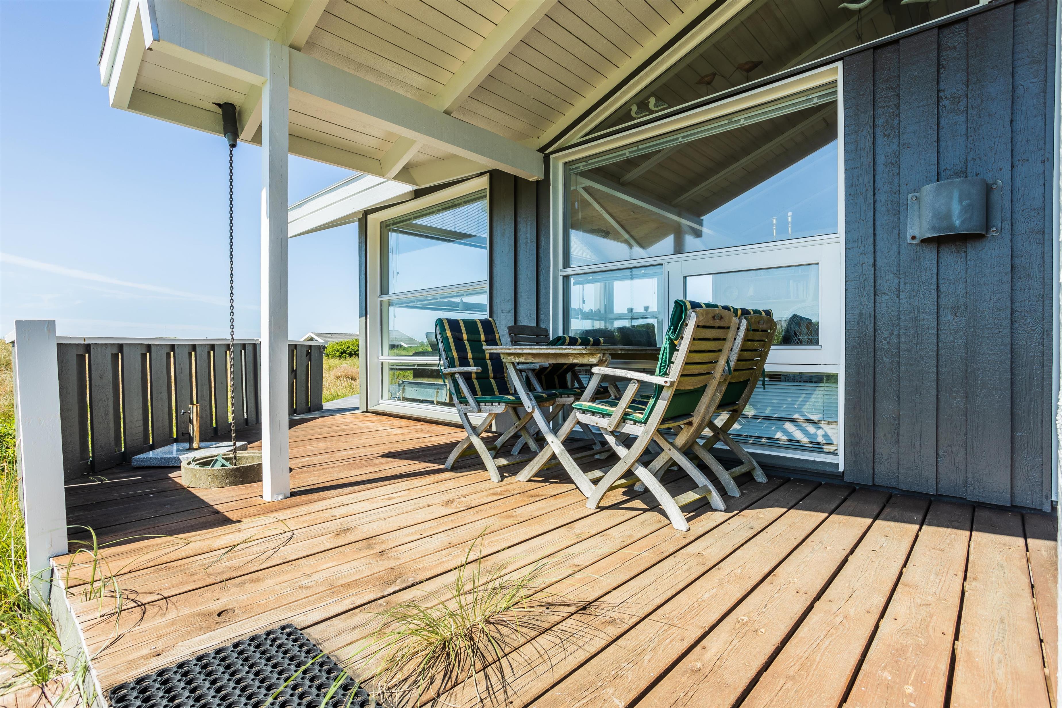 Udendørs venter flere hyggelige træterrasser, hvor I kan følge solens gang hele dagen. Slap af på den overdækkede terrasse med en god bog, eller nyd hyggelige grillaftener i solnedgangens skær. De grønne omgivelser og nærheden til naturen gør det nemt at koble af og nyde feriestemningen.