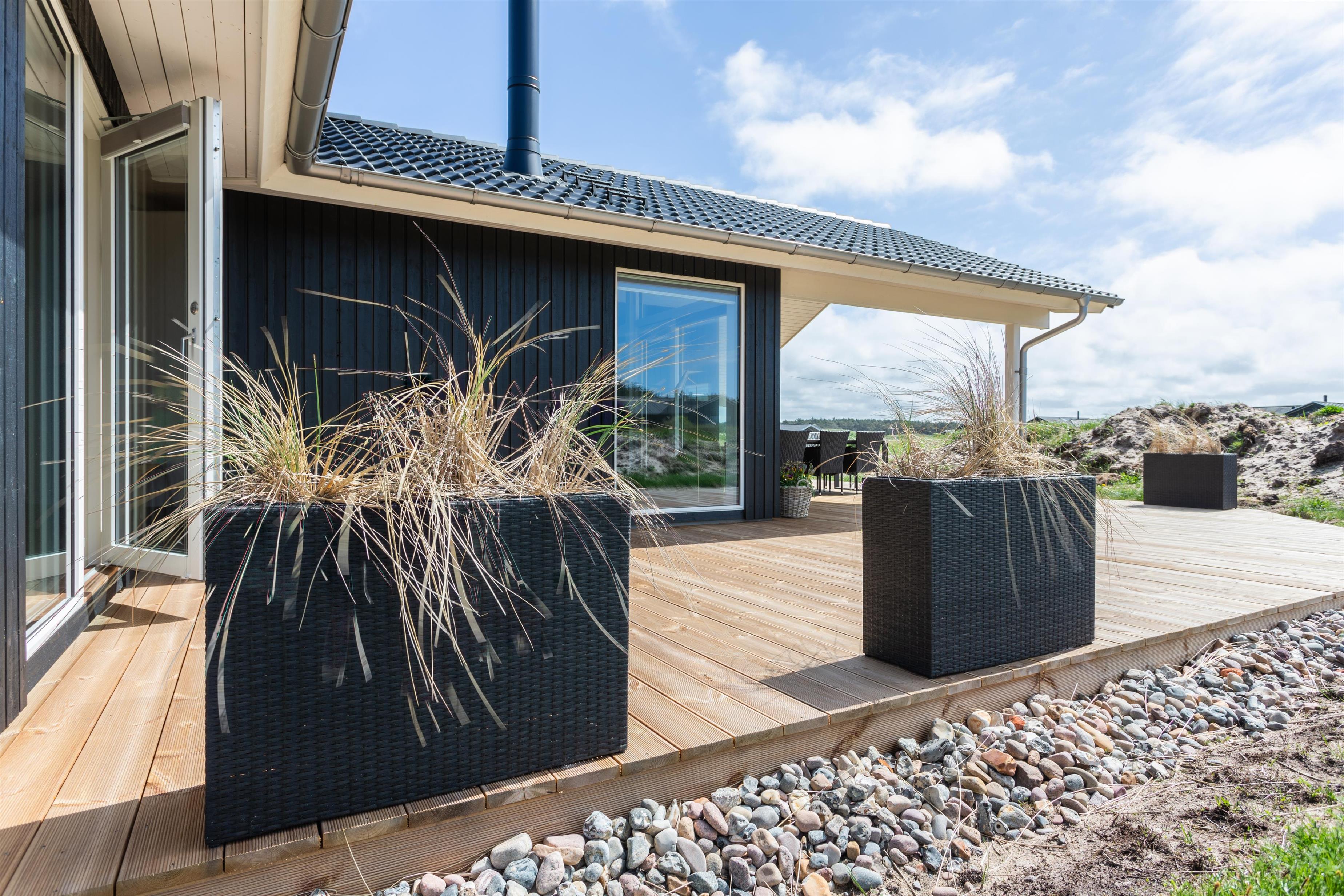 Feriehuset byder på et imponerende, delvist overdækket terrassemiljø med hyggelige lækroge, hvor I kan slappe af og nyde den friske duft af Vestkysten og de smukke omgivelser. Efter en tur til stranden kan I samle familien til hyggelige stunder på den store, sydvendte terrasse, der er ideel til afslapning og sommerhushygge.