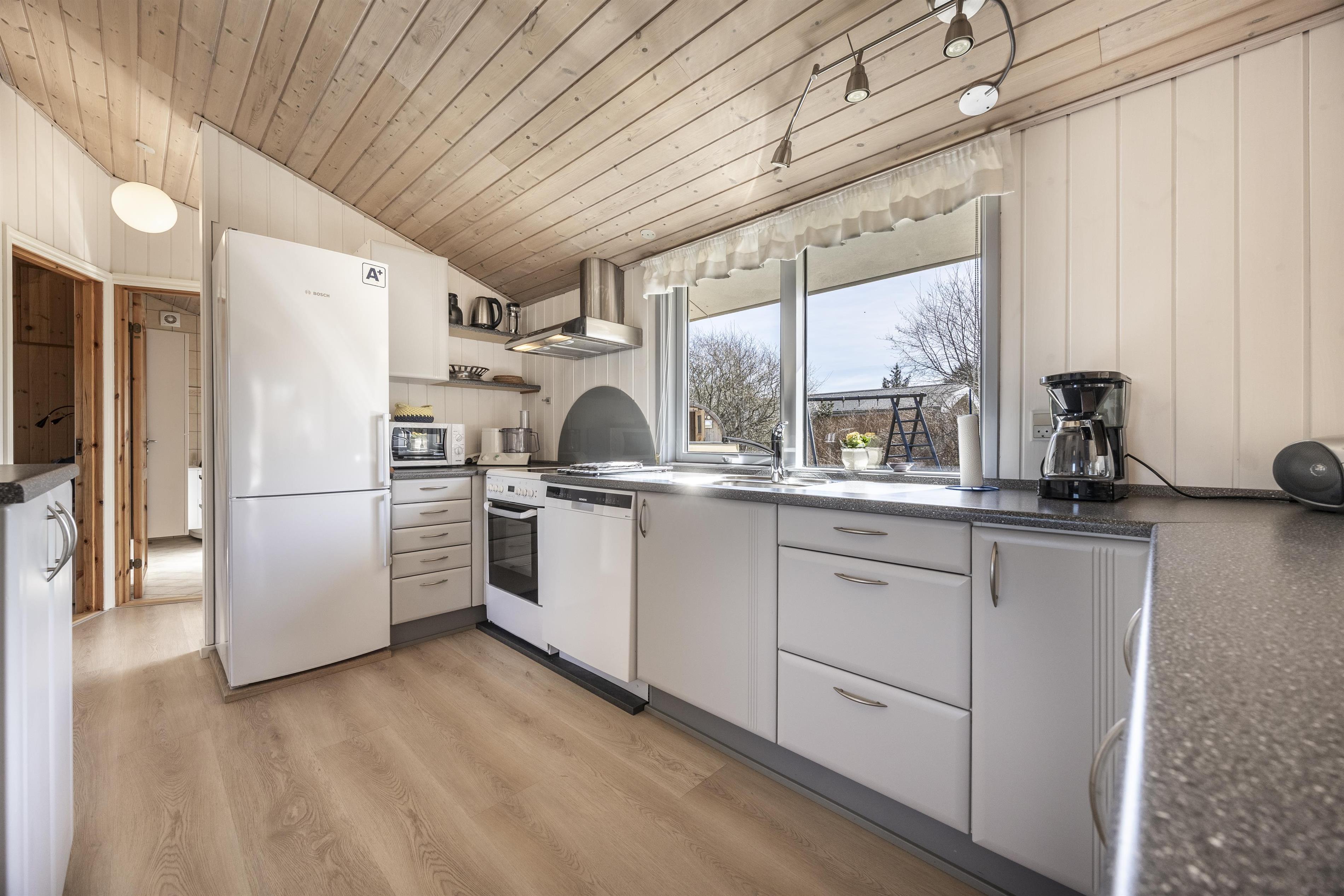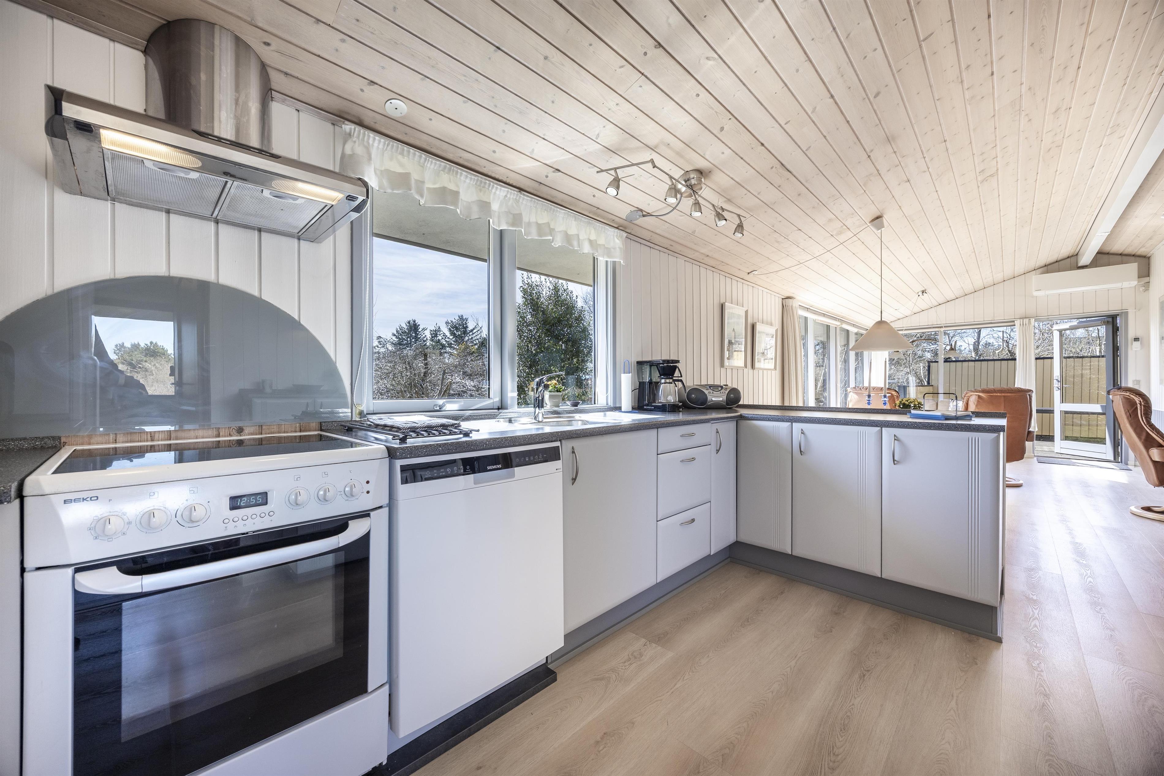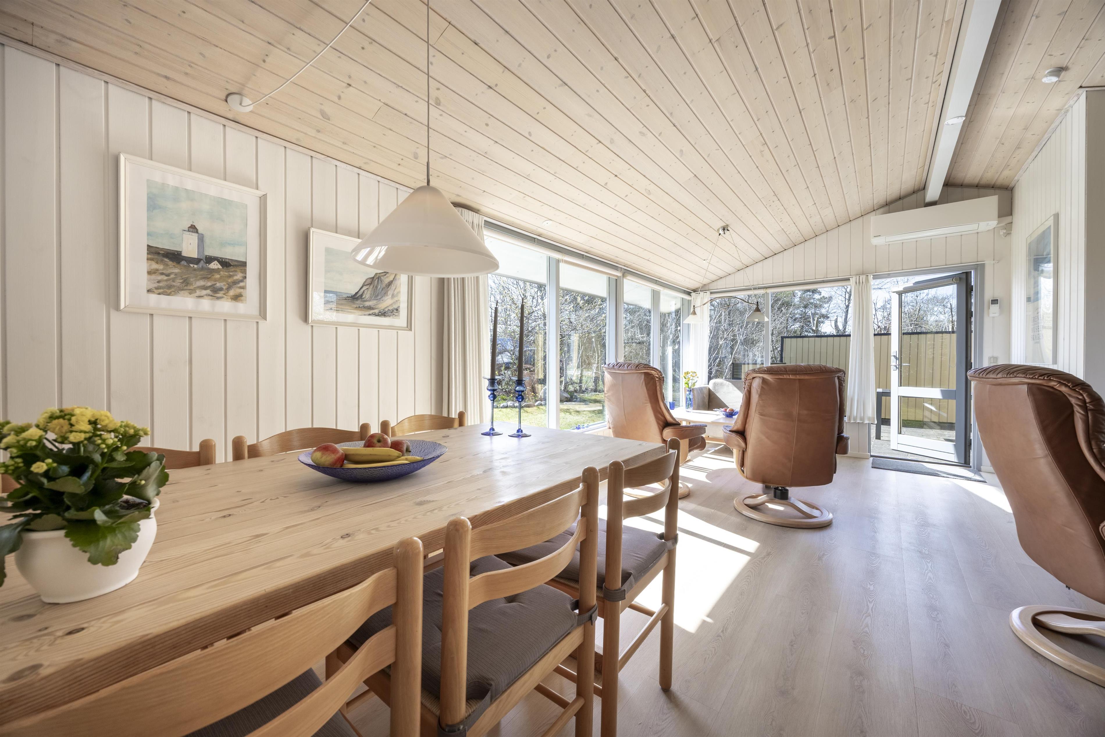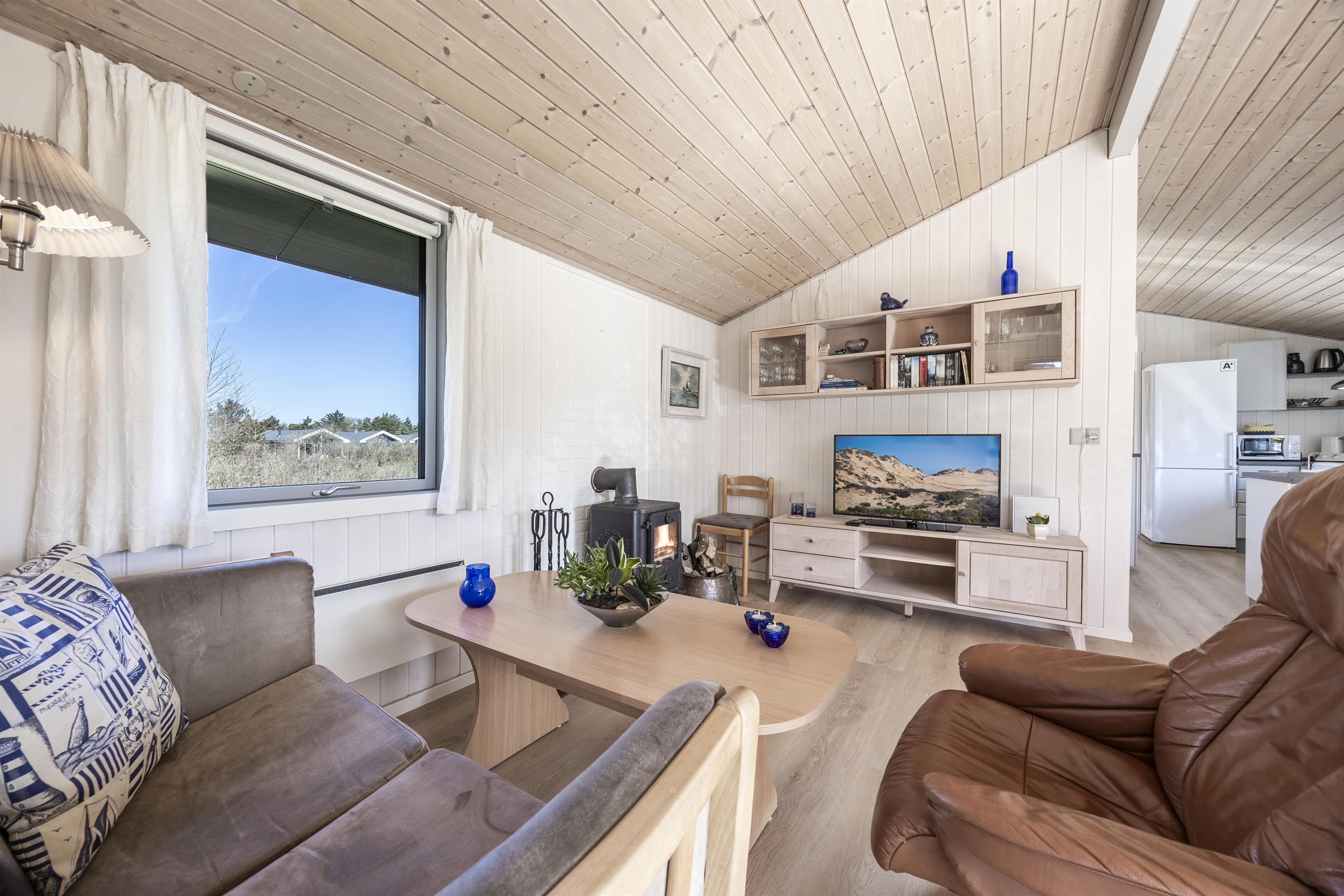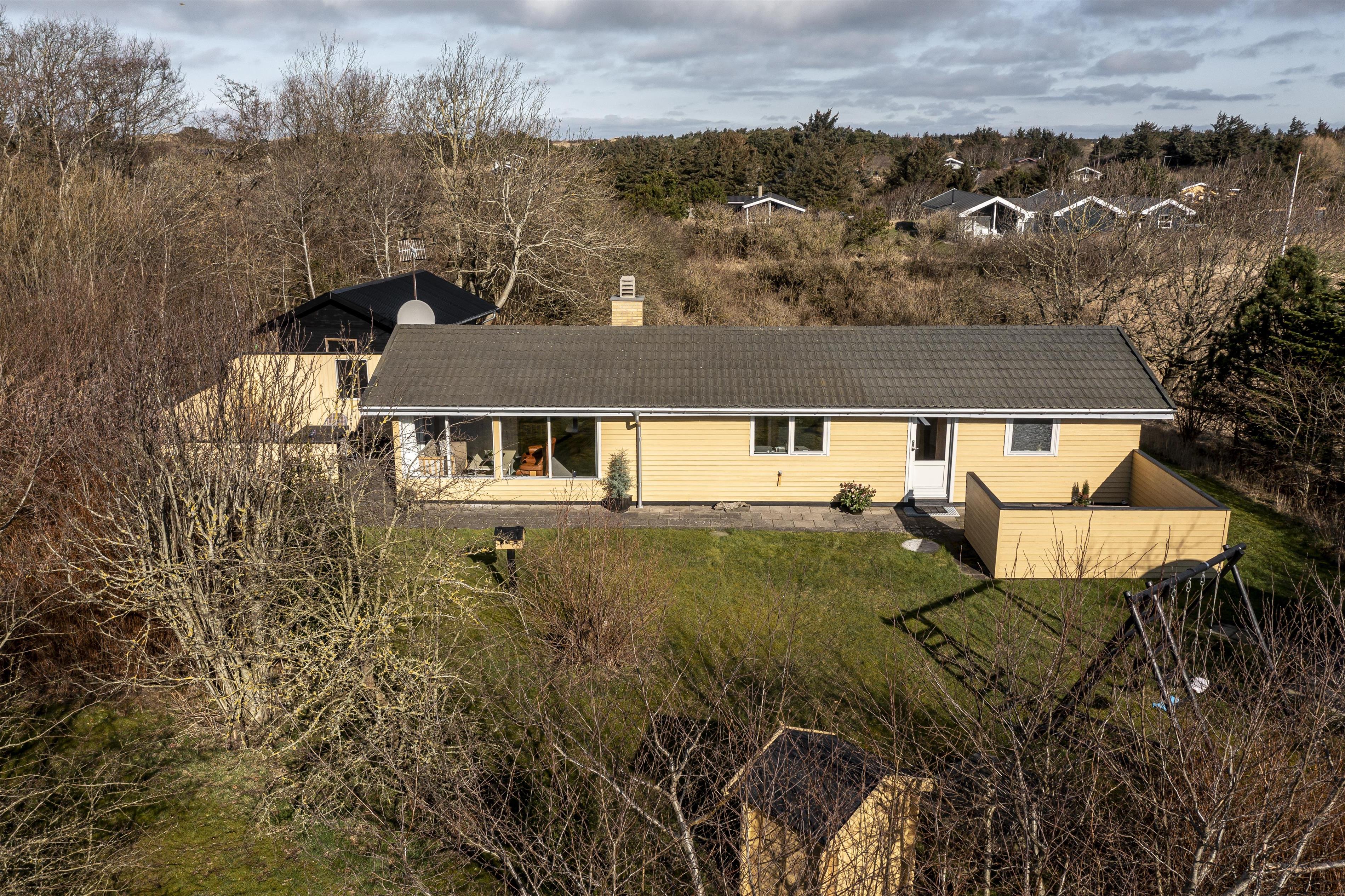 Feriehuset er beliggende i naturskønne og rolige omgivelser på en ugeneret naturgrund, og det er indrettet med fokus på komfort og funktionalitet. Den lyse opholdsstue ligger i åben forbindelse med et veludstyret køkken, hvilket skaber et hyggeligt samlingspunkt for familien. Stuen er udstyret med en brændeovn, som skaber varme og atmosfære på kølige aftener. I huset er der 3 gode soverum, så der er fin plads til hele familien.