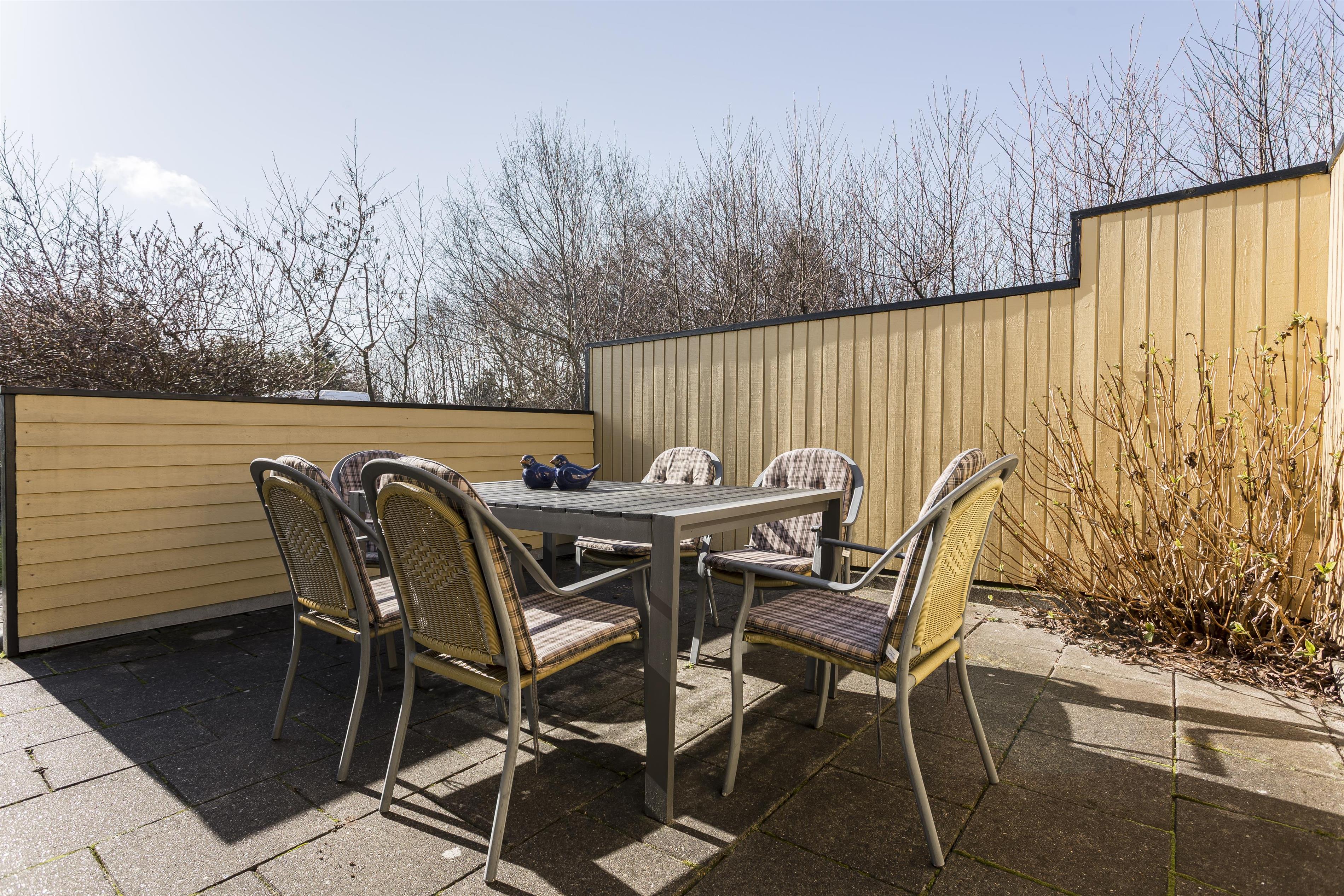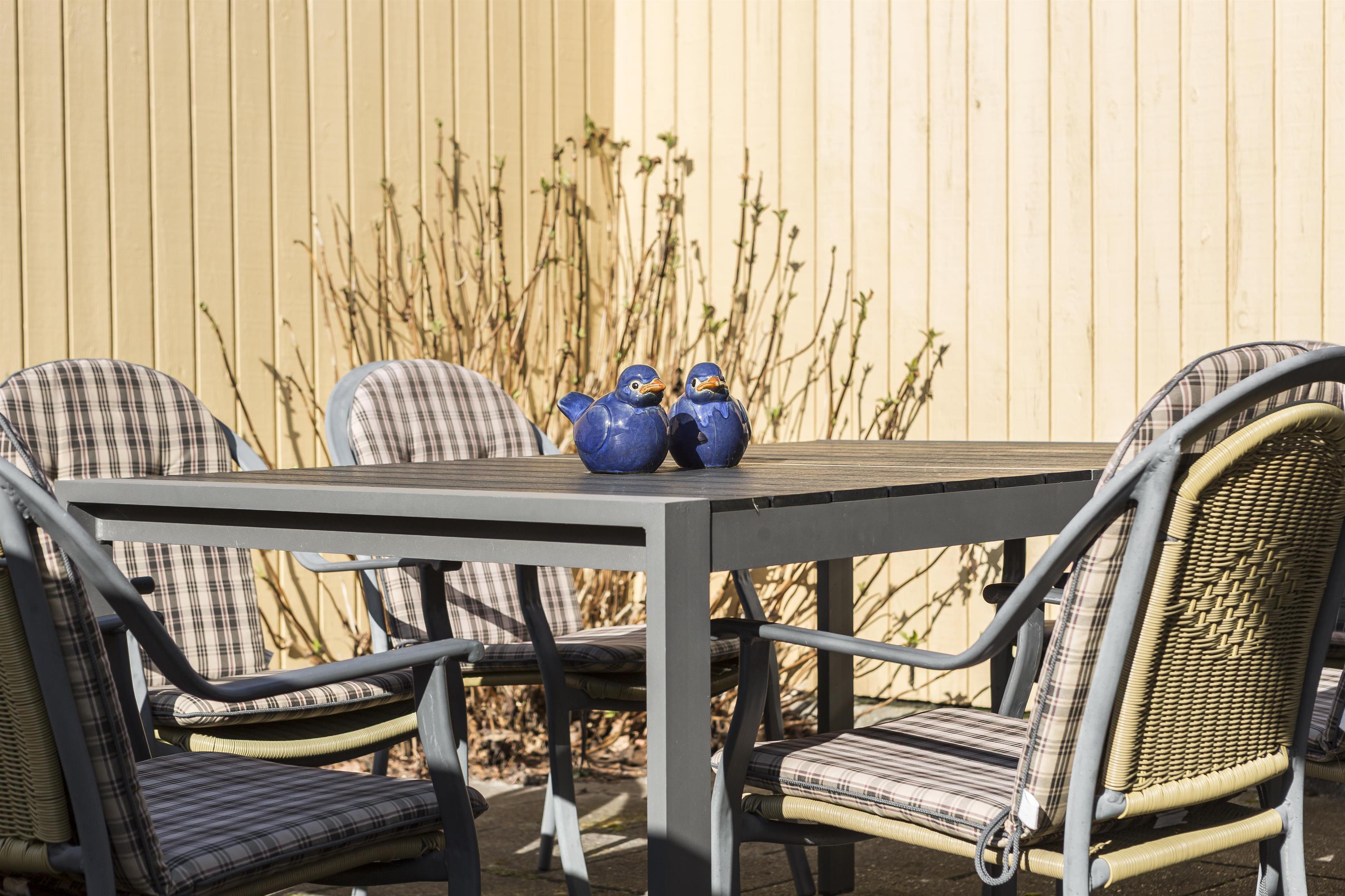 Udenfor byder huset på en stor terrasse med sol fra morgen til aften. Den åbne terrasse mod øst, syd og vest inviterer til afslappende timer, mens børnene kan boltre sig på den store plæne, gyngerne og i legehuset.