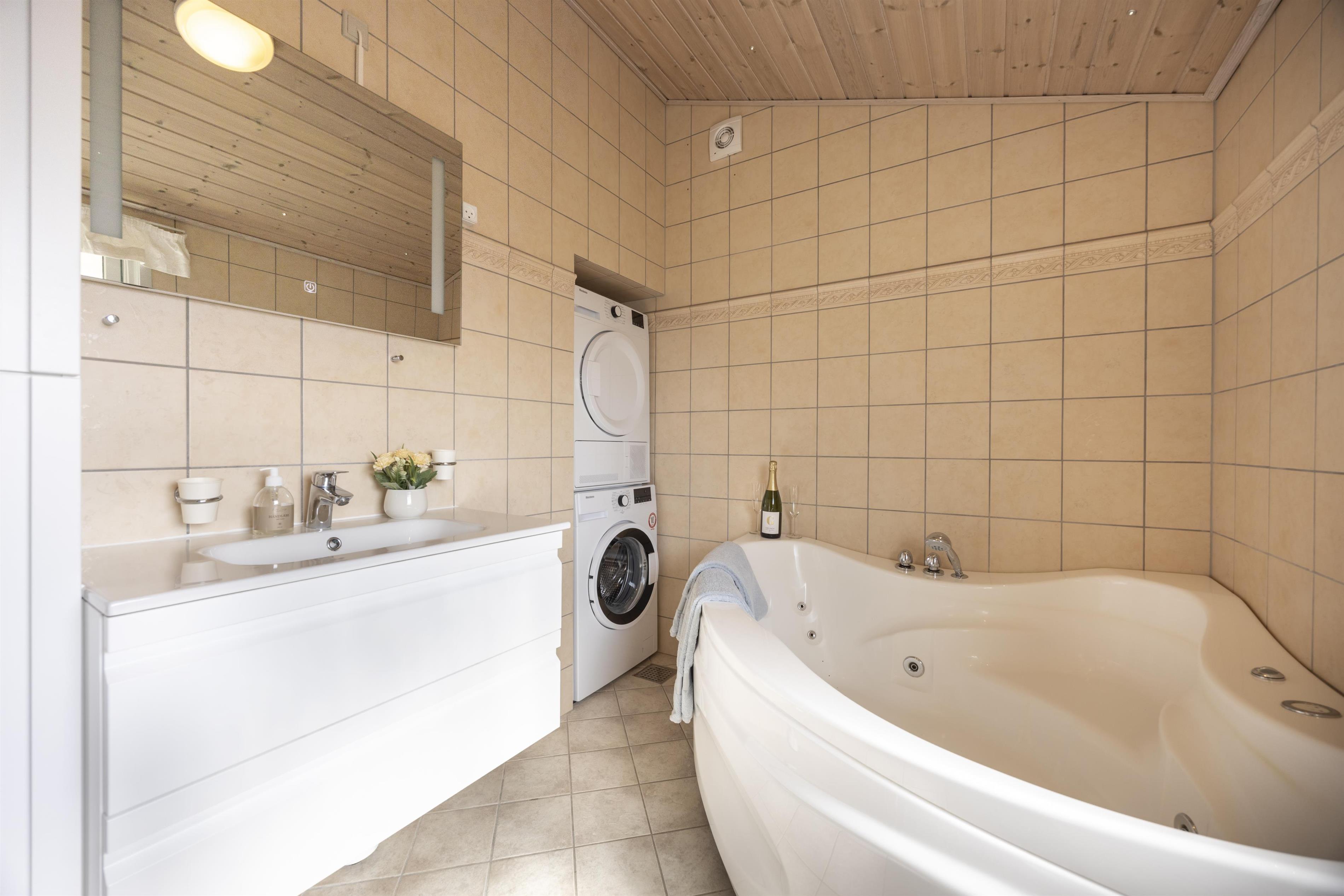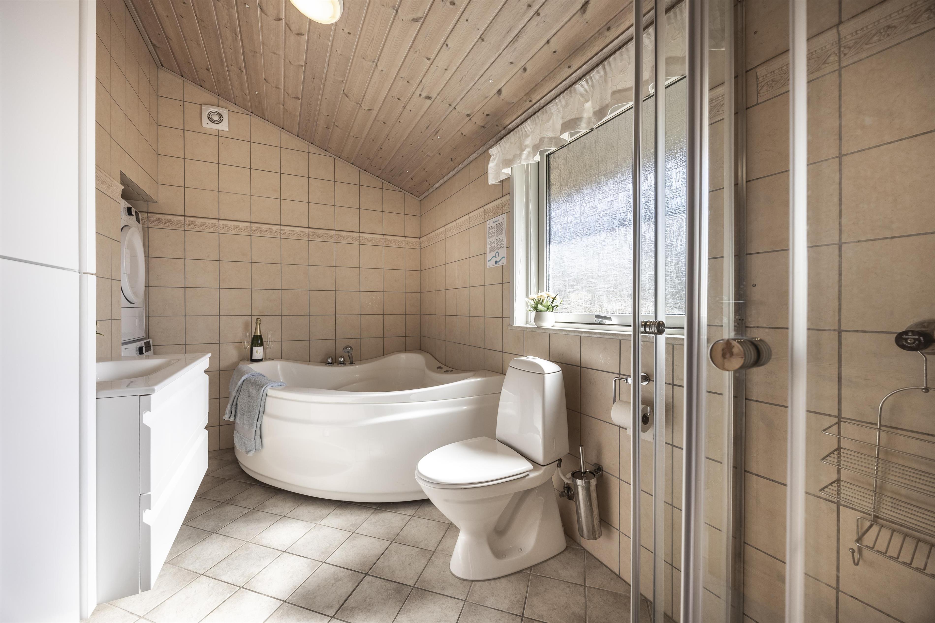 Badeværelset har gulvvarme og et indbydende spabad, hvor I kan nyde afslappende stunder efter en dag fyldt med oplevelser ved Vestkysten. Feriehuset er godt isoleret og kan opvarmes med både el og brændeovn, hvilket gør det ideelt til ferieophold året rundt.