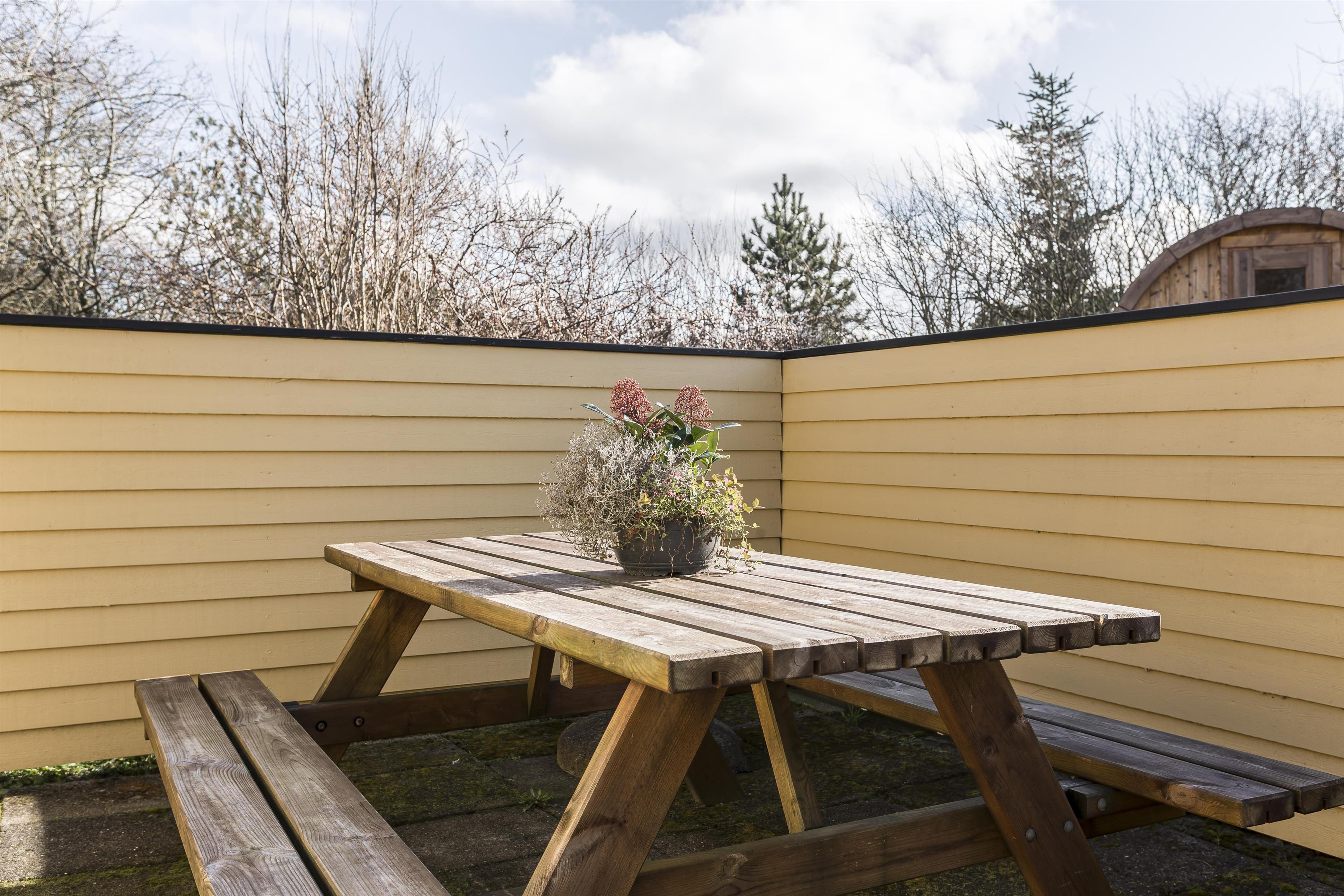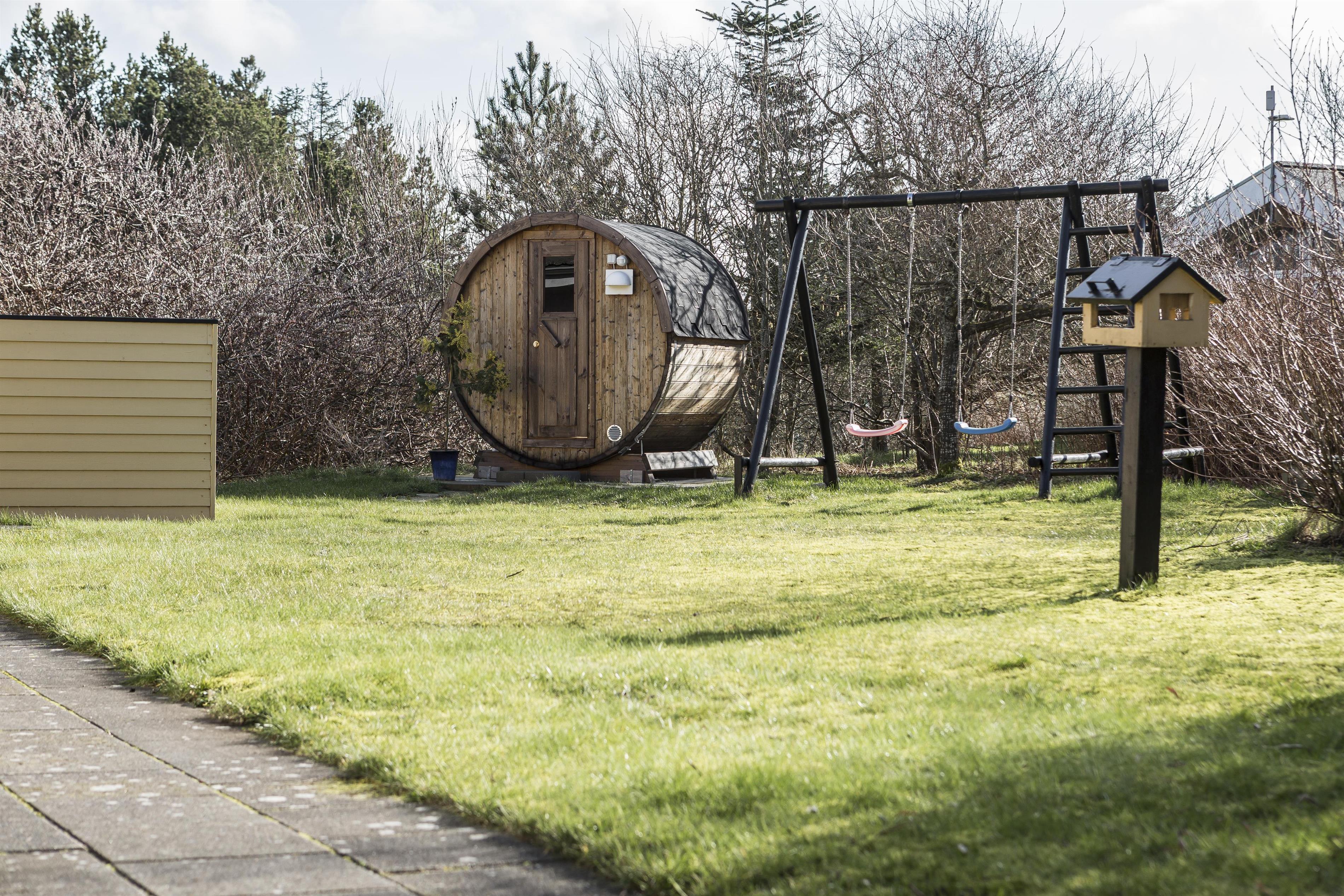 Den hyggelige saunahytte er perfekt til wellness-oplevelser lige udenfor døren. Der er også et praktisk stik til opladning af elbiler, så I kan holde bilen klar til eventyr.