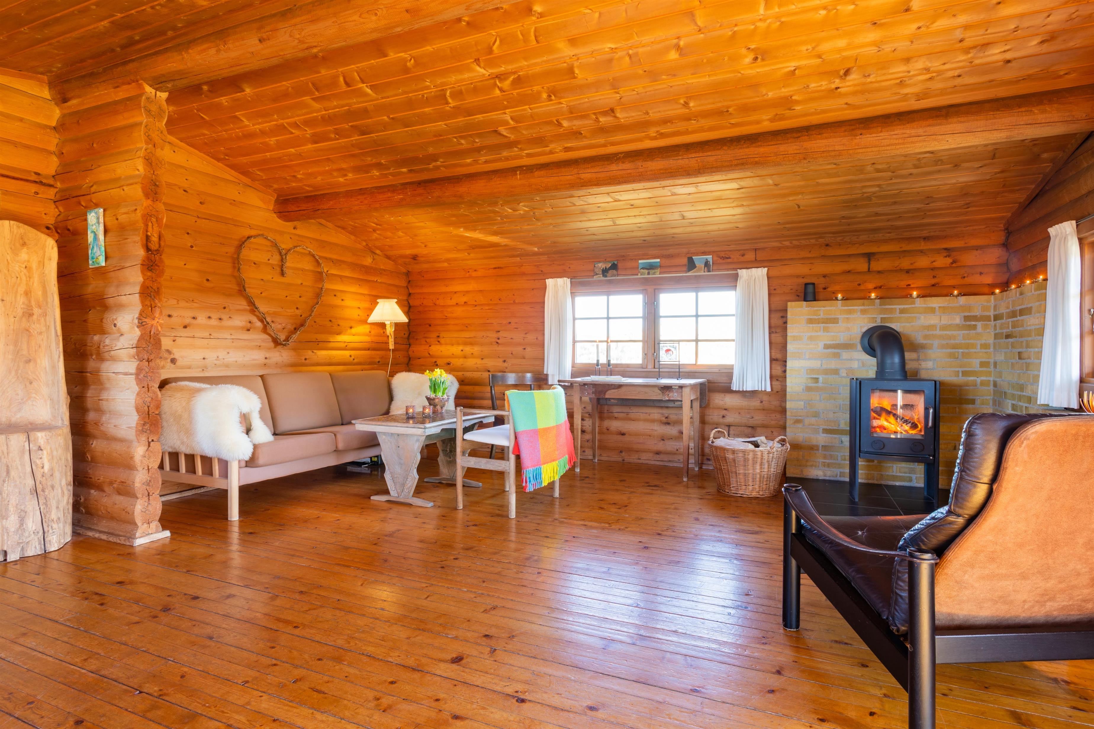 Sommerhusets køkken er kombineret med stue og spiseafdeling. Stuen er praktisk og moderne indrettet i en afslappet vestkyststil. Her er brændeovn, som giver en hyggelig stemning og en god varme til kølige dage. Huset råder desuden over to soveværelser og et badeværelse, hvilket gør de 68 kvadratmeter oplagt til en parferie eller til en familie med op til seks personer.