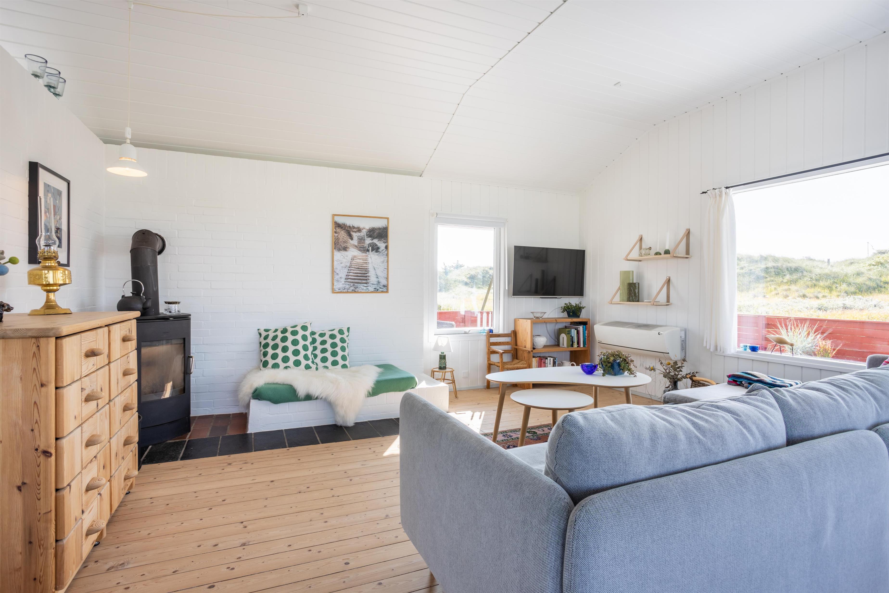 Brændeovnen spreder varme og hygge på kølige aftener, mens varmepumpen sikrer et behageligt indeklima året rundt. Der er to badeværelser med bruser, hvilket gør huset ideelt til både familier og venner, der rejser sammen. Desuden er der en praktisk udendørs bruser – perfekt efter en tur til stranden.